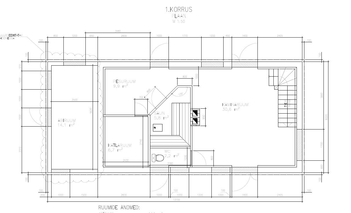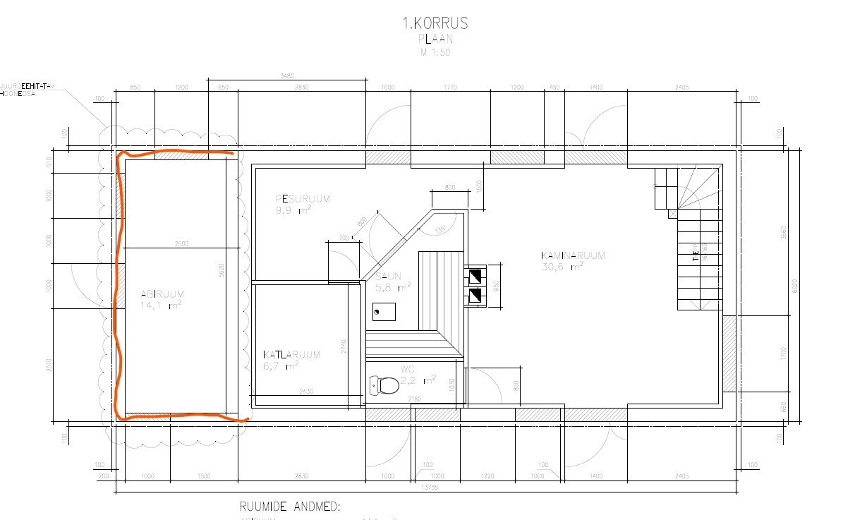 Soov oleks esimeses ehitusetapis kaevata ja valada vundament hoone pikendamiseks ( piltidel märgitud punasega). Lisaks oleks vaja teha siis juurdekaevatava vundamendi soojustus, kanalisatsioonilahendus ruumi sisepinda ja põranda valu koos põrandakütte torustikuga. Loomulikult tuleb teha kõik ehitusseadustikuga seotud vajalikud paberimajanduslikud toimingud ( ehituspäevik, kaetud aktid jne )
