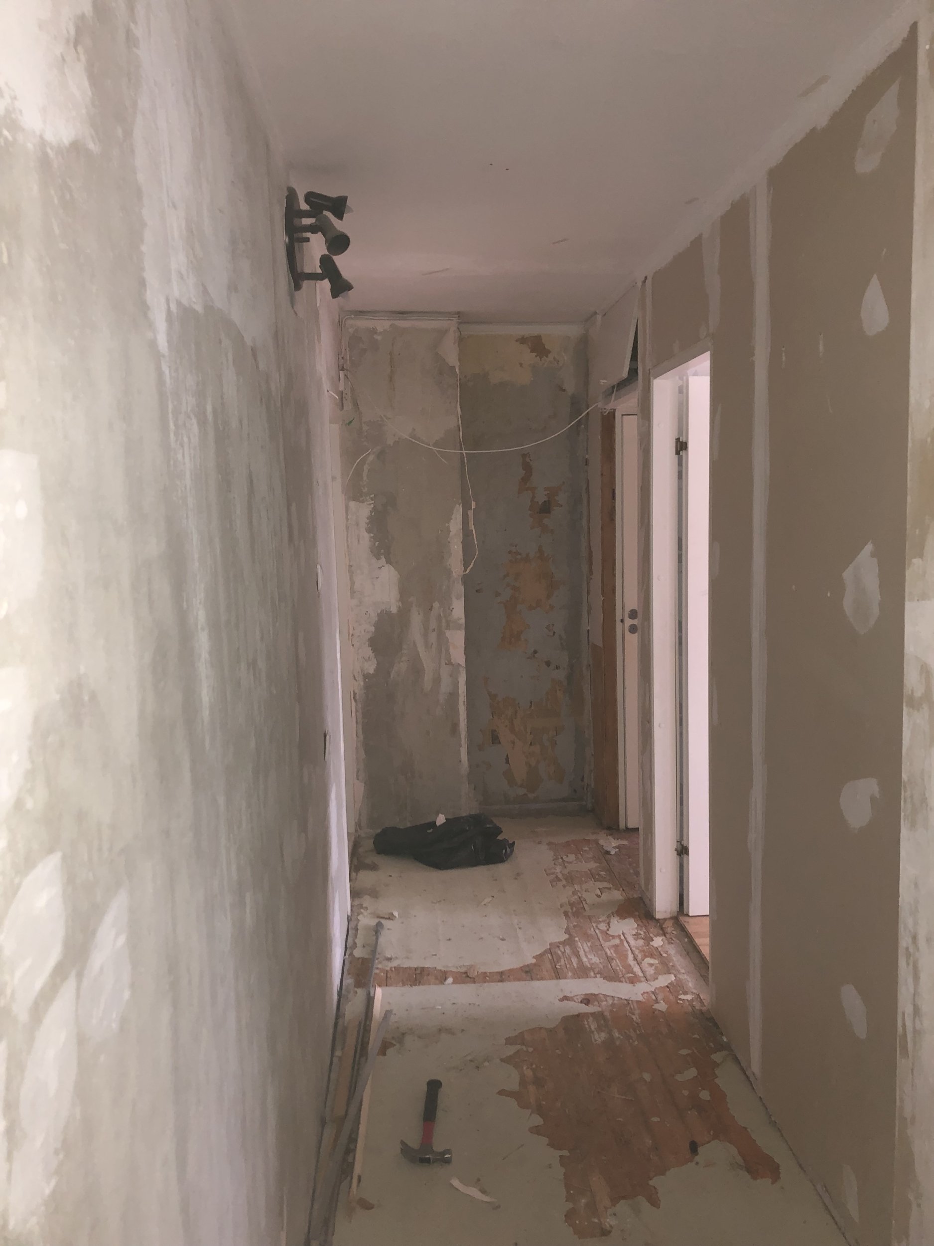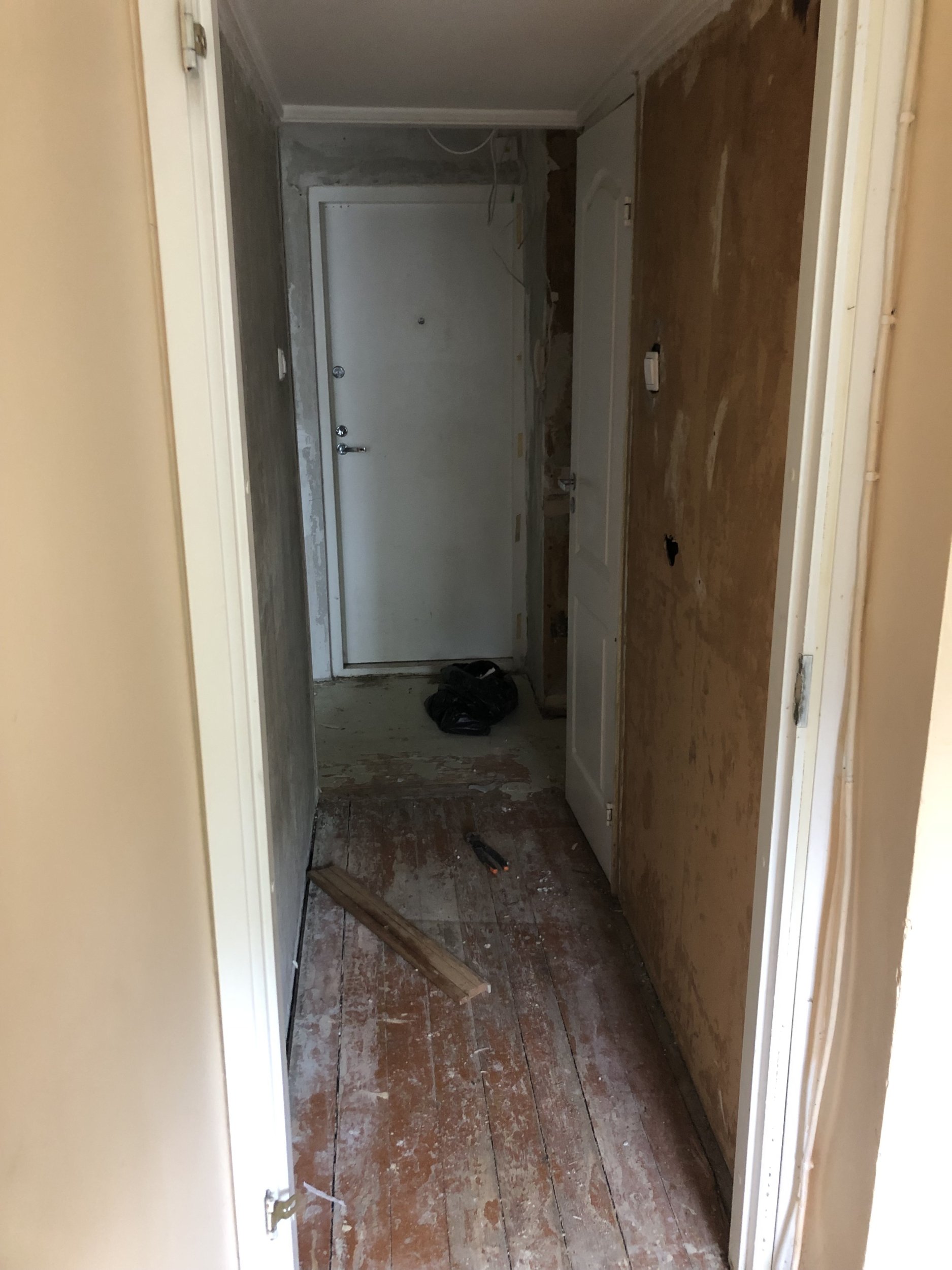 L-kujuline koridor: 3,60x1,16x k 2,47 (ühes seinas välisuks, teises uks tuba III-e ja üks külg avatud tuba II-e) + 1,88x0,85x k2,04 (ühes pikemas seinas on uks vannituppa, ja tapeeditava pinna pikkus selles osa su 1,13)