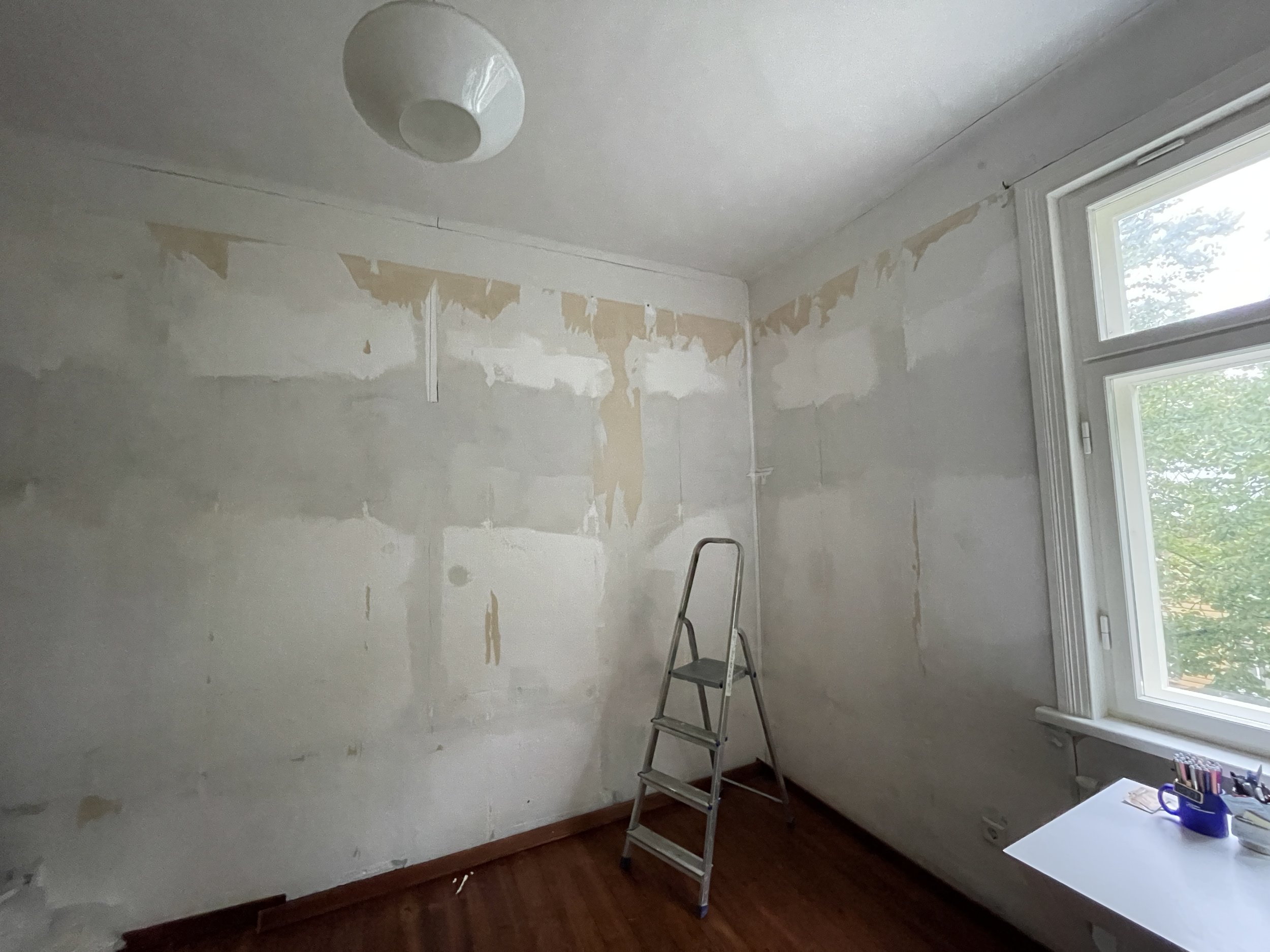-kahe seina soojustuse vahetus ning ettevalimistus tapeetimiseks. Seinade mõõdud 4x3m ja 3.2x3m, aknaava 1.4x1.9m