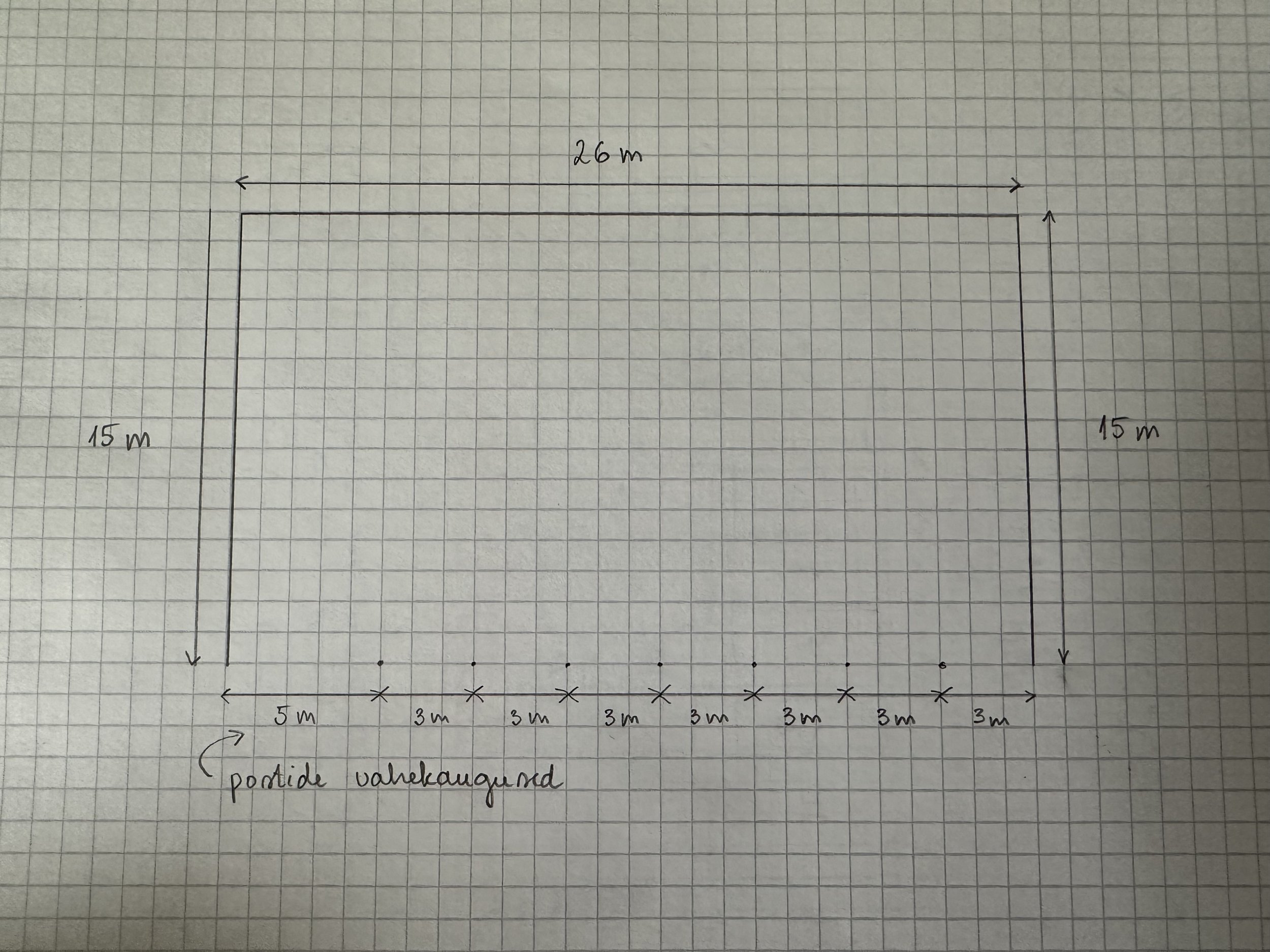 Soovin põllumajandustehnika varjualuse ehituse pakkumist. Varjualune peaks olema järgmiste parameetritega: pikkus 26m, laius 15m, kõrgus 4,5m. Varjualusel peaksid olema sissepääsud terve pikema külje ulatuses (26m). Varjualuse skeem koos vajalike tugipostivaheliste laiustega lisatud. Joonisel ei ole arvestatud seinte ja tugipostide paksusest tulenevate ruumikadudega, kuid nende võrra võimaldab hoone püstaitamiseks kasutatav maa-ala nihutada välispiire. Soovin terviklahenduse pakkumist, mis sisaldaks ka pinnase ettevalmistust ja vundamenditöid. Ehitusloa hankimisega tegeleksin ise.