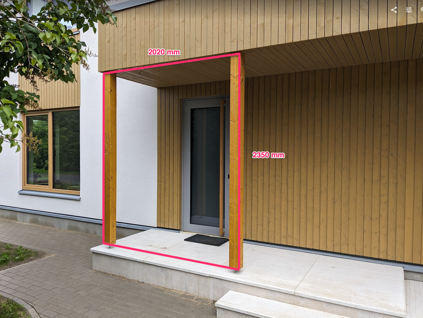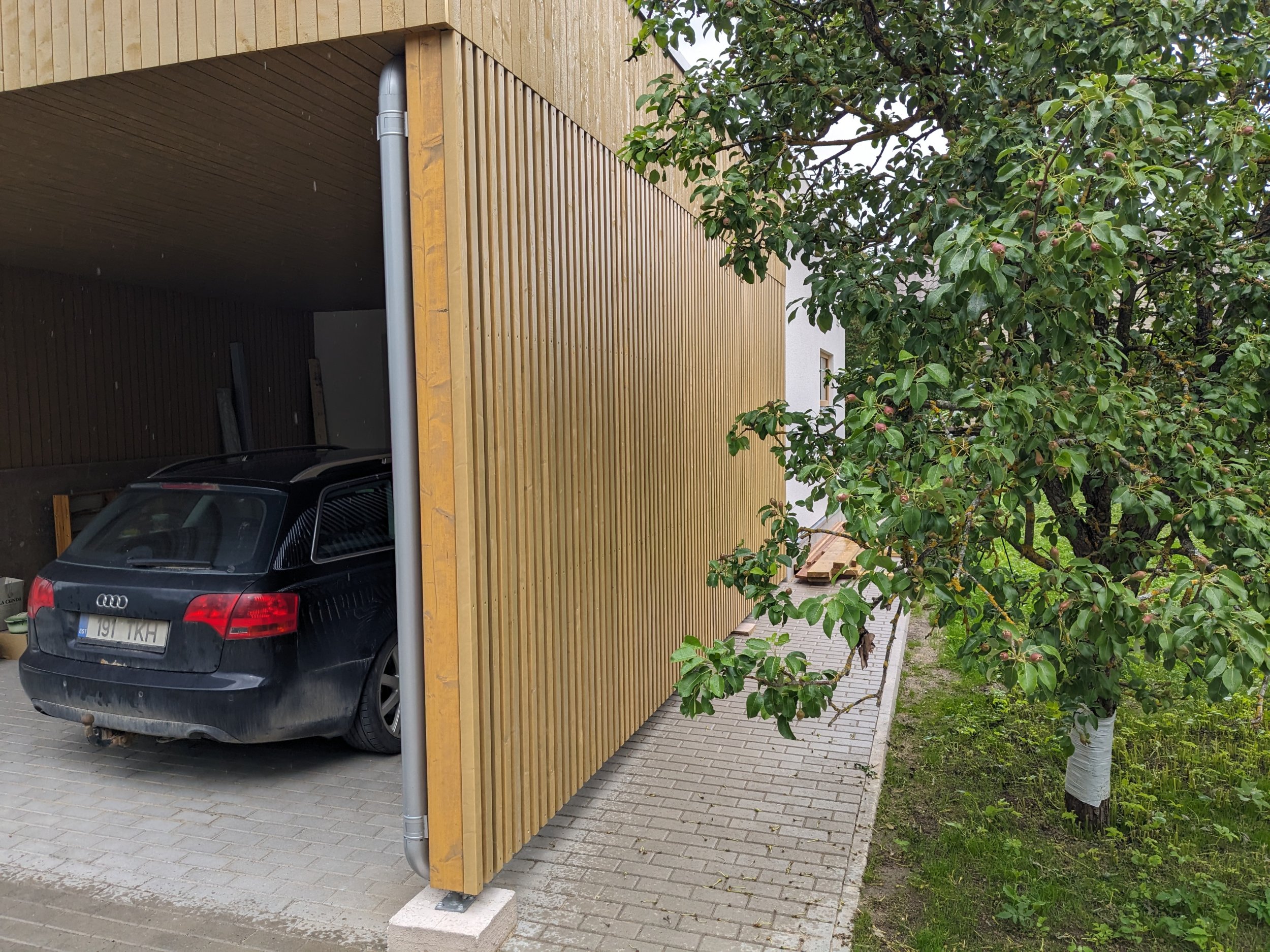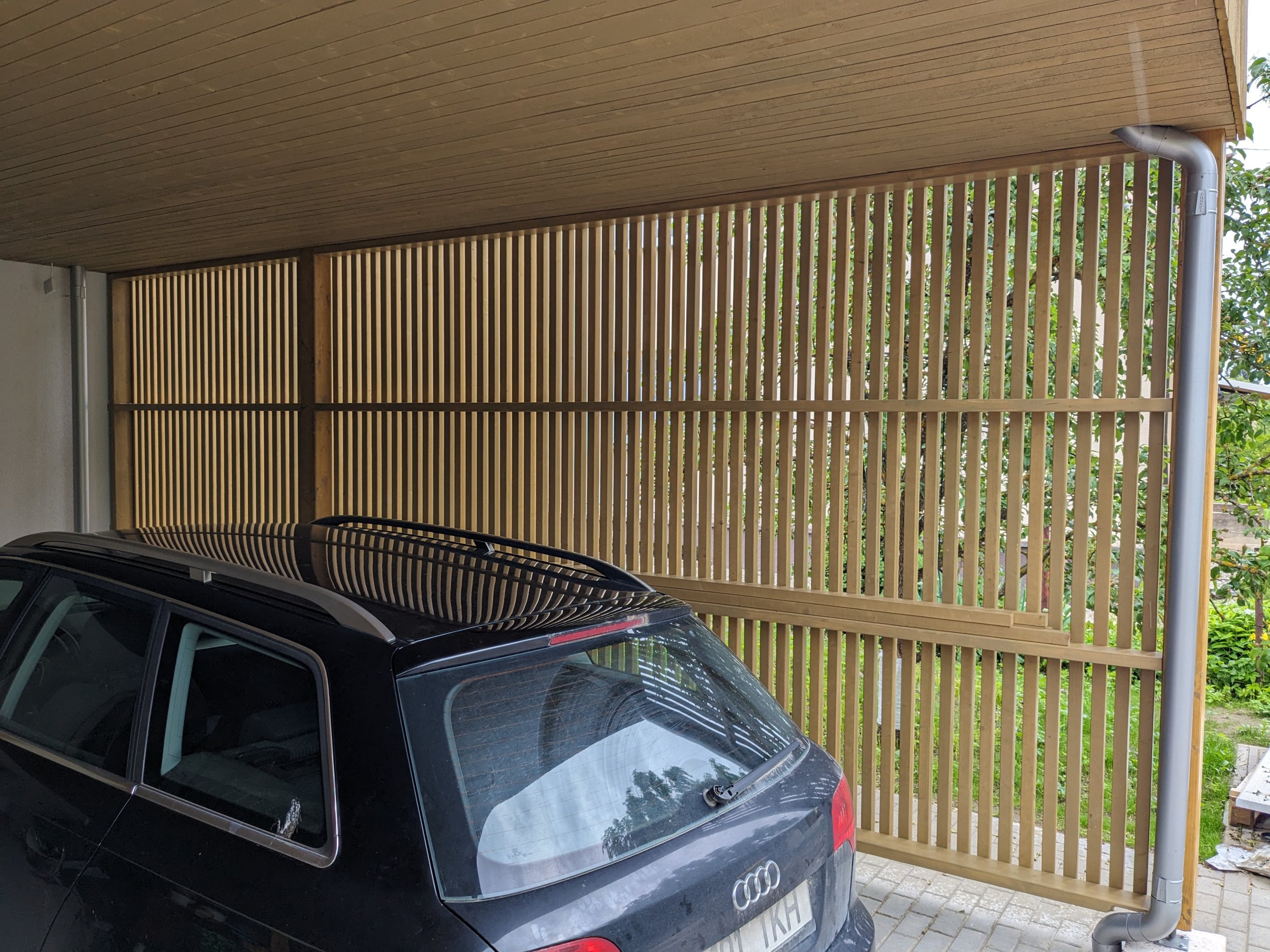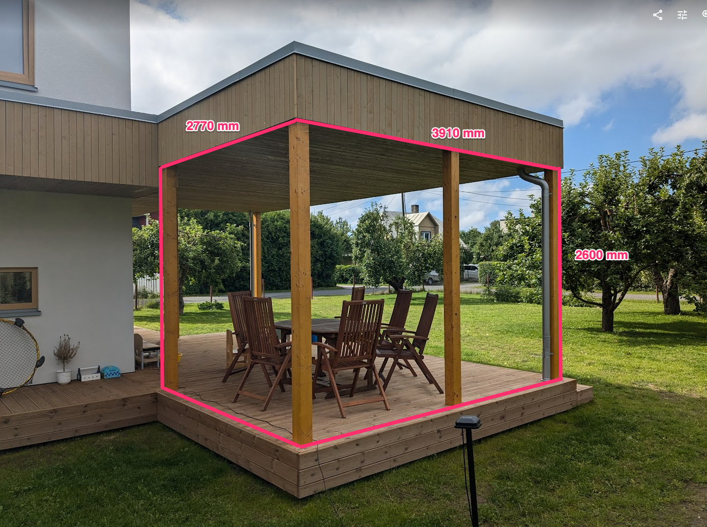 Terrassile ning esiukse ette teha punasega märgitud alale samasugune varjestus nagu autovarjualuse all.