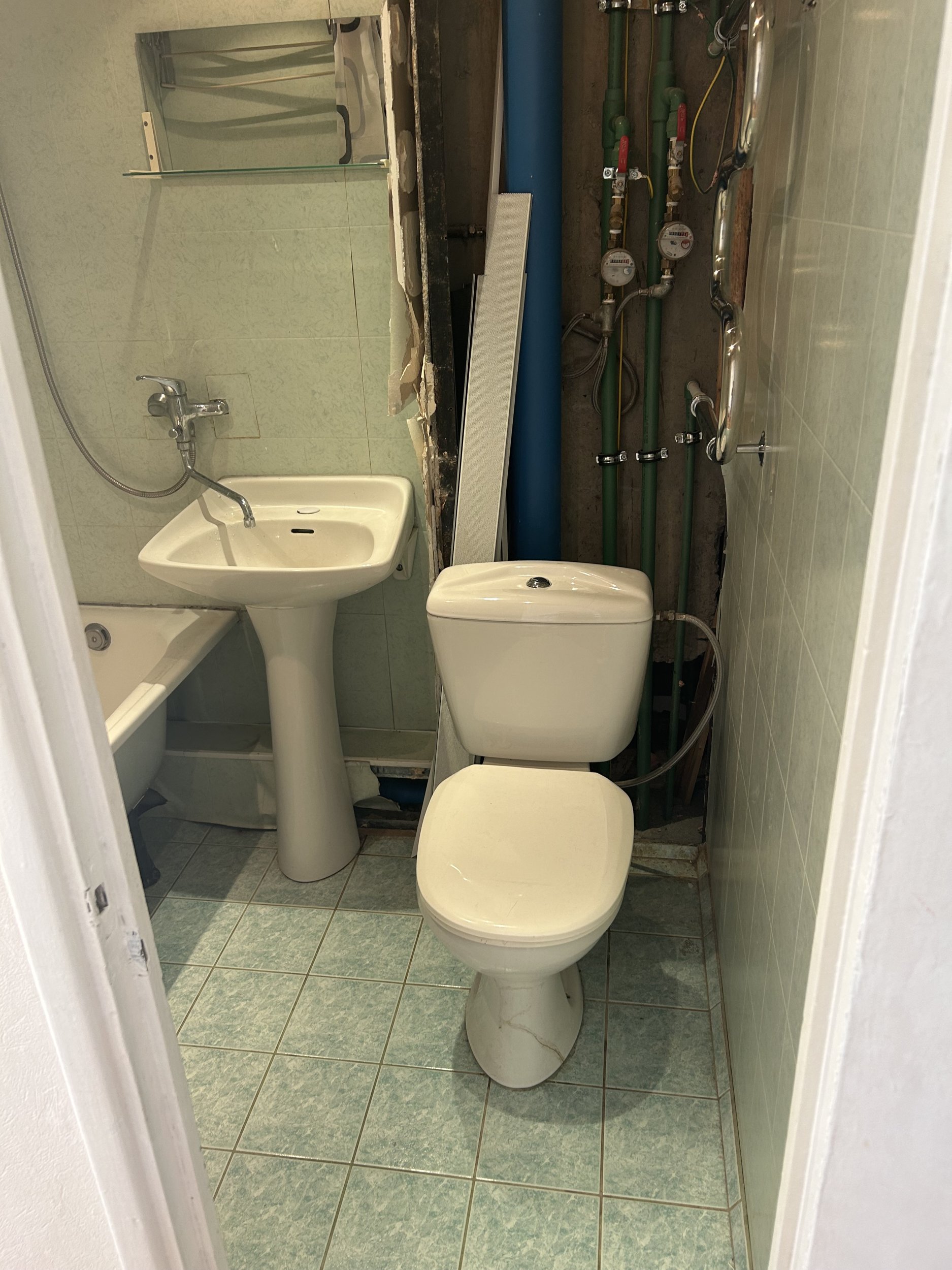 Uus wc pott (seinale paigaldatud), luuk seinale veemõõtjate näitude vaatamiseks.