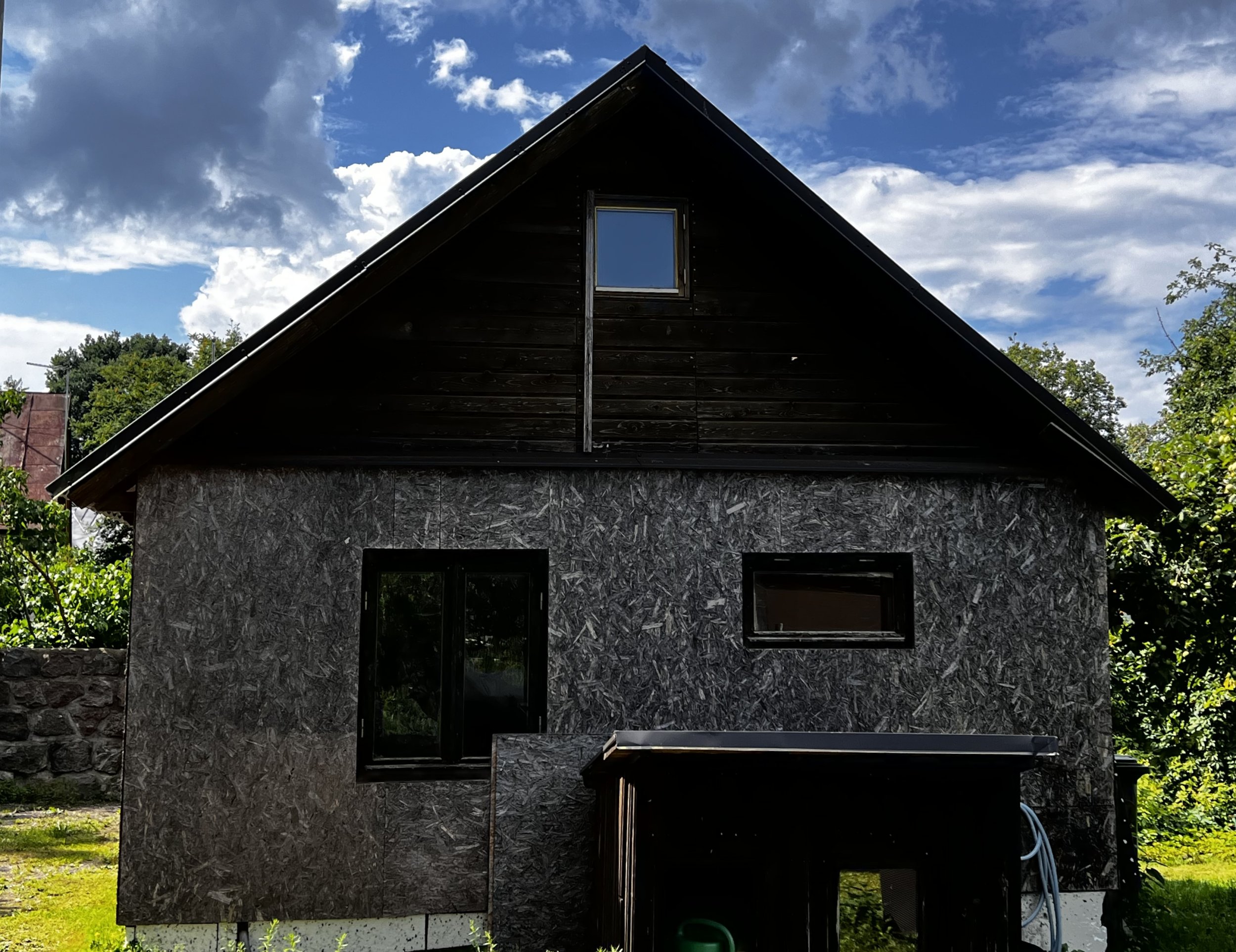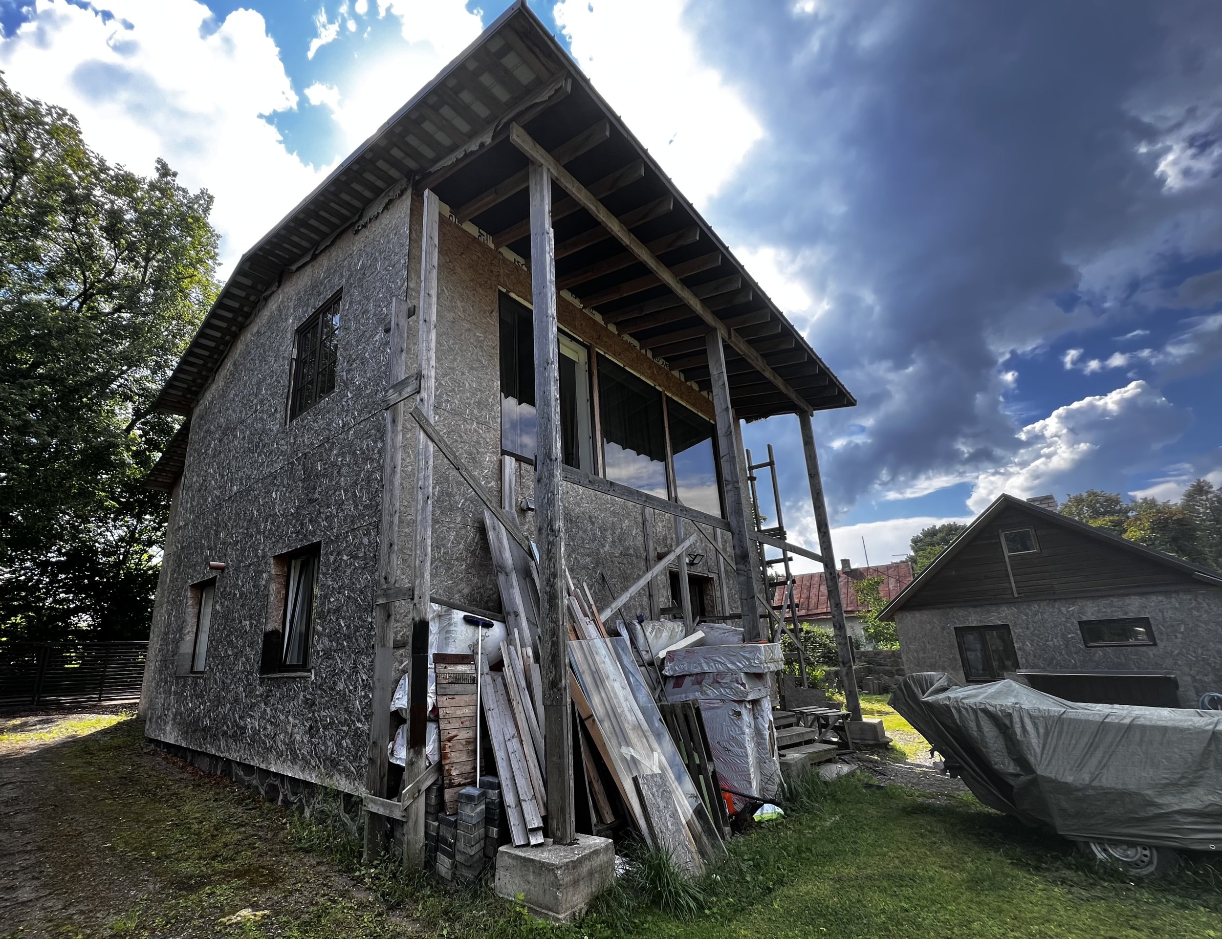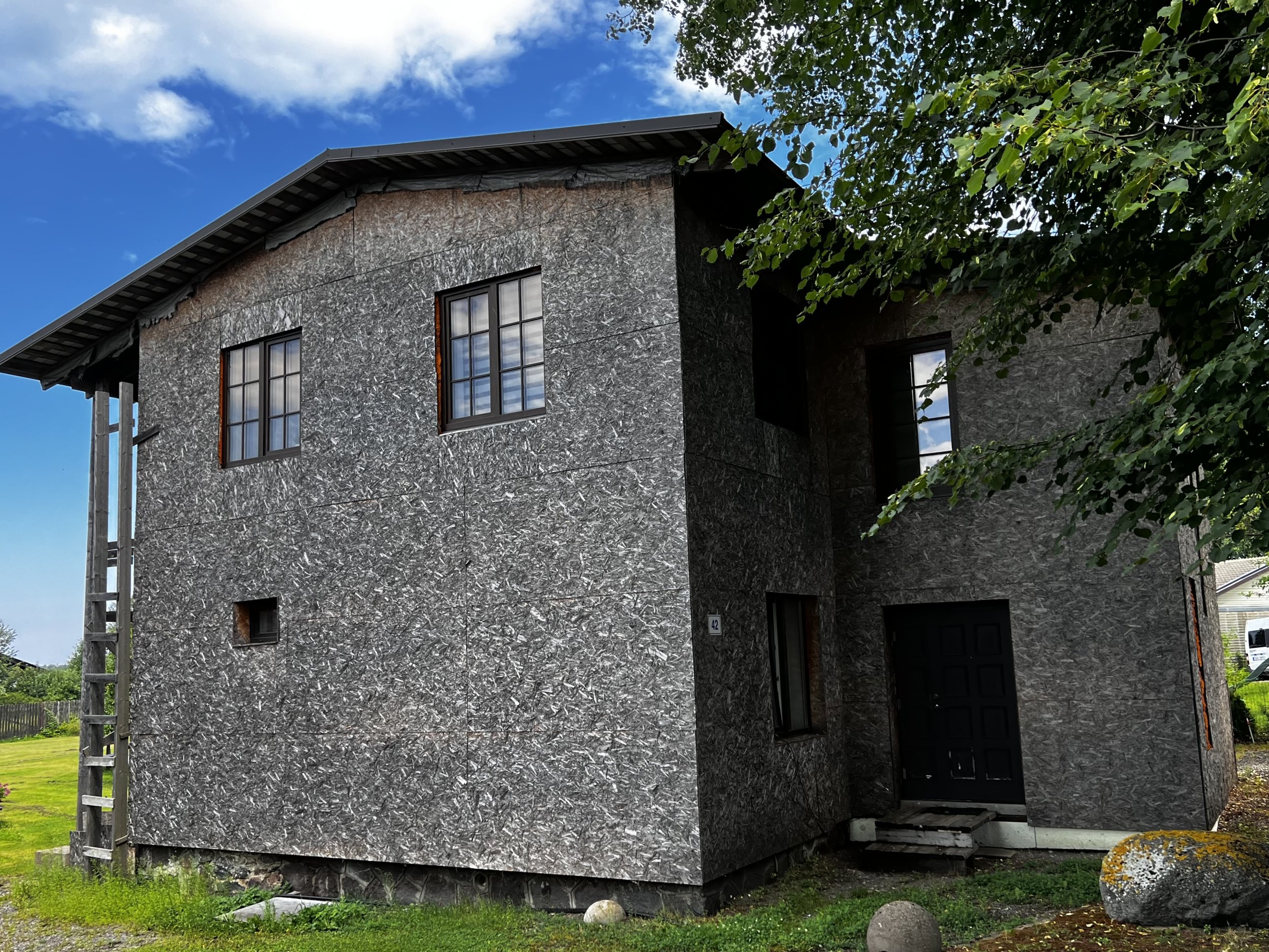Eramu - fassadile laudise paigaldus (roovitus ja soojustus tehtud, kaetud OSB plaadiga), tuulekastid koos linnuvõrguga, vundamendi katmine tempsi plaadiga koos näriliste võrguga, terrassi, rõdu ja trepi ehitus. OSB plaat tuleks eelnevalt enne laudist eemaldada ja soojustus ka korralikult üle vaadata. Kui on kahjustusi, siis välja vahetada.
