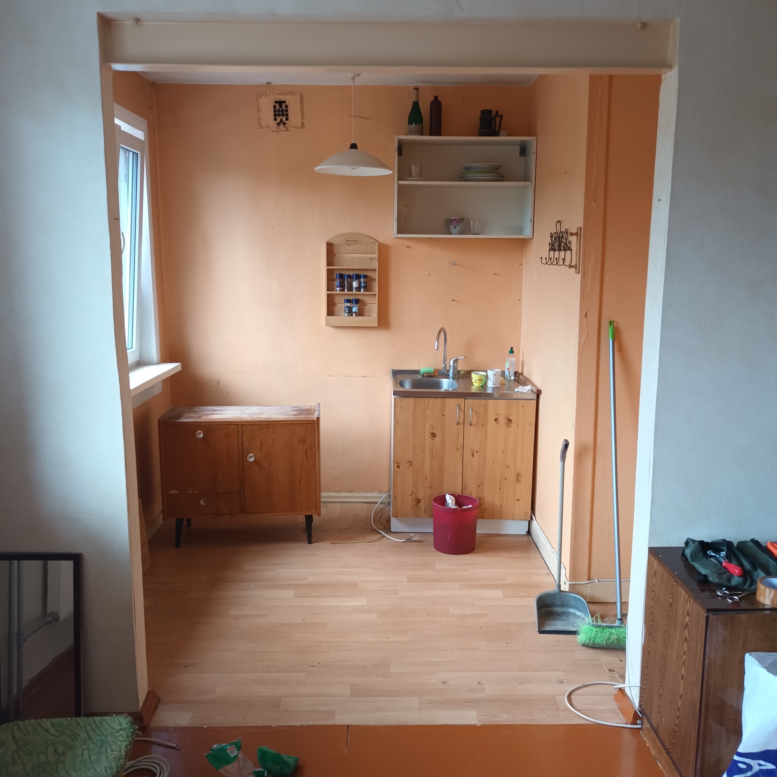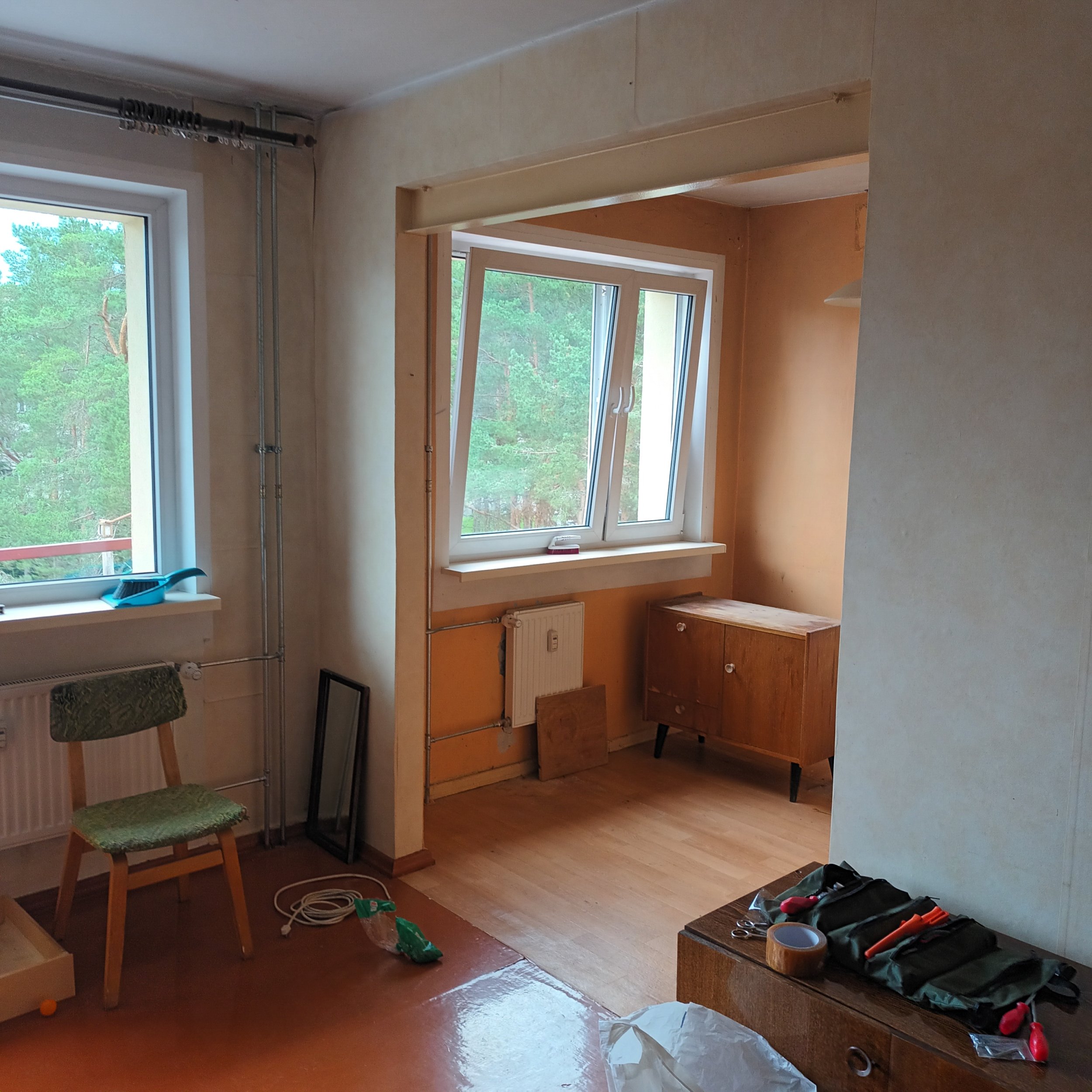 Suure toa ja köögi vahele on tehtud suur auk, nagu kööktuba. Vana köögiuks on kinni, sinna tuleb vannitoa uks ja vannitoa kuju pisut muutub, köök läheb suuremaks. Uus köögimööbel, selle valimisel vaja meistriga nõu pidada.