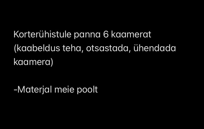 Pakkumine sisaldab kaablite vedu, testimist, otsastamist ja kaamerate ühendamist. Töö ja tööriistad meie poolt, material Tellija poolt. |