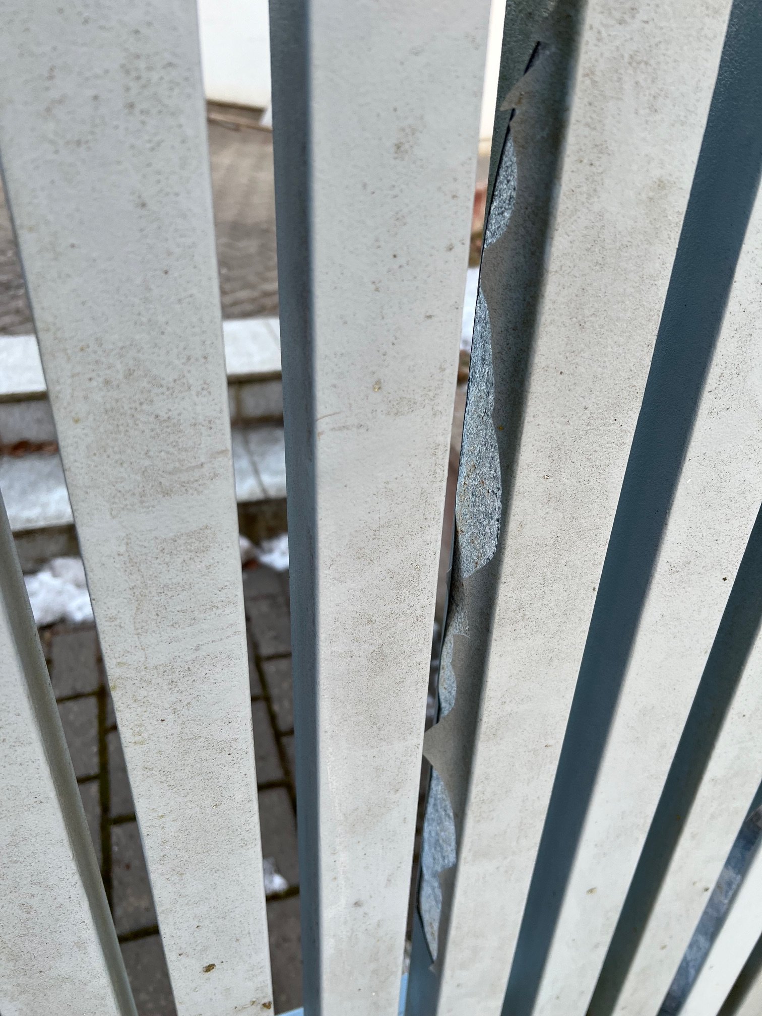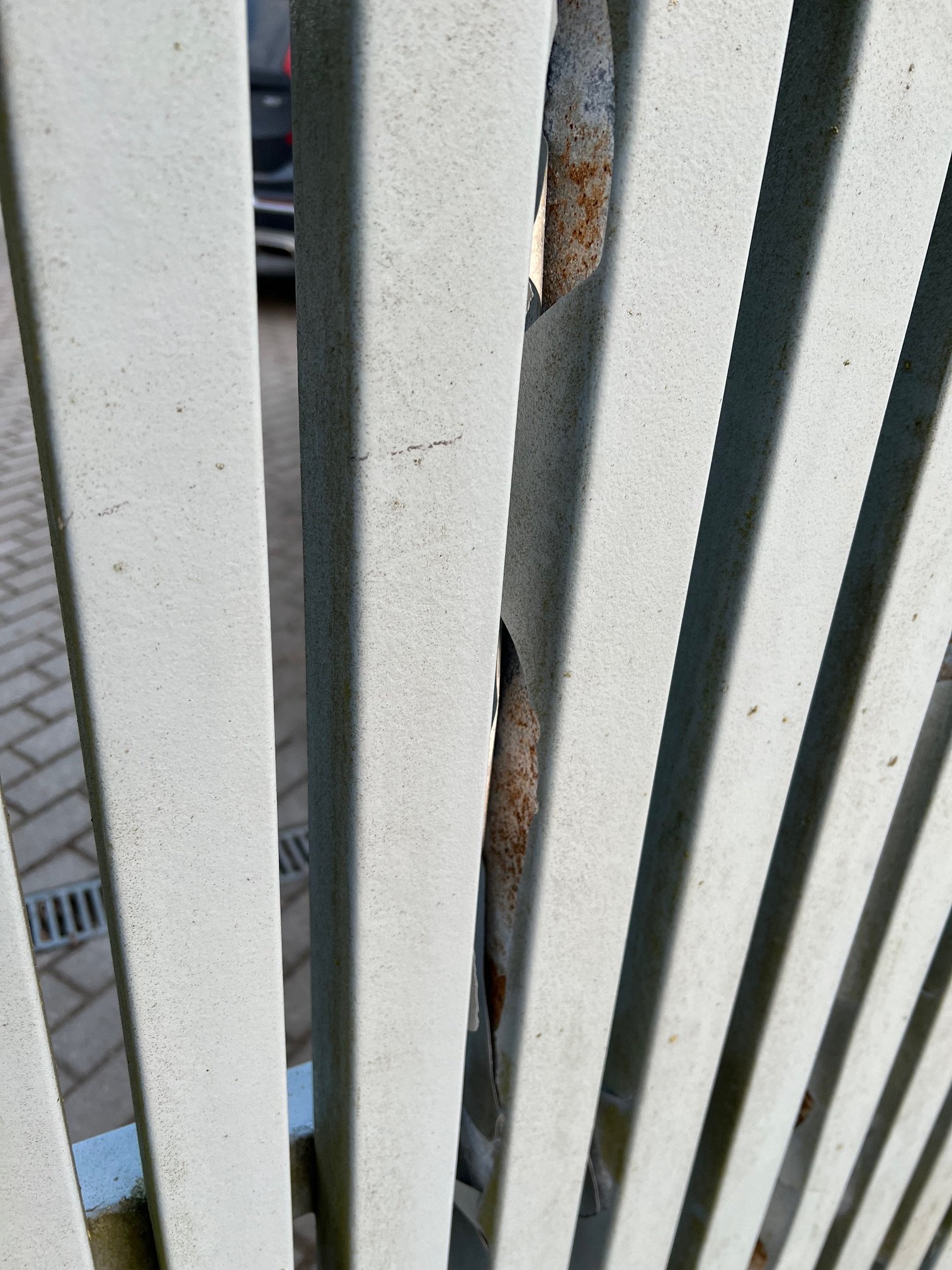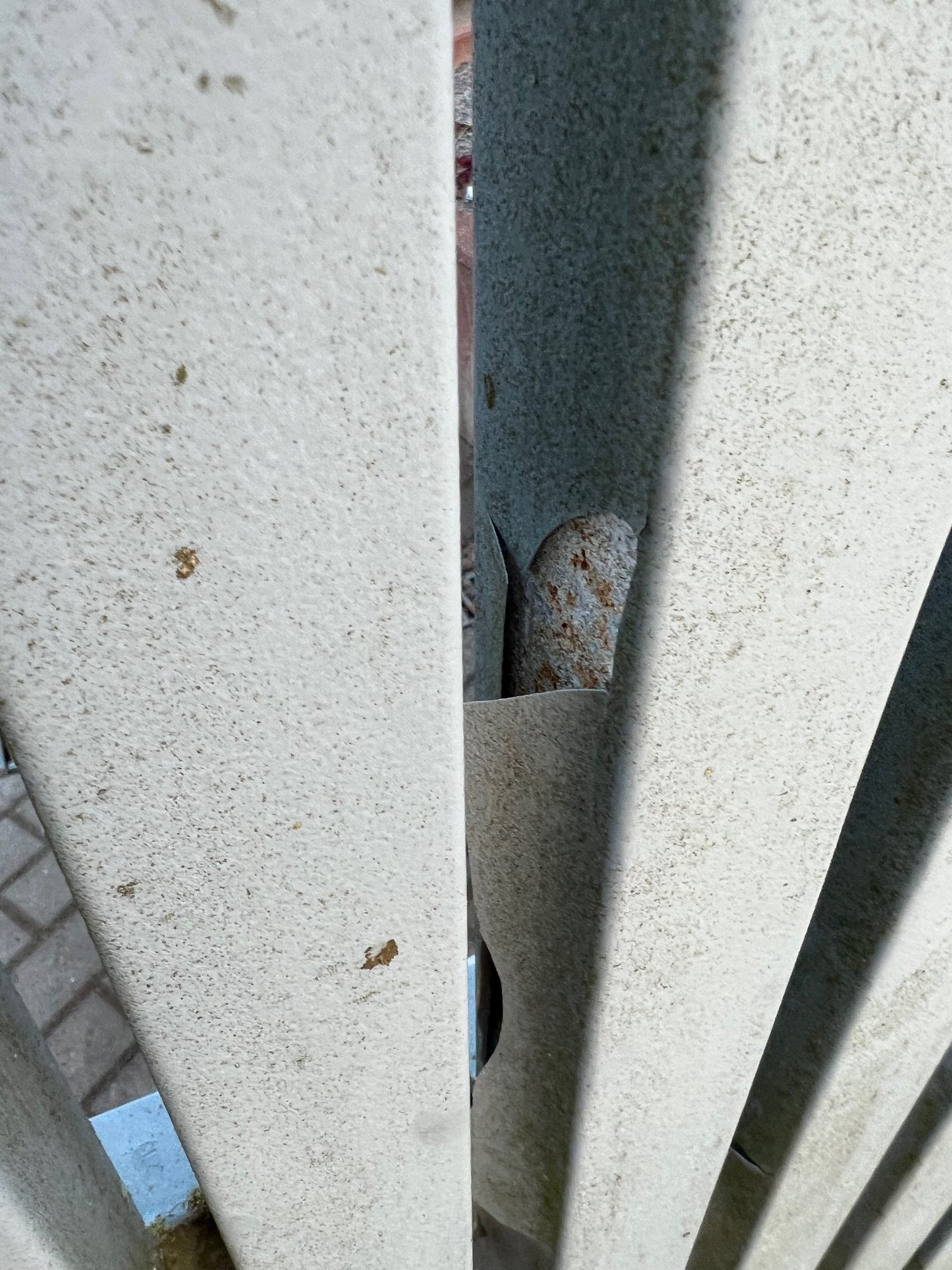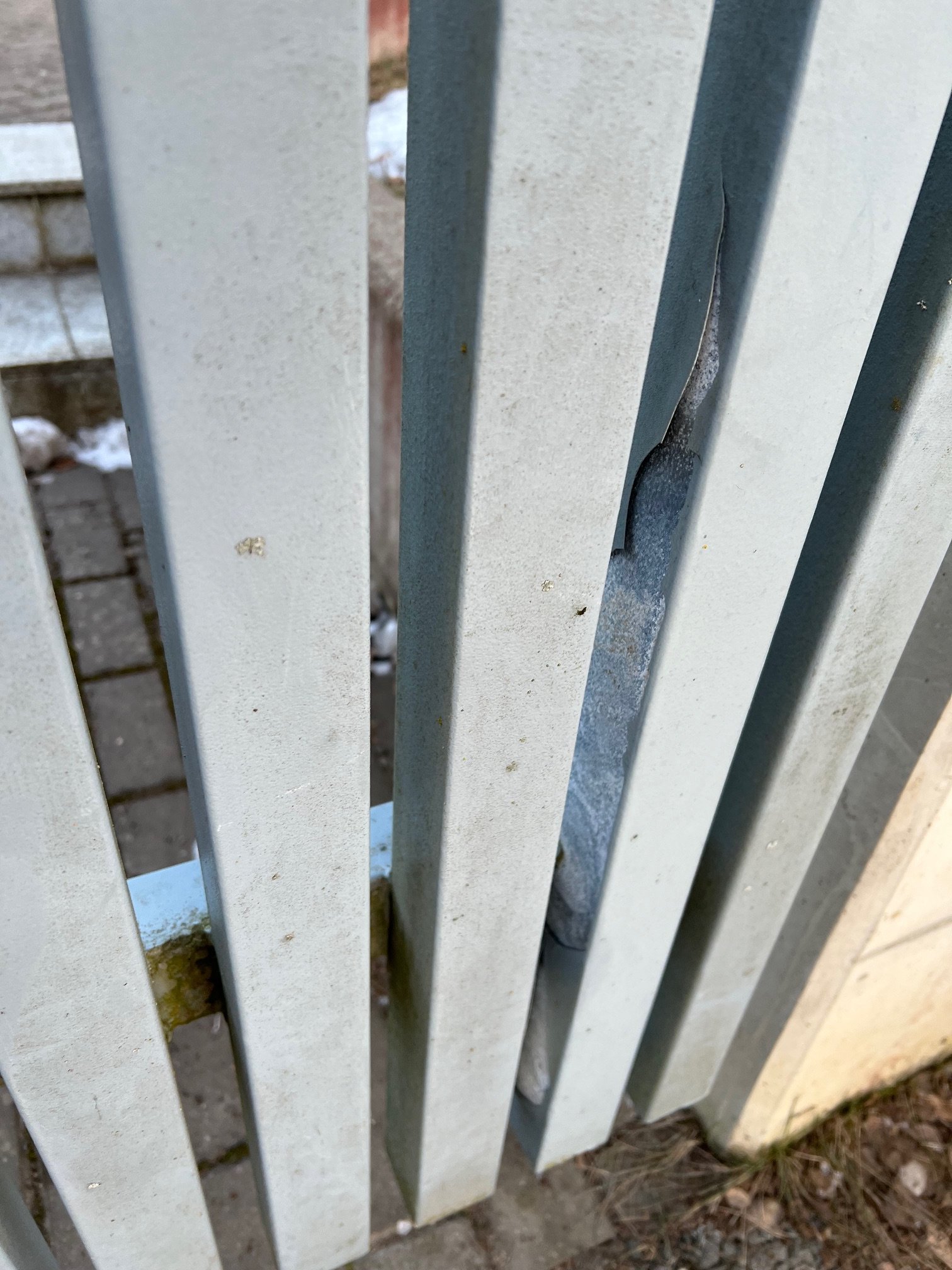 Värv on maha koorunud. Tuleb lahti suurte tükkidena. Alt tsingitud.