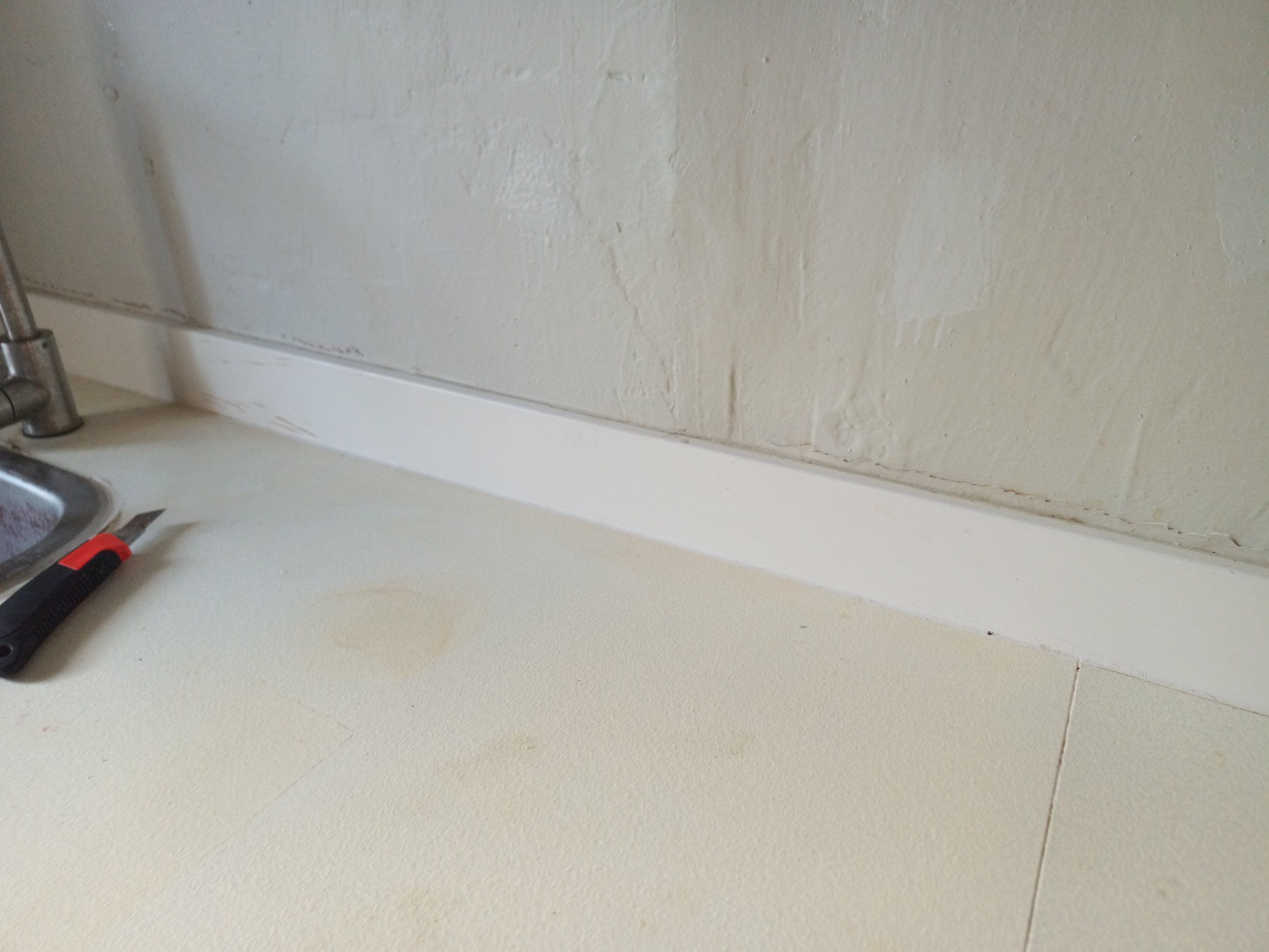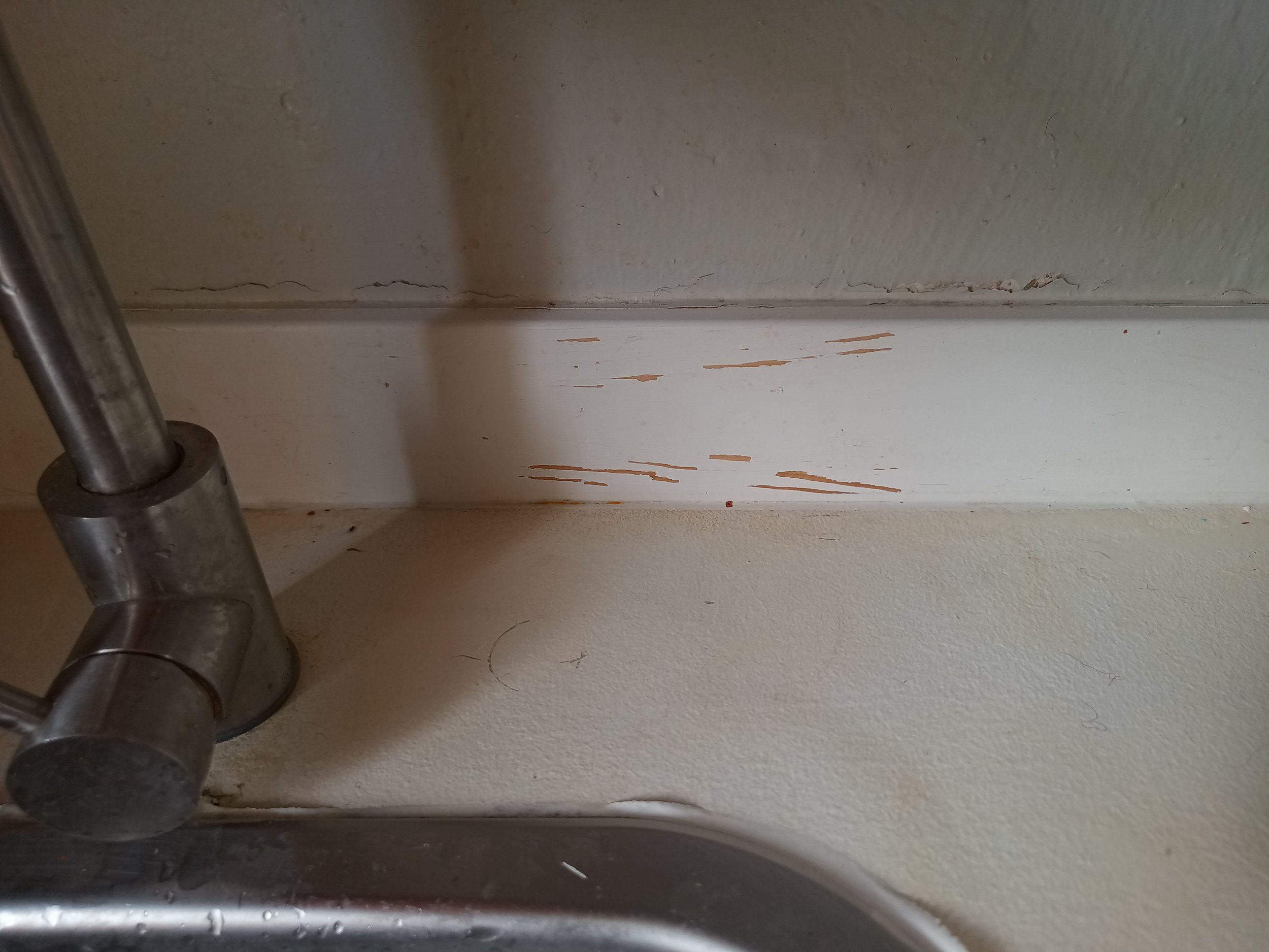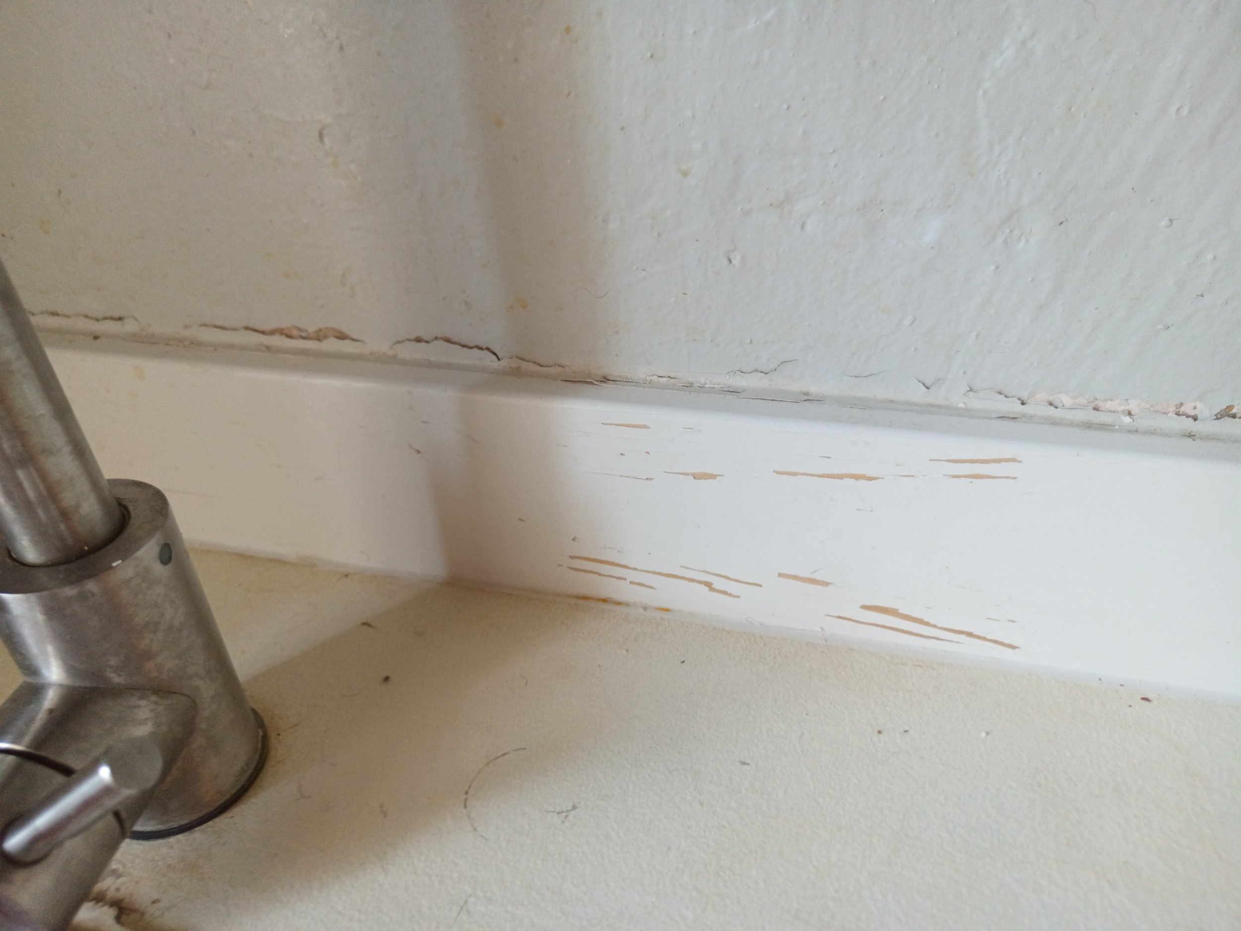 töötasapinna ja seina vahelt eemaldada silikoon ja lahtine värv ja panna akrüül ning värvida üle sh puitliist värvida