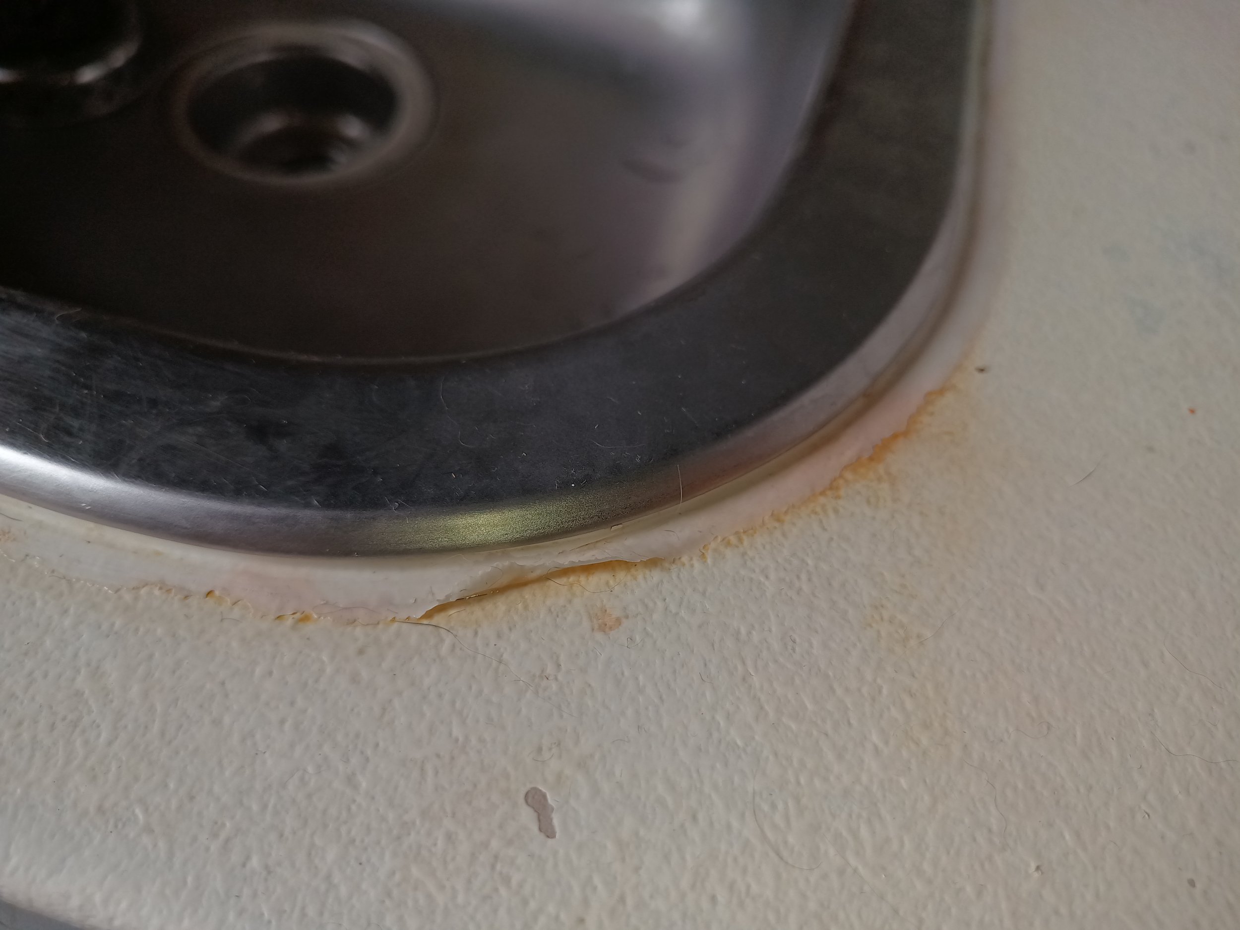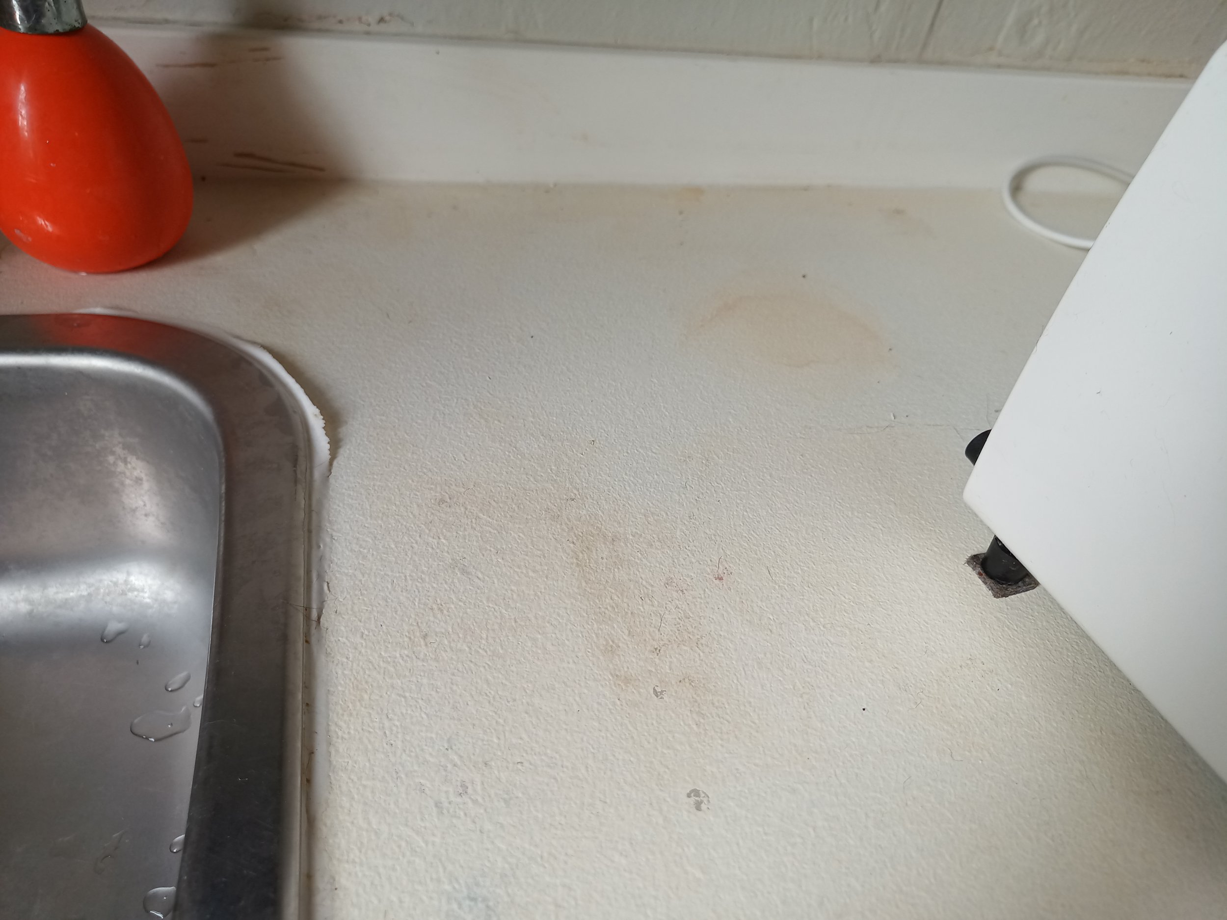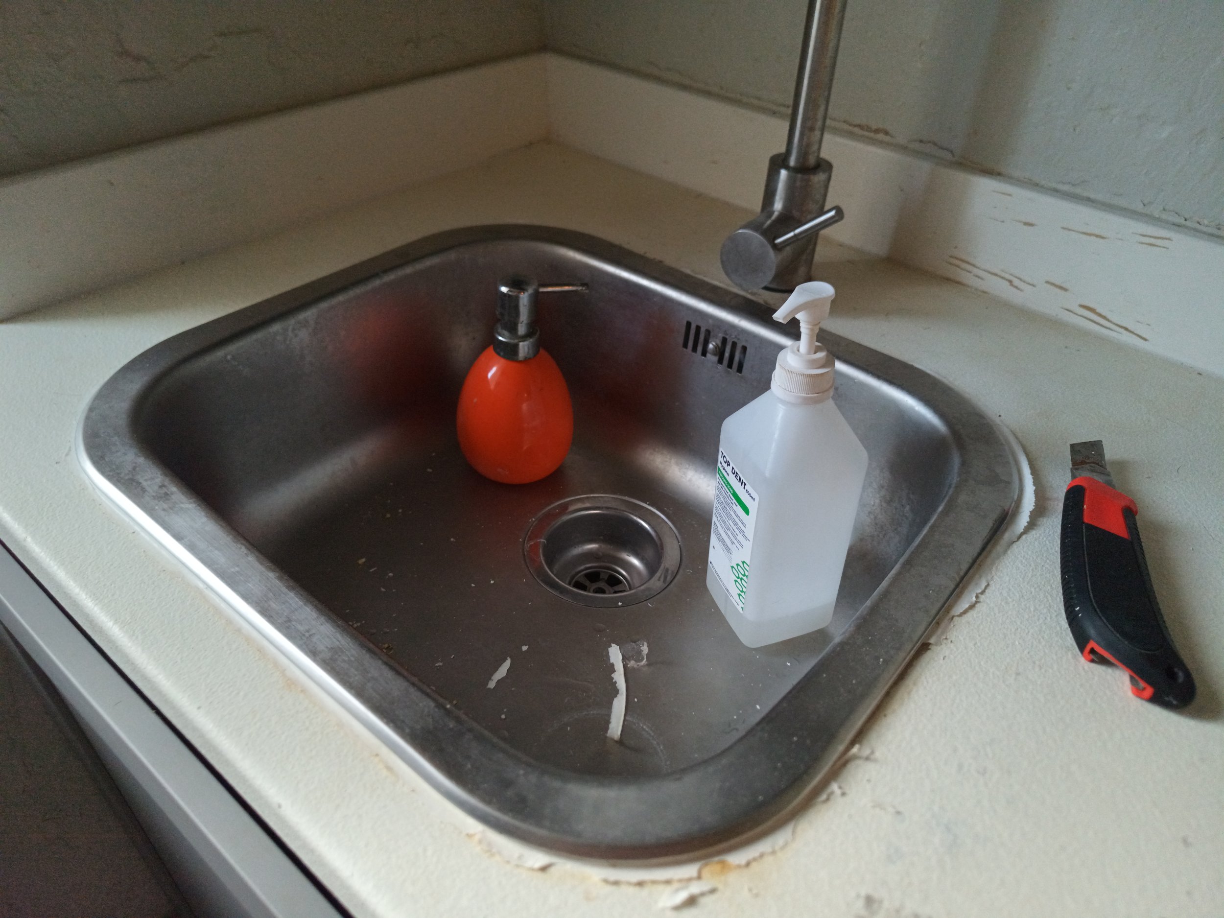 töötasapinna ja seina vahelt eemaldada silikoon ja lahtine värv ja panna akrüül ning värvida üle sh puitliist värvida