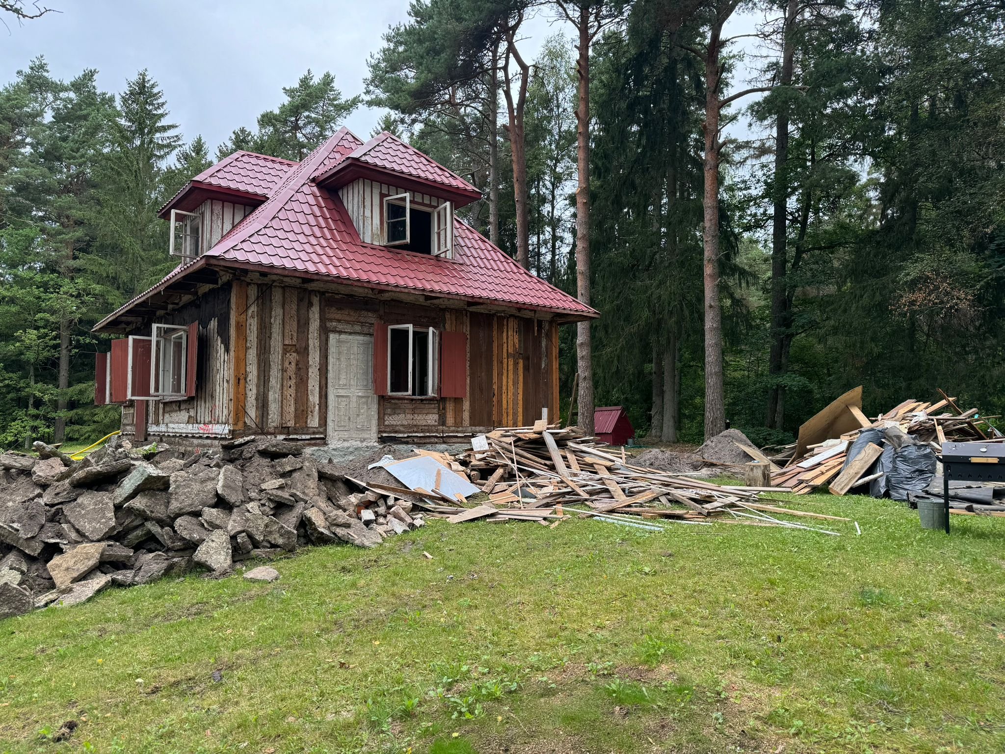Uue katuse raami ehitamine, vana raam lammutatud ja materjalid olemas.