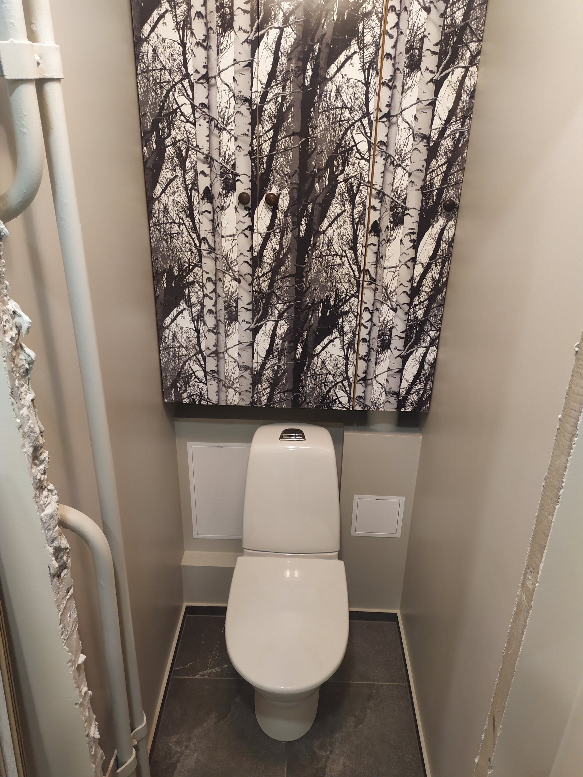 Asukoht Tartu linn, Mõisavahe tänava korterelamu korter. Ühistu toruvahetusega seoses vajab parandamist WC sein. Potist vasakul ja paremal tagaseinas tuleks paigaldada luugid (olemas), et torudele ja näidikutele ligi pääseda ning taastada kipssein ja viimistleda. Samuti torude ühenduskohad laega ja seinaga viimistleda. Viimasel pildil on näha olukord enne lõhkumist.