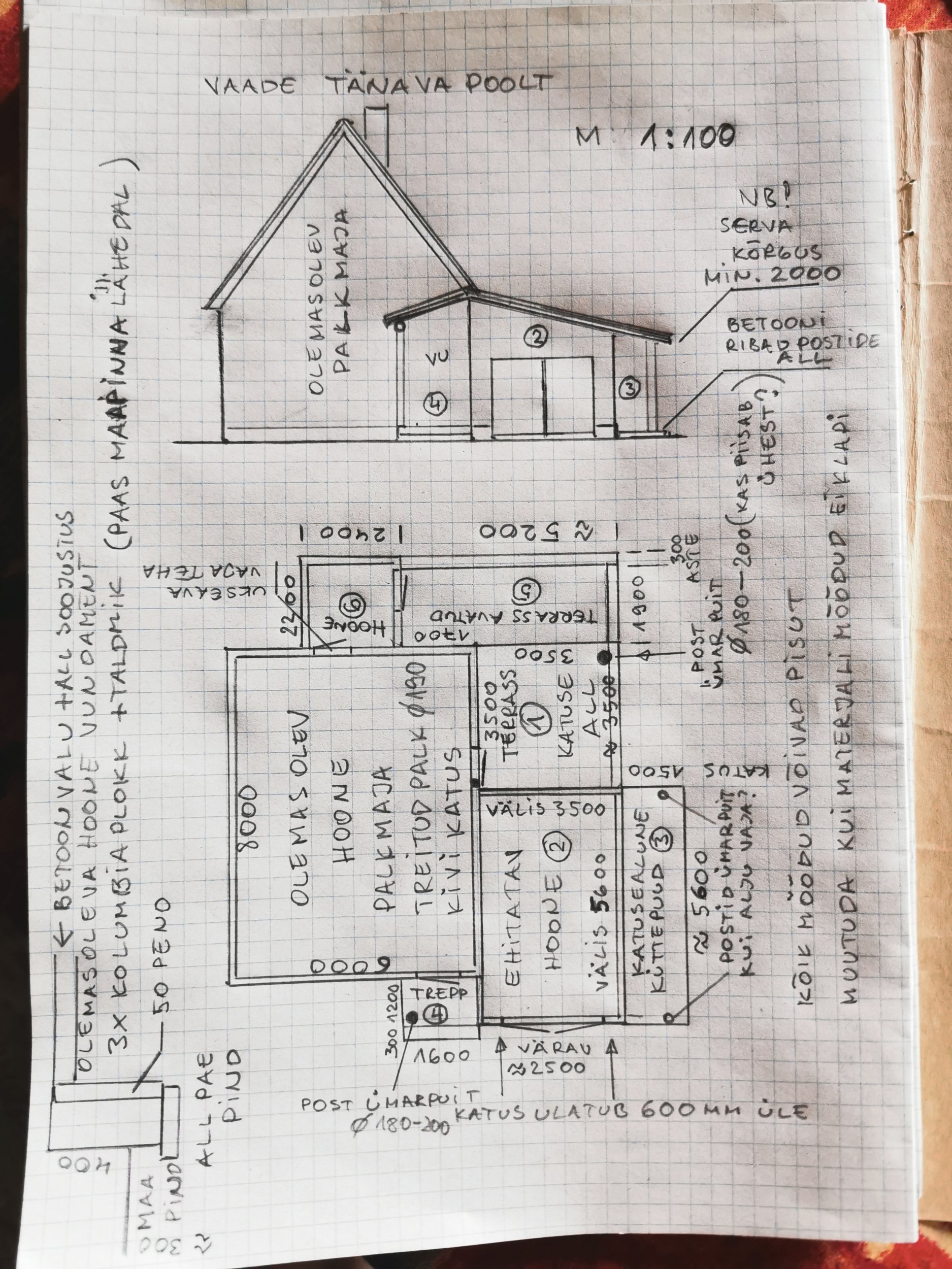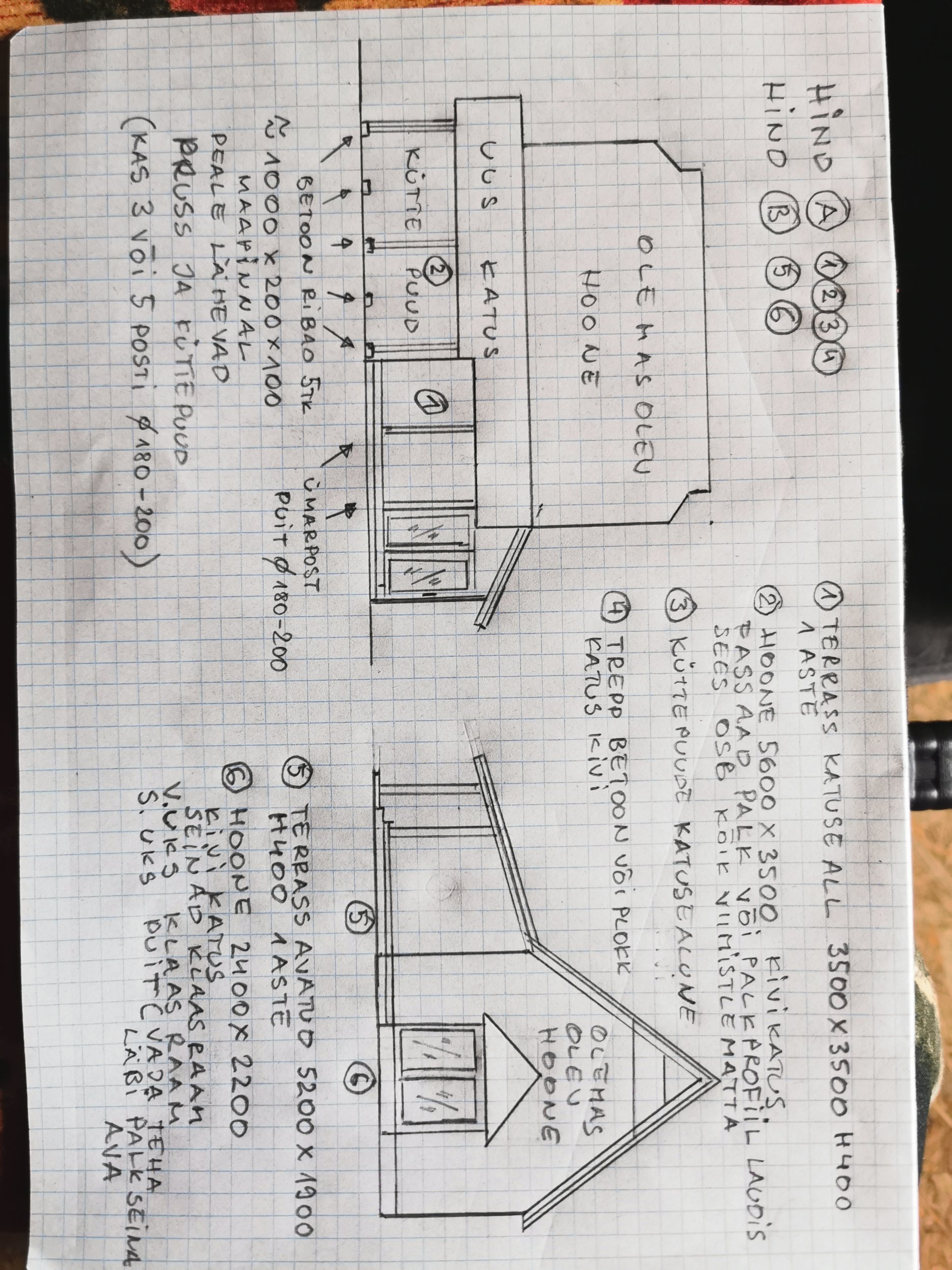 Hoone materjal treitud ümarpalk 180-190mm või palkprofiillaudis umbes 140*45mm ja soojustatud.Sees osb plaat.Viimistlust ei vaja.Katus hall kivi sarnane olemasolevale.Vertikaalpostid treitud ümarpalk 180-190mm.Hoones valatud ja soojustatud põrand.K,ommunikatsioone ja el.töid pole vaja.Hoonet kasutatakse väikese puutöökojana.Peaukse trepp valatud.Trepi kohal kivi katus.Küttepuude varjualuse postide alla jooksevad valatud ribad või betoonelemendid hoone vundamendist alates.Katusega terrassi osale poste vastavalt vajadusele ja nende alla valatud post või betoon plokk.Maapind on 30cm paeklibu ja siis paepind vastas.Hoone 6 on sauna eesruum.Vaja teha ava läbi olemasoleva palkseina ja paigaldada uks.Hoone seinad ja välisuks on puidust klaasraamid.Katus kivi.Soovin hinda 1/ 2 /3/ 4 eraldi ja 5/ 6 eraldi VT.joonised.Terrass 5 ei ole katuse all.