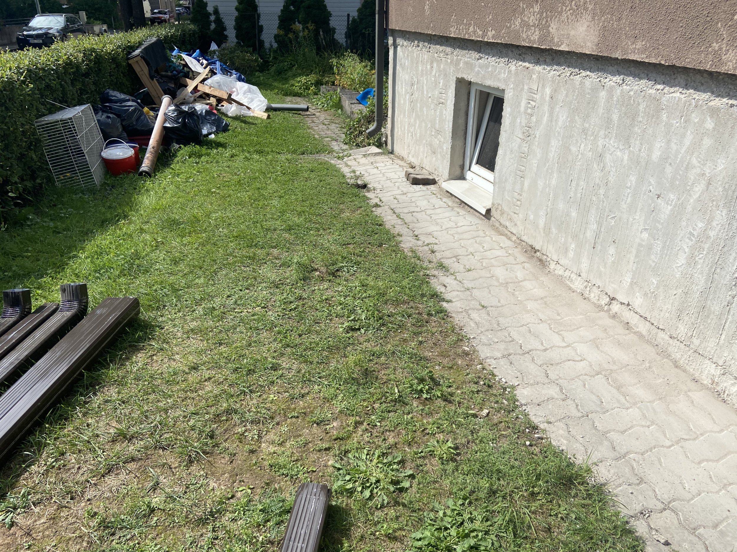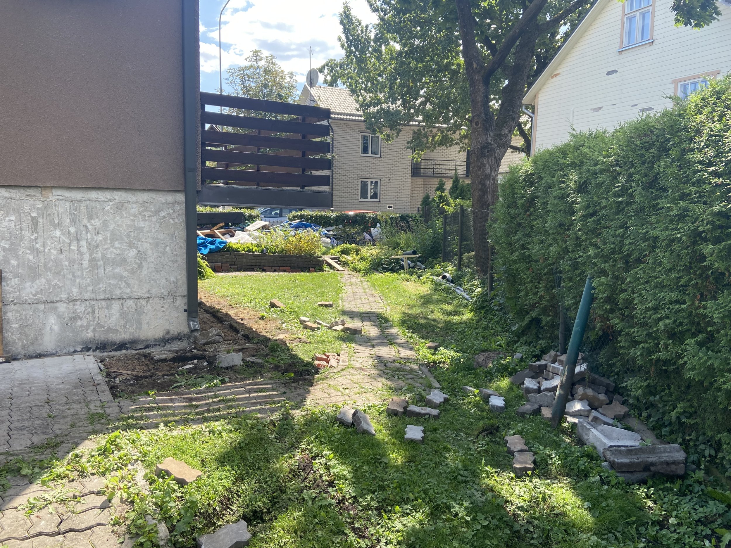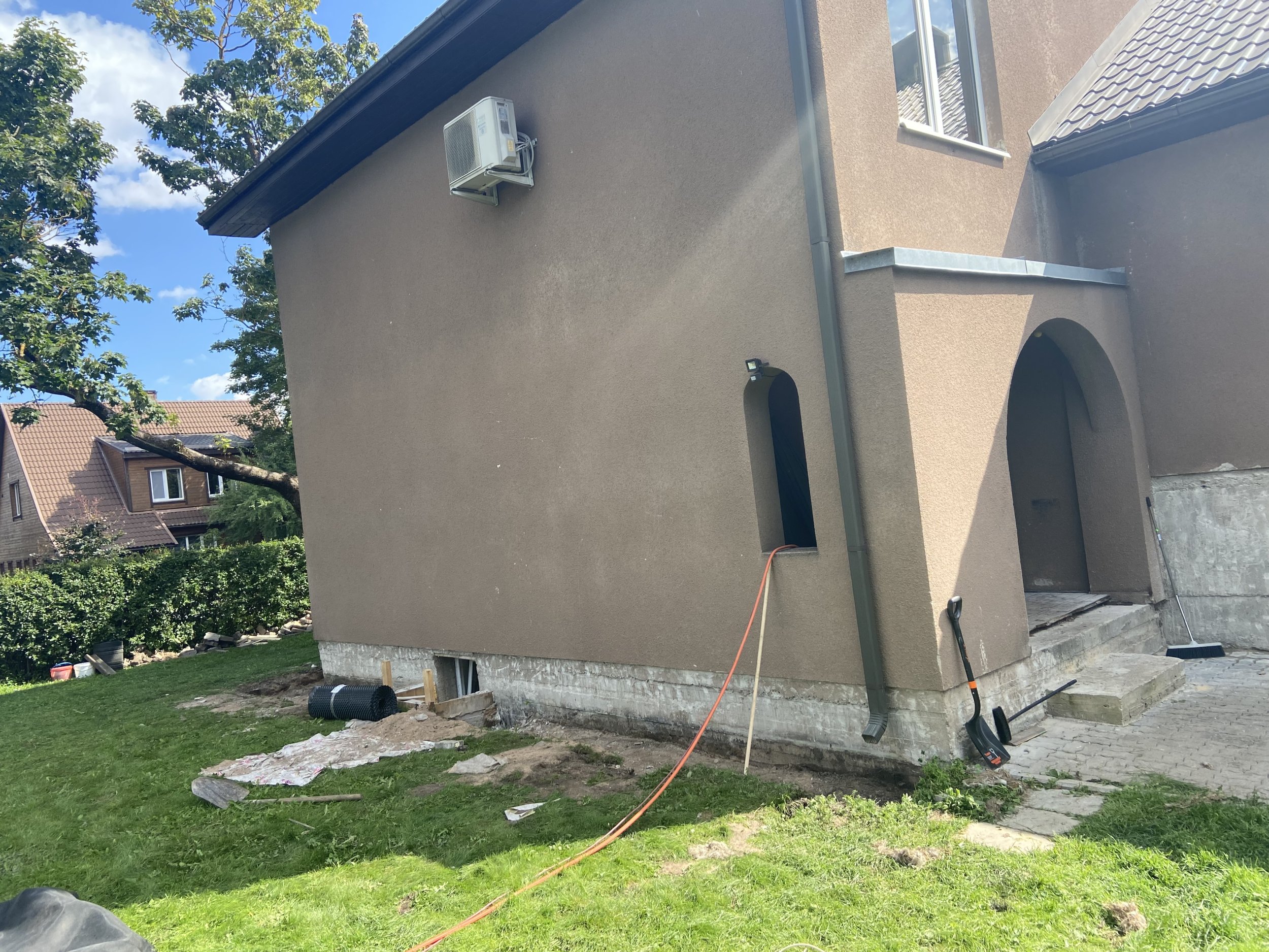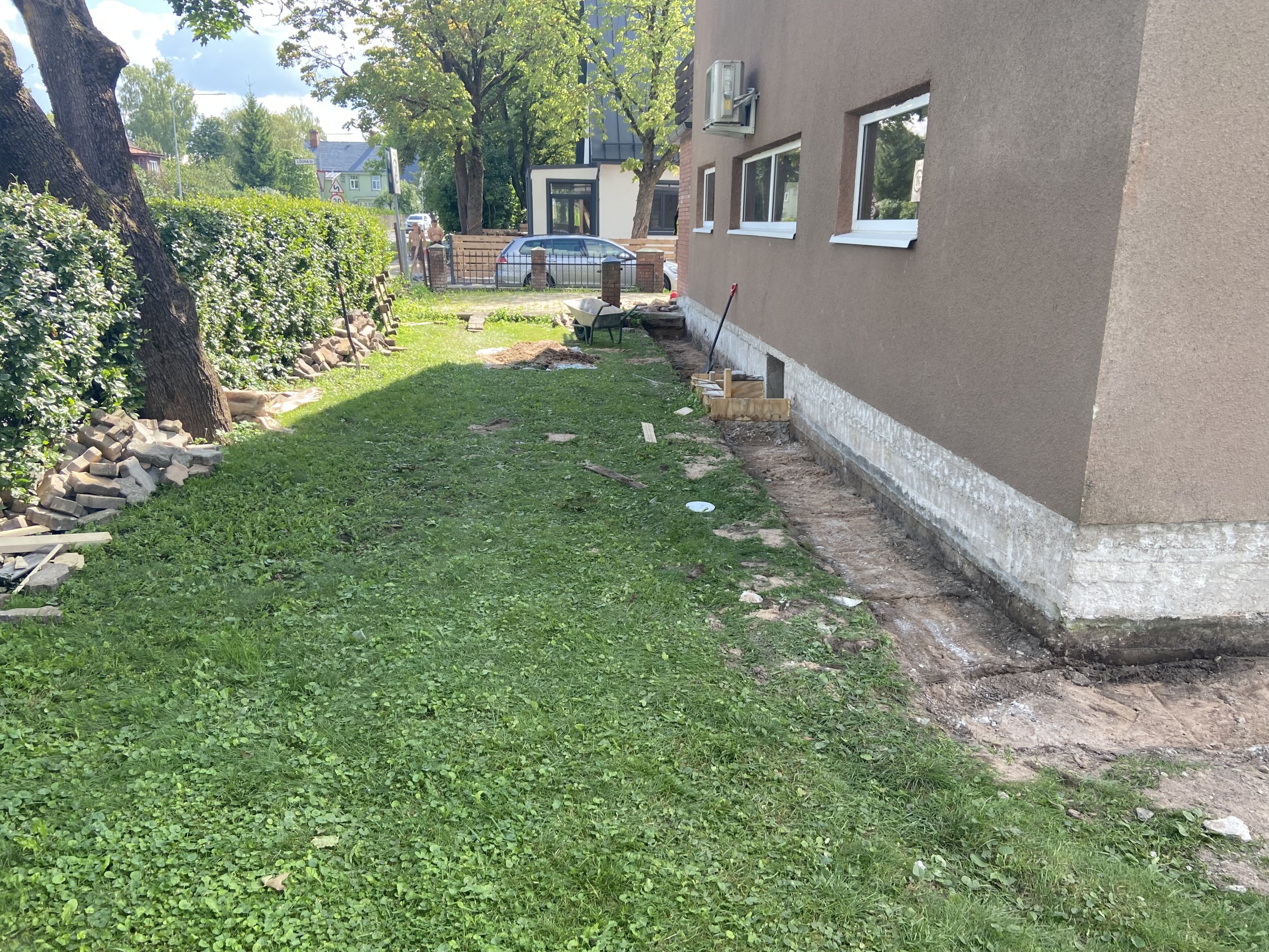 Tuleb kaevata ja ära viia umbes 20m³ maapinda, mõnes kohas 30 cm sügavale ning ümber maja umbes 50 cm sügavale ja täita kuni liivani (tänavakivid jäävad meile ja need pandakse hiljem)