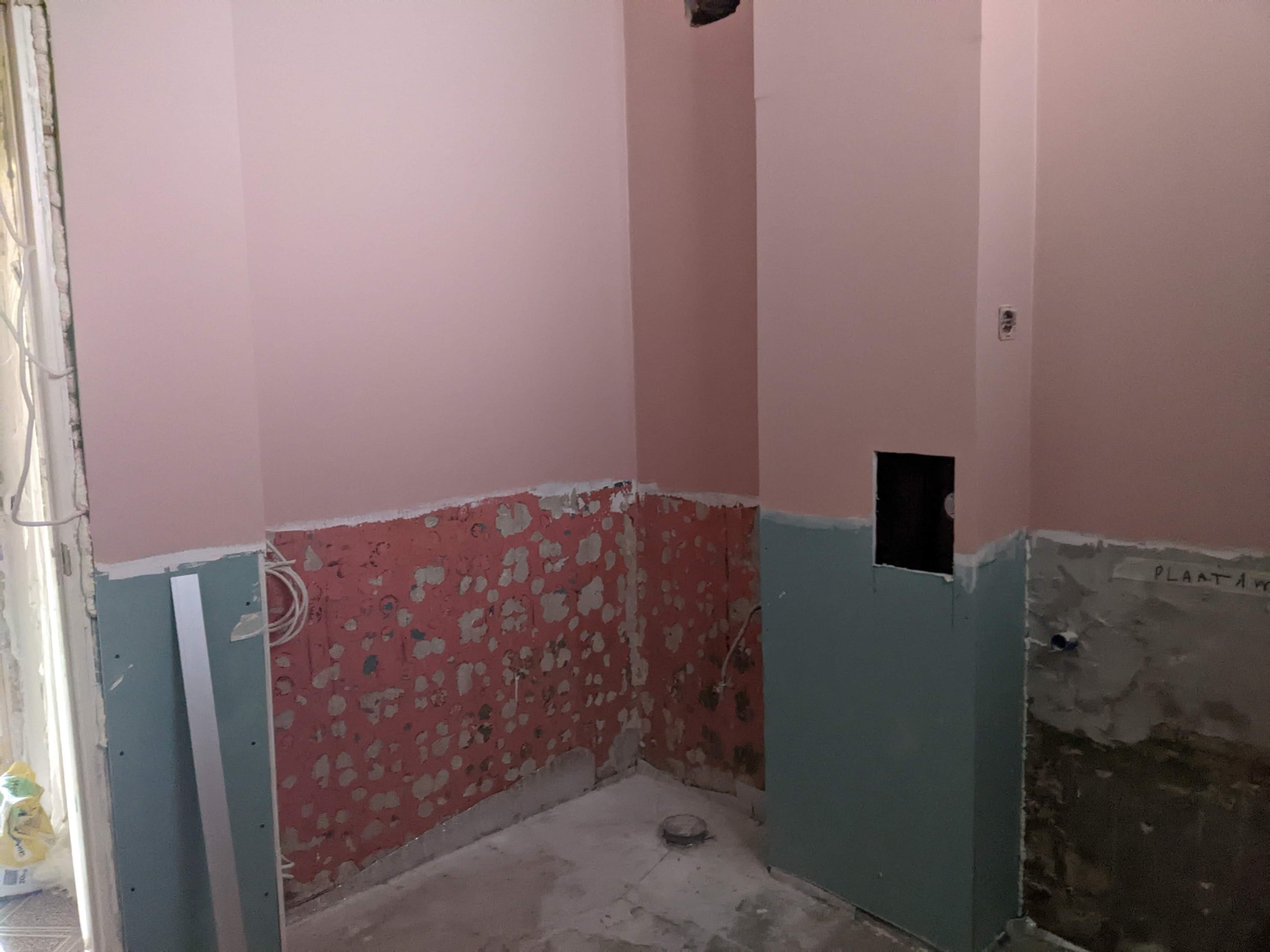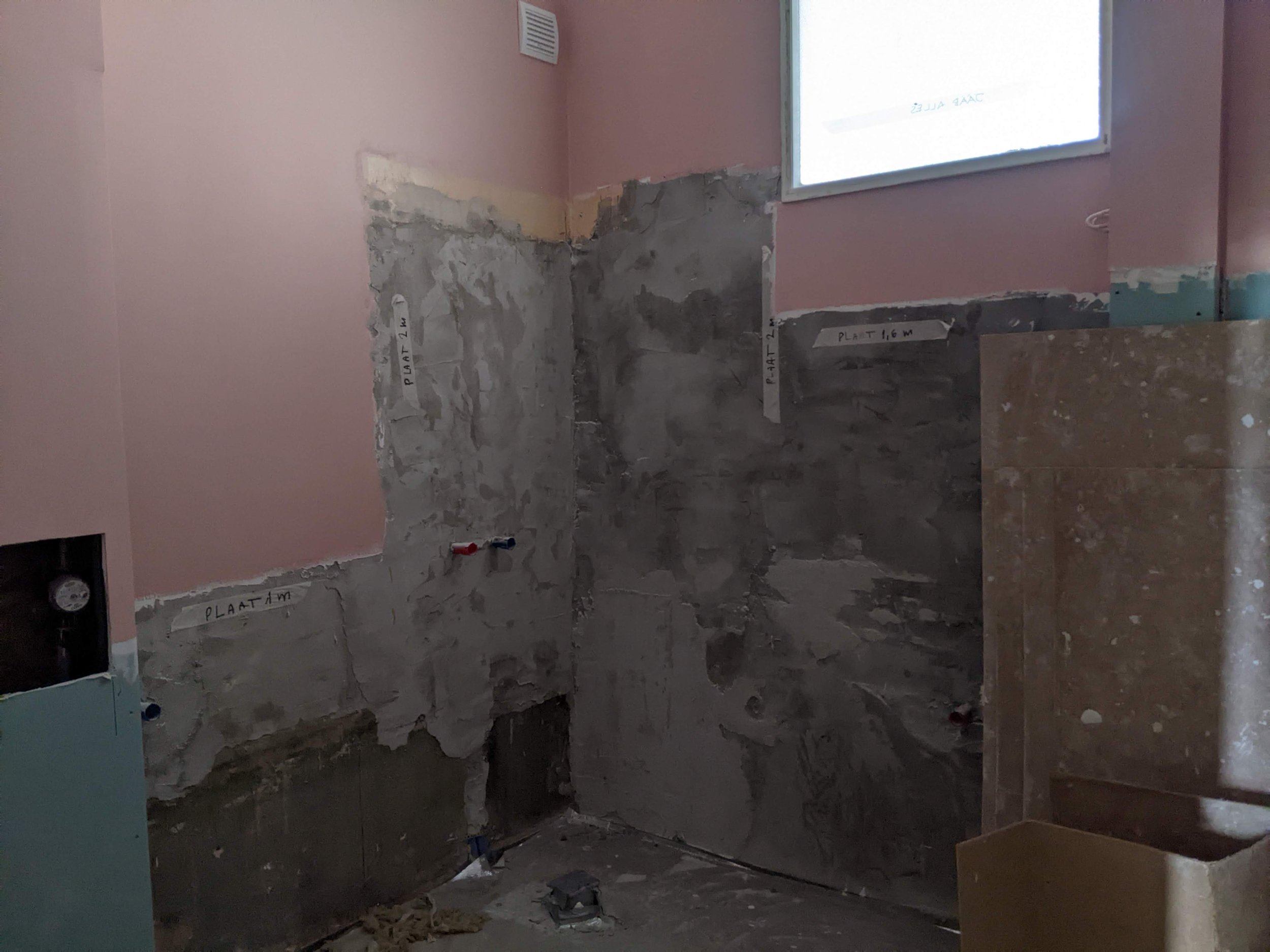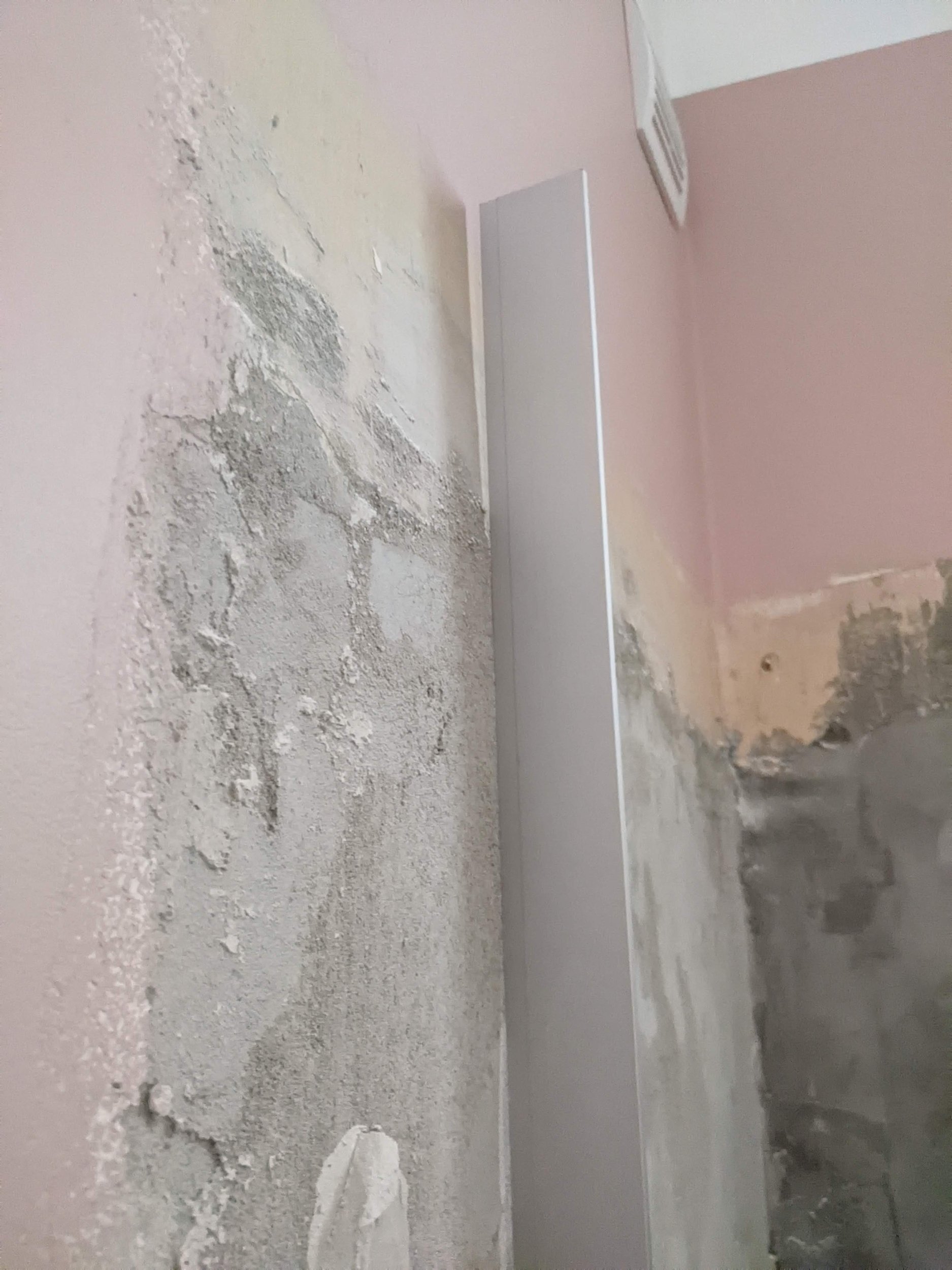 Seinte alumine osa on vaja tasandada ja plaatida. Duši ja vanni juures plaatimise kõrgus 2 m, mujal 1m põranda pinnast. Võib arvestada, et keskmiselt 1,5 m on plaatimise kõrgust. Osaliselt kipsist sein, osaliselt krohvitud sein, valge sein on üsna sile, krohvitud sein lainetab. Vannitoal on nurkasid ja 2 šahti. Ühe koha peal on seinas kõrgem koht, mis oleks vaja maha võtta, muhu pindala 10x70 cm umbes, muhu enda kõrgus on kuni 1 cm. Hüdroisolatsioon plaatide alla