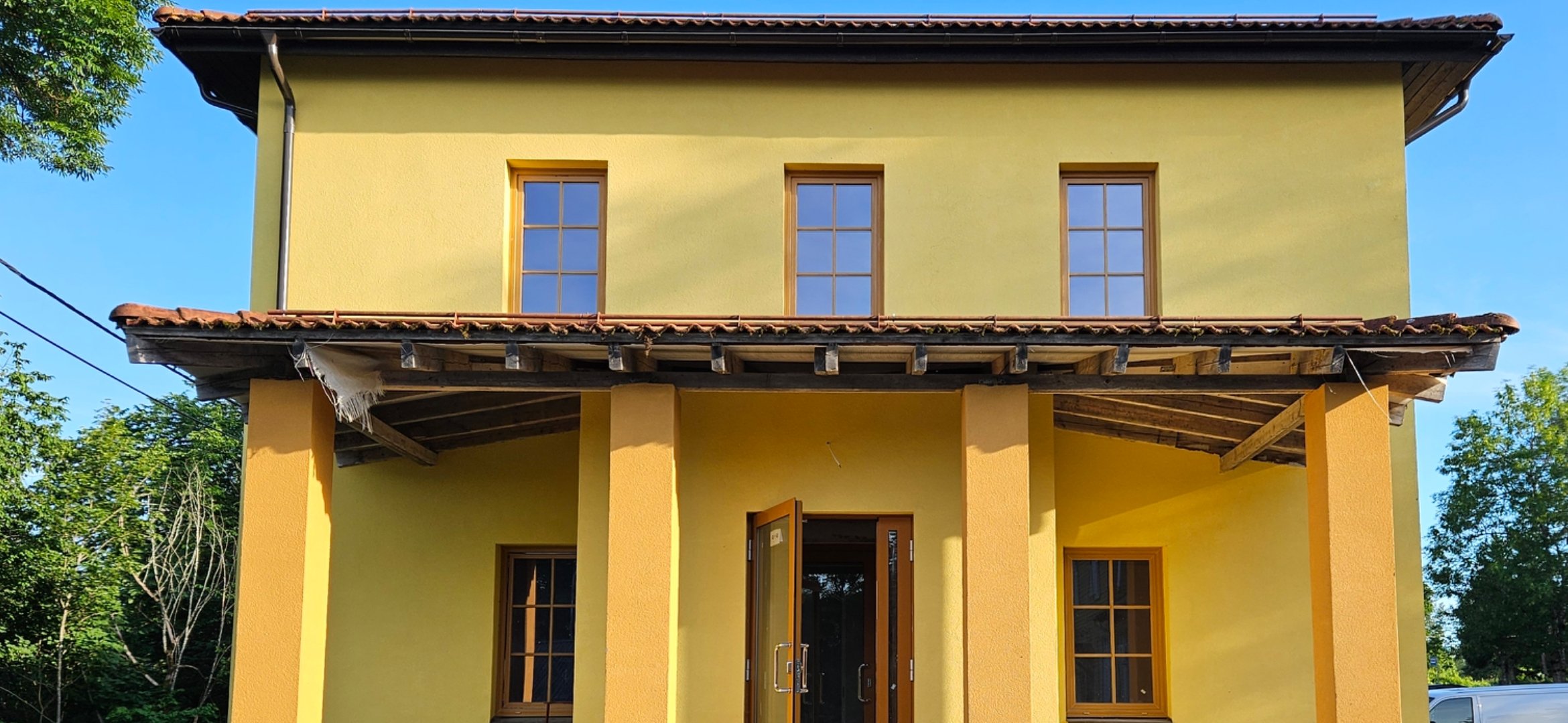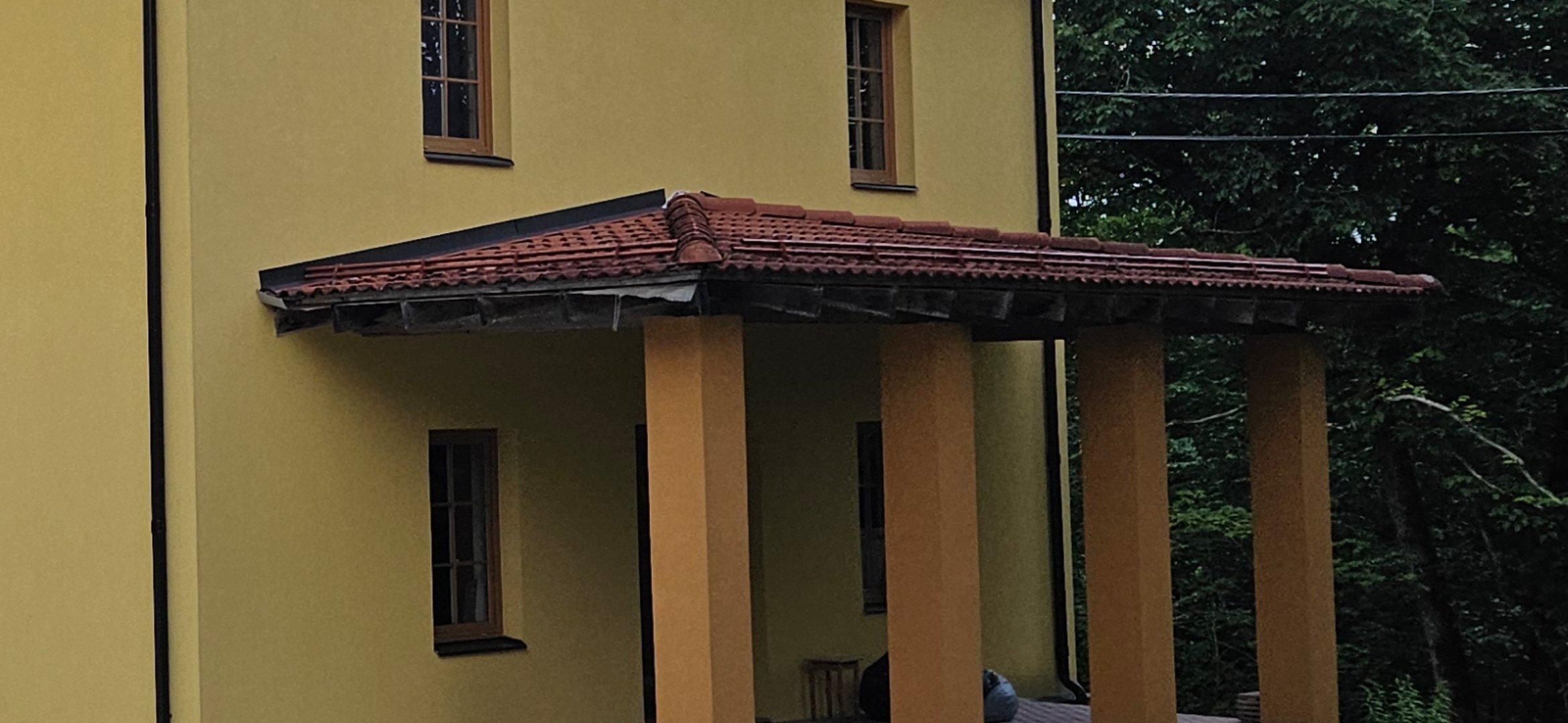 Maja kahel otsal trepi terrasside osa tuulekastide lõpuni ehitus, ühel maja küljel katuse aluse sulgemine ilmastikule.