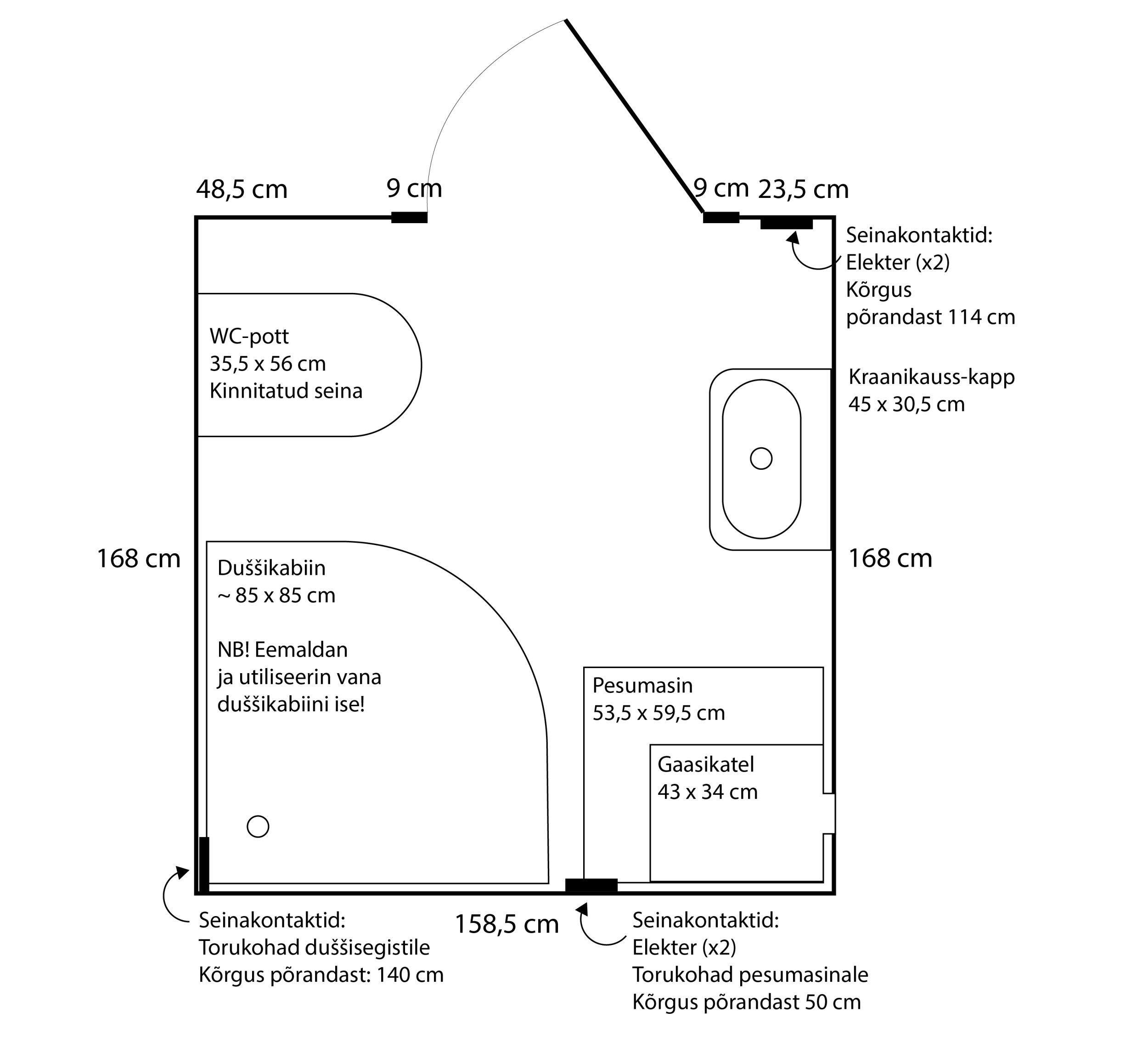 Vana duššikabiin on amortiseerunud. Ilmselt on toimunud selle alt niiskuse lekkimine, millele viitab põrandaplaatide loksumine. Enne põranda remonti demonteerin ja utiliseerin praeguse duššikabiini. Uue pesemisnurga või duššinurga täpse lahenduse otsustaksin praeguste põrandaplaatide eemaldamise ja kahjustuste ulatuse selginemisel. Soovil ja oskustel võib põranda remonditööle lisanduda hiljem veel duššilahenduse paigaldus (NB! Kuid seda teenust antud hinnapakkumises palun mitte kajastada).