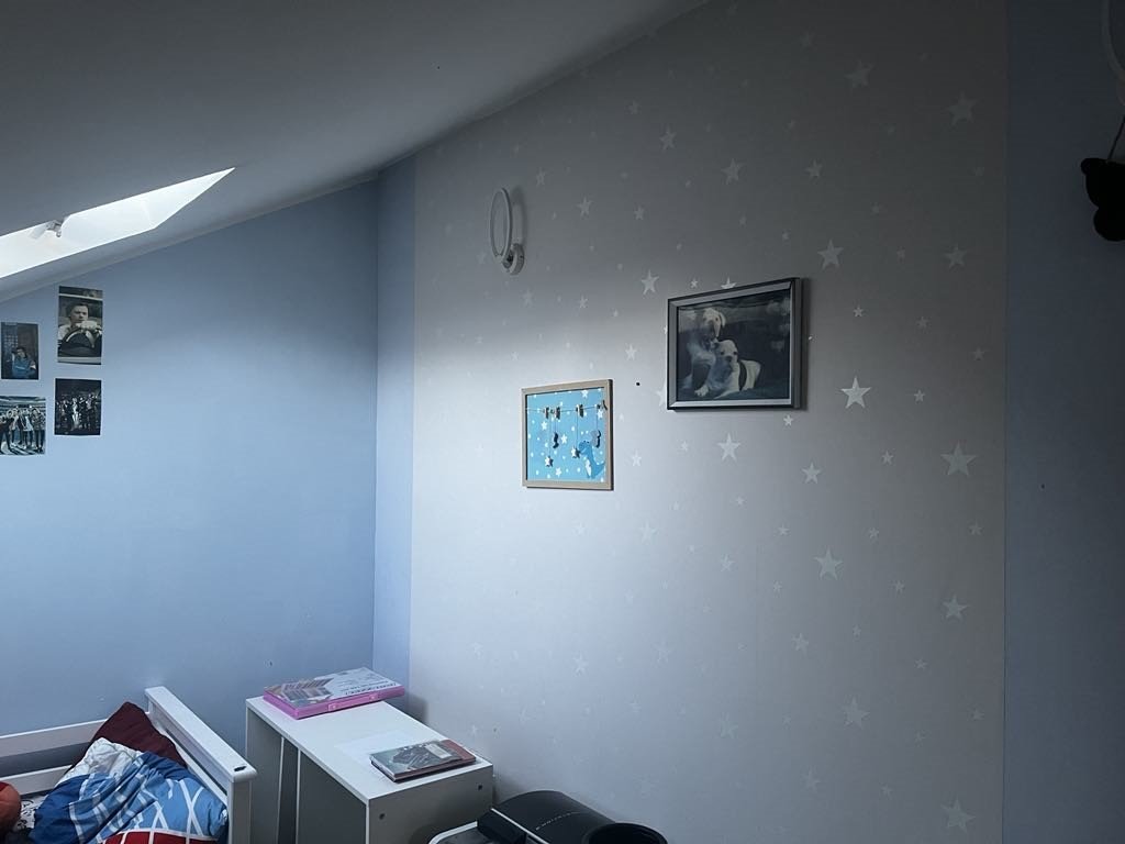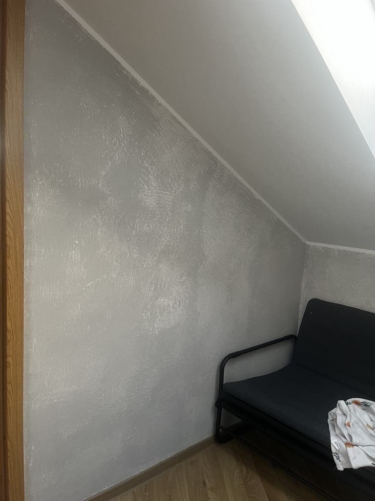 Värskendust vajavad 2 lastetuba ja trepipealne väike koridor. Tubades on vaja eemaldada tapeet (alustame juba ise). Tapeet on ühes toas ühes seinas ja teises toas kahes seinas. Täita augud, pahteldada/ lihvida, kui on vaja. Koridoris kõik sama- vana krobeline värv maha, augud täita jne. Aknapaled samuti (ühelt pildilt on näha). Lõpetuseks värvida KÕIK valgeks. Töövahendid Teie poolt (kindlasti on midagi ka meil), materjalid koostöös töömehe nõustamisega ostame ise. Kuna tegemist on katusetubadega, siis tuleb korda teha ka laed- sama, mis tubadel.