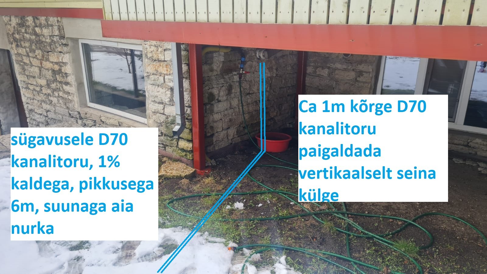 Esmalt kaevata ca 40-50 cm sügavune kitsas kraav, kuhu mahub kalde alla D70 mm kanalitoru.