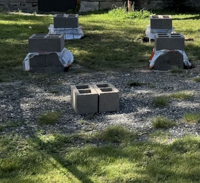 Konteineri ja välise pelletimahuti jaoks vundamendipostide ehitus - 12 tk. Posti kõrgus maapinnast ~40 cm. Igas postis: killustikupadi ~15-20 cm, 4 õõnesplokki (190X190X390) 2-s reas teineteise peal, armeering, täis valada betooniga.