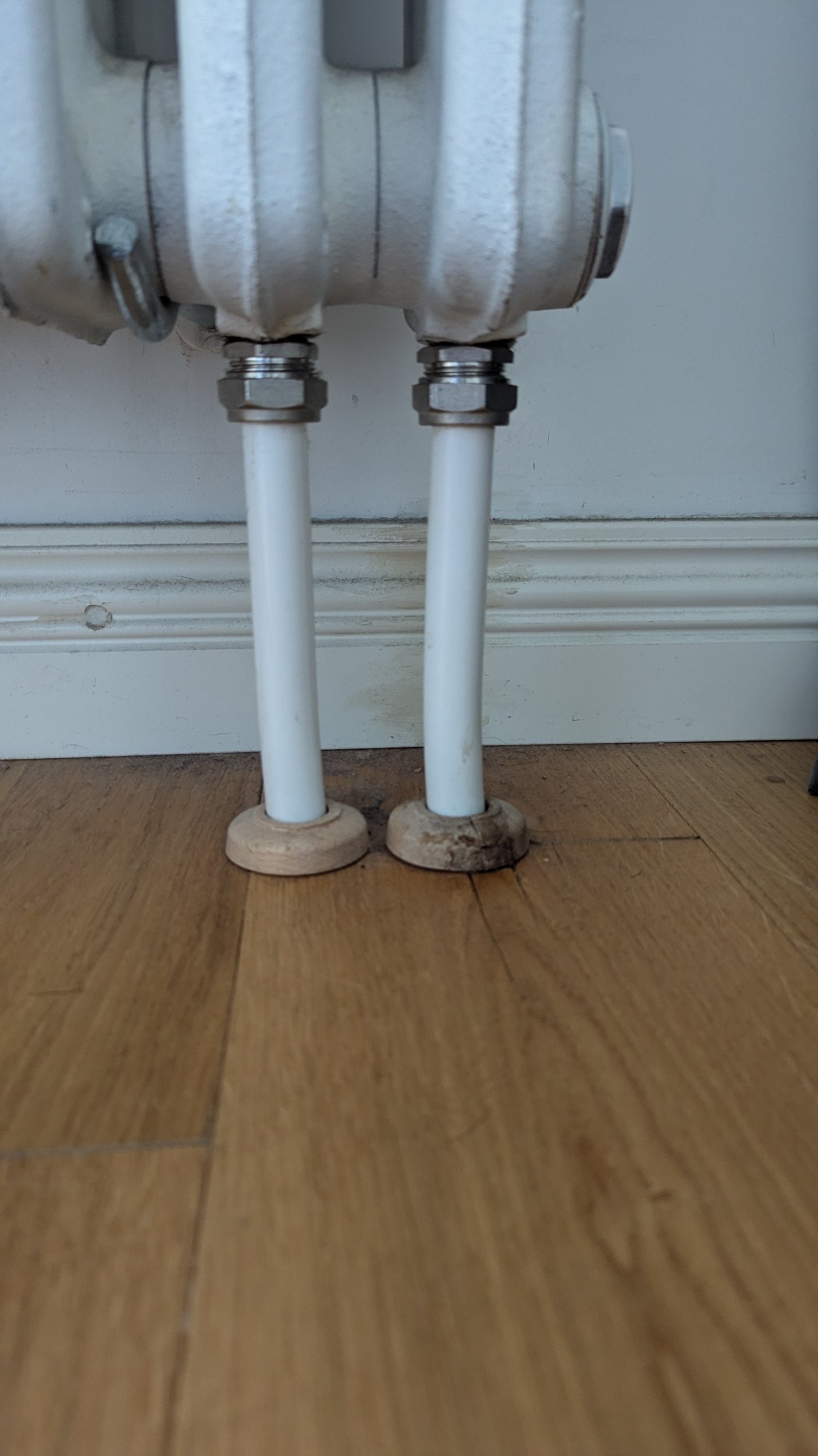 Vajalik on vahetada radiaatorisse siseneva toru tihendid mis lekivad ja äkki ka tagasivoolu tihendid kui juba kangutamiseks läheb. (aluplex). Süsteem paigaldatud 2017 a. Süsteem on hetkel survestatud ja leket otseselt ei toimu. Lekib siis kui vee sooojendus tööle panna. Kanduritele toetuv Malmradiaator.