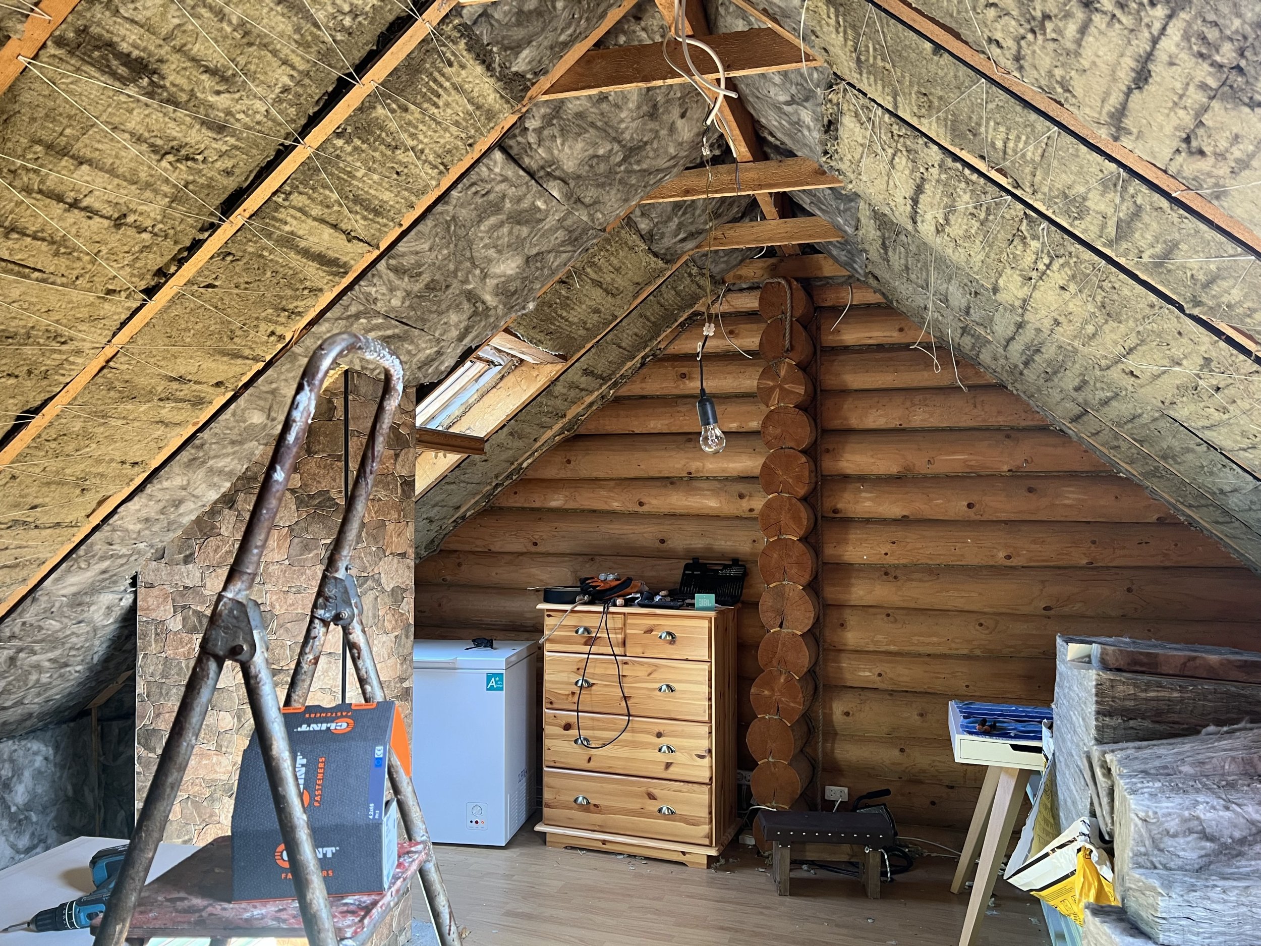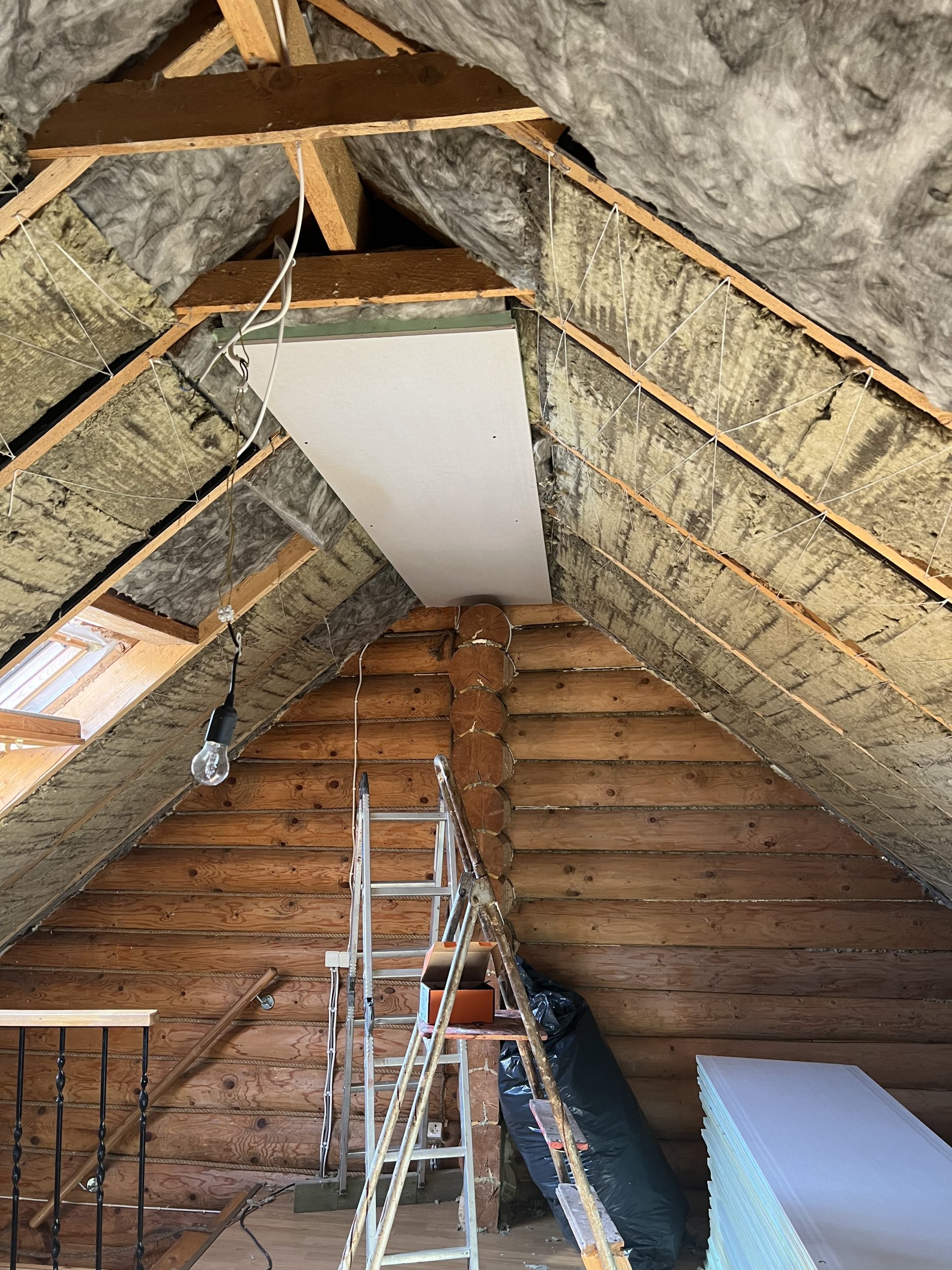 - vahtplast kipsplaatide paigaldus kaldlaele + seina osale, järgides otstes ümarpalgi kontuuri