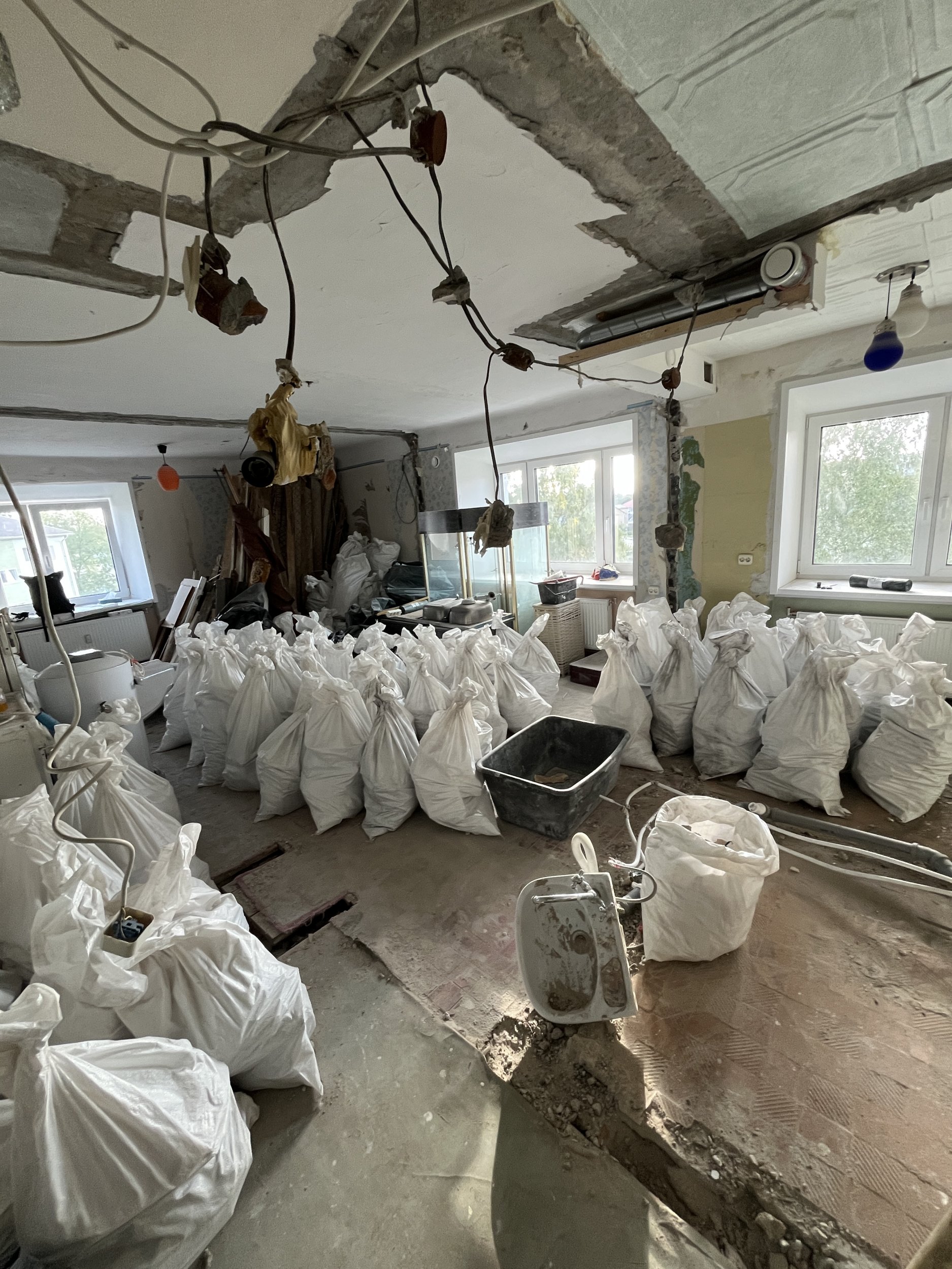 Korteris olev WC sein oli ehitatud tellistest, muud seinad olid puidu põhjal. Seinte materjal on pakendatud kottidesse ja puit ning uksed on laotud eraldi hunnikusse.