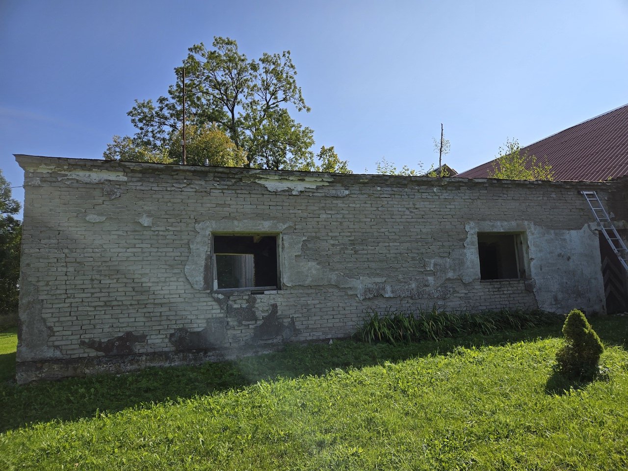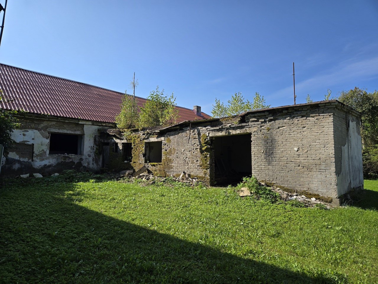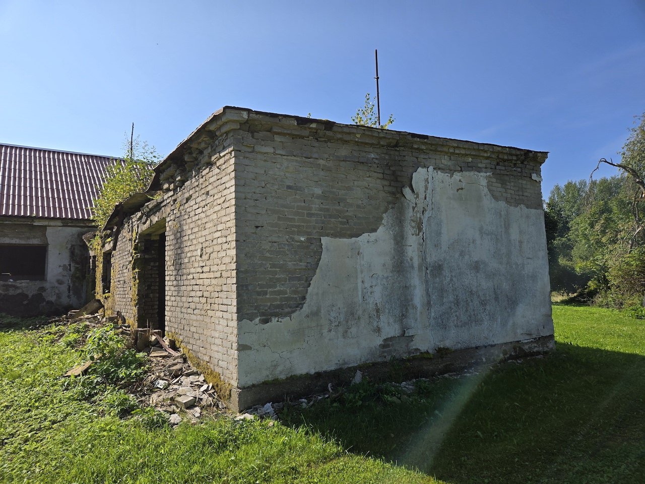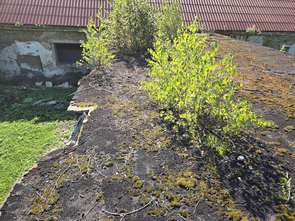 Kõrvalhoone lamekatus ca 96m2 on vaja puhastada vanast tõrvast ja taimedest, tasandada (vajadusel), katkised kivist räästaosad eemaldada ja paigata (nt. immutatud puidust + osb). Katus katta SBS materjaliga kahes kihis (aluskate, pealiskate), ning paigaldada uued räästaplekid.