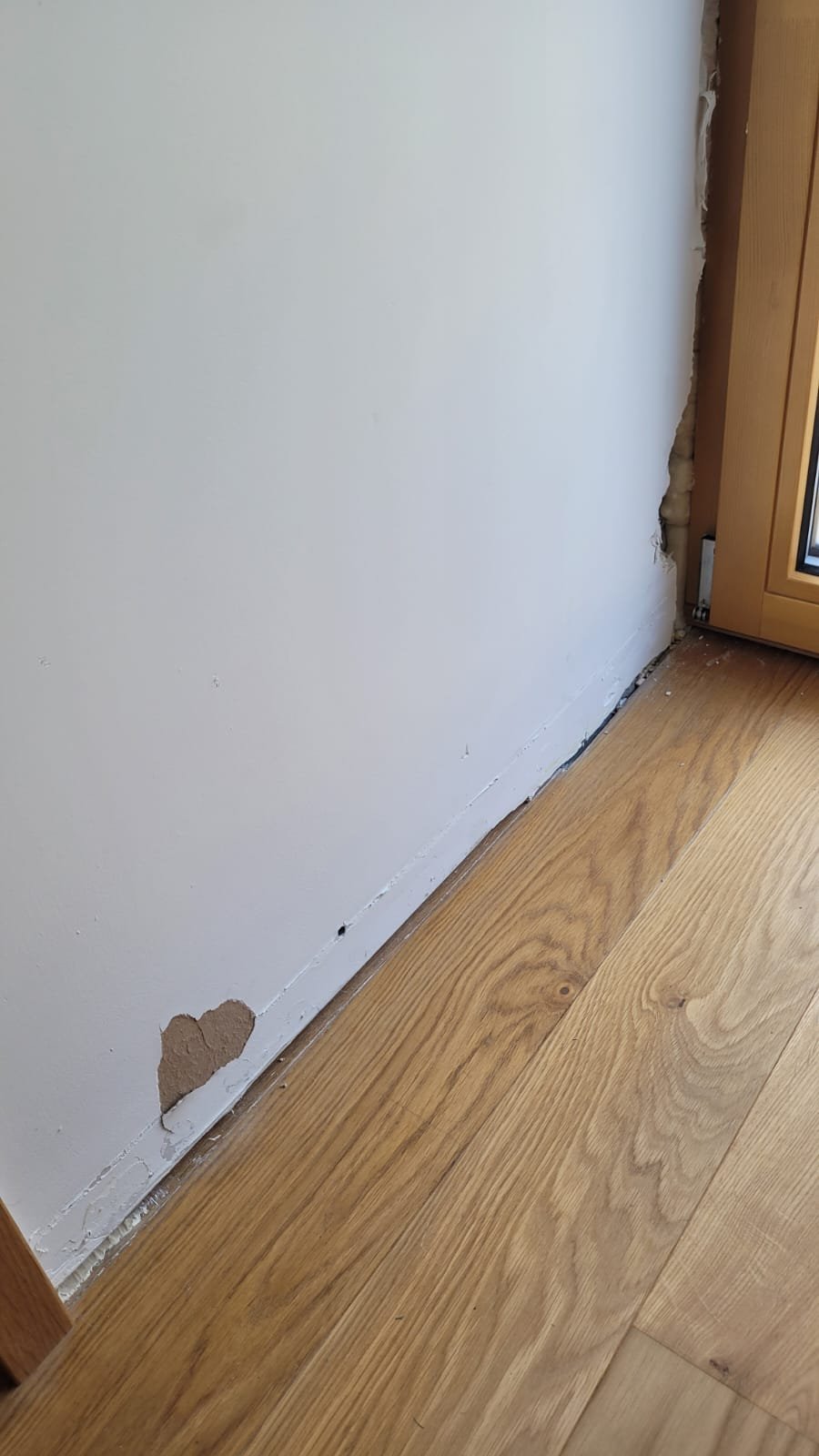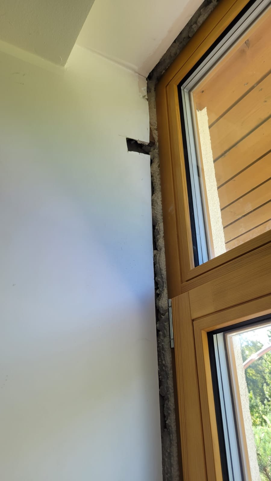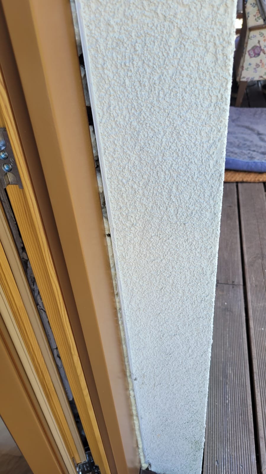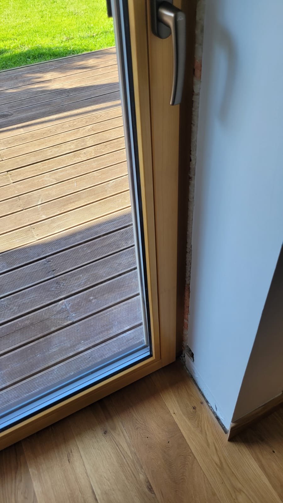 Äsja paigaldatud üks terrassiuks vajab palede viimistlust. Fotol on näha ka liistu eemaldamisest tekkinud kahju seinale, mida peaks parandama. Õuepoolses küljes on parempoolse külje alumine serv praoga - vajab silikooni vms (vt. foto õuest). Paigaldada ka 2 põrandaliistu tagasi. Seinavärvikood on olemas.