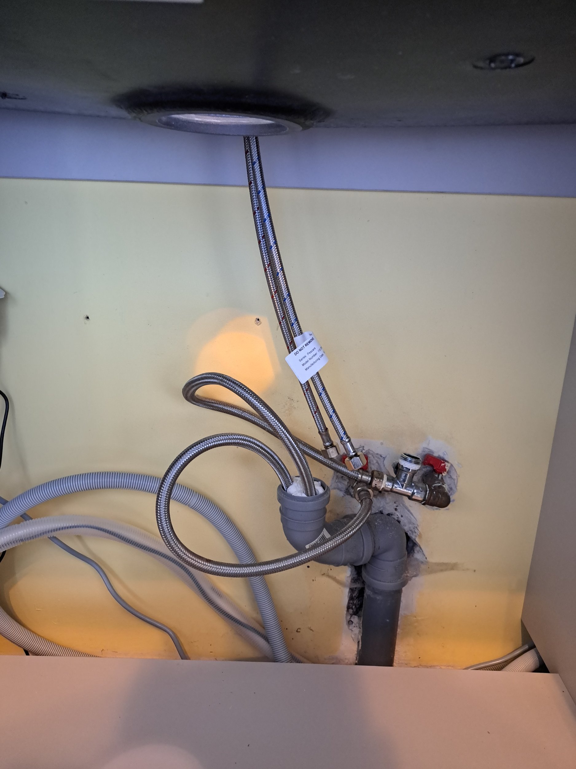 Uue köögimööbliga koos paigaldati uus valamu, segisti ja nõudespumasin (Bosch). Seadmed oleks vaja ühendada veega ja kanalisatsiooniga. Vajalikud torud/voolikud on piisava pikkusega veetud. Valamuga originaalis kaasas olnud tarvikud on kõik olemas. Lisaks on vaja vahetada wc poti survevoolik, mis hakkas potipoolsest otsast lekkima.