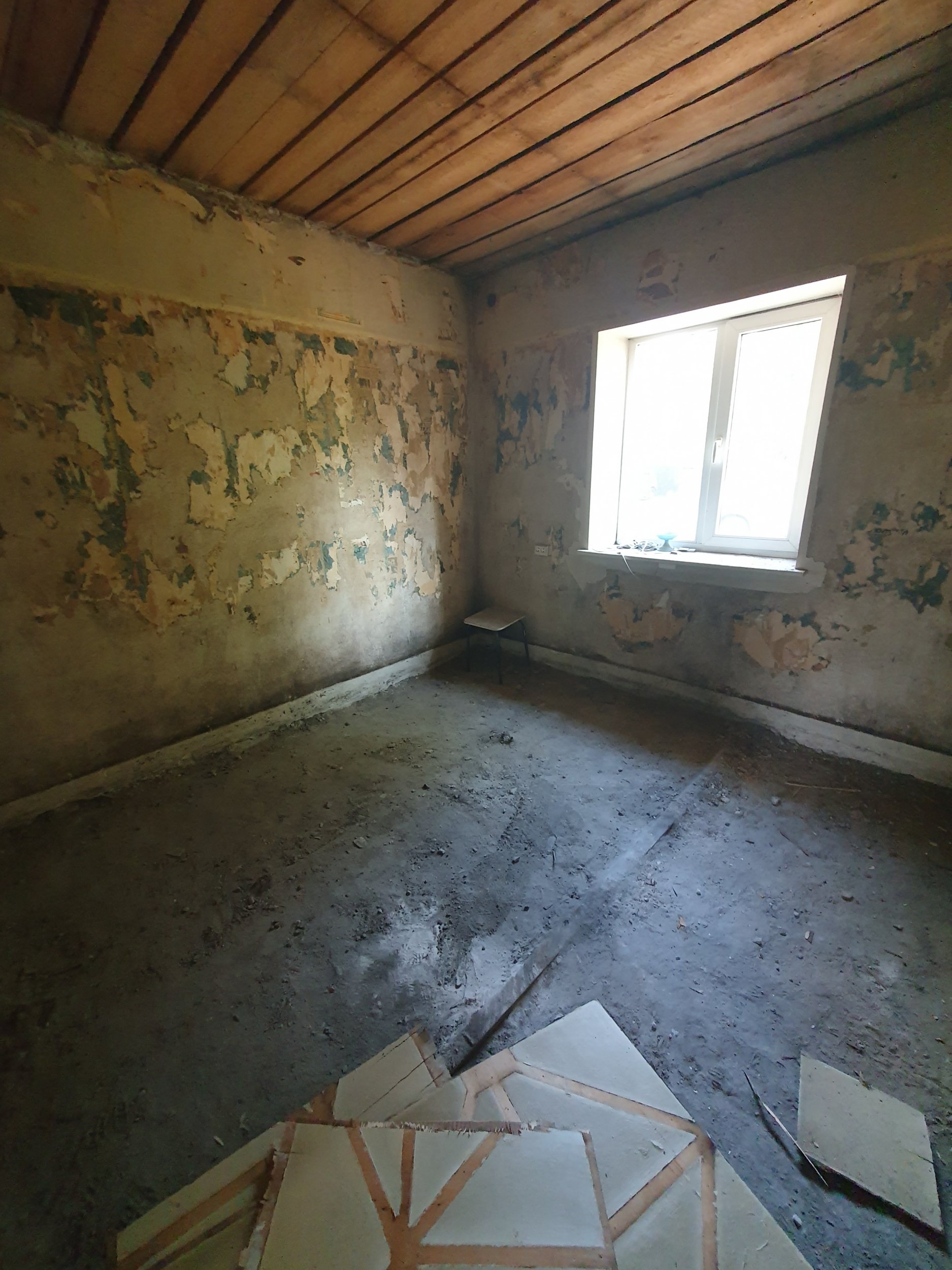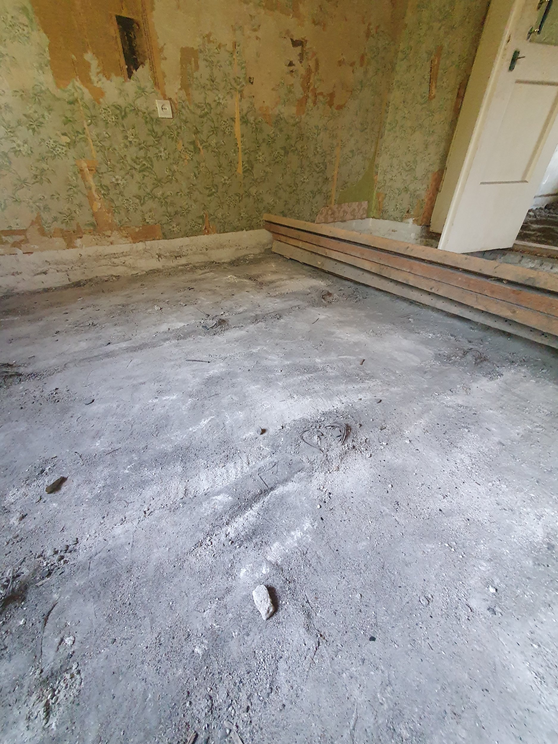 Hetkel ruumides ebatasane betoon vahelagi raudteerelsidel, mis betoonist välja ulatuvad osaliselt. Selle peab tasandama, sinna peale soojustus, kile, armatuur (5mm ja 150mm silm) küttetorustik ja valu. Arvestades ruumi suurust siis tuleb jätta ~10mm paisumis ja montaaživuugid. Paigaldada valuga õhutermostaadi põrandaandurid, vastavalt joonisele (andurid minu poolt). Soojustusest jääb välja ahju ja vaheseina alla jääv ala, mis tuleb lihtsalt valada. Küttekollektor on paigaldatud ja torustik tuleb sellega ainult ühendada ning survetestida enne valu. Ruumideks on kogu esimene korrus, 4 ruumi näol, millel kõigis tuleks põrand valada samasse tasapinda (uksepiidad eemaldan).