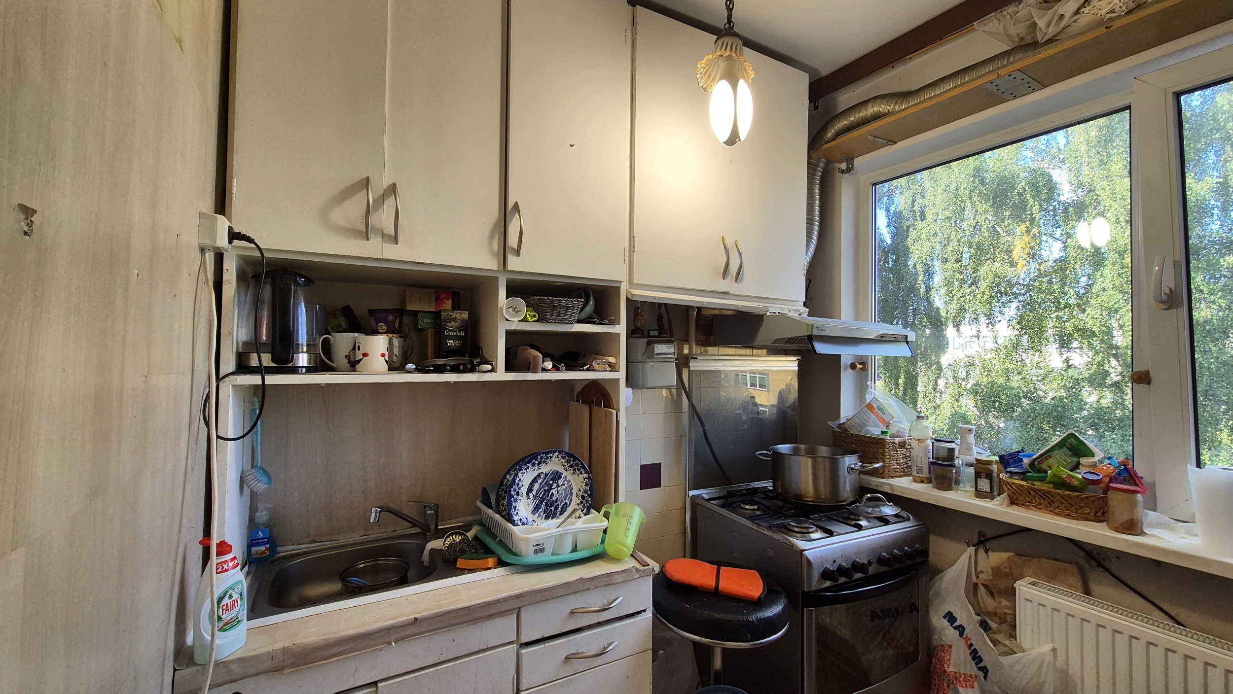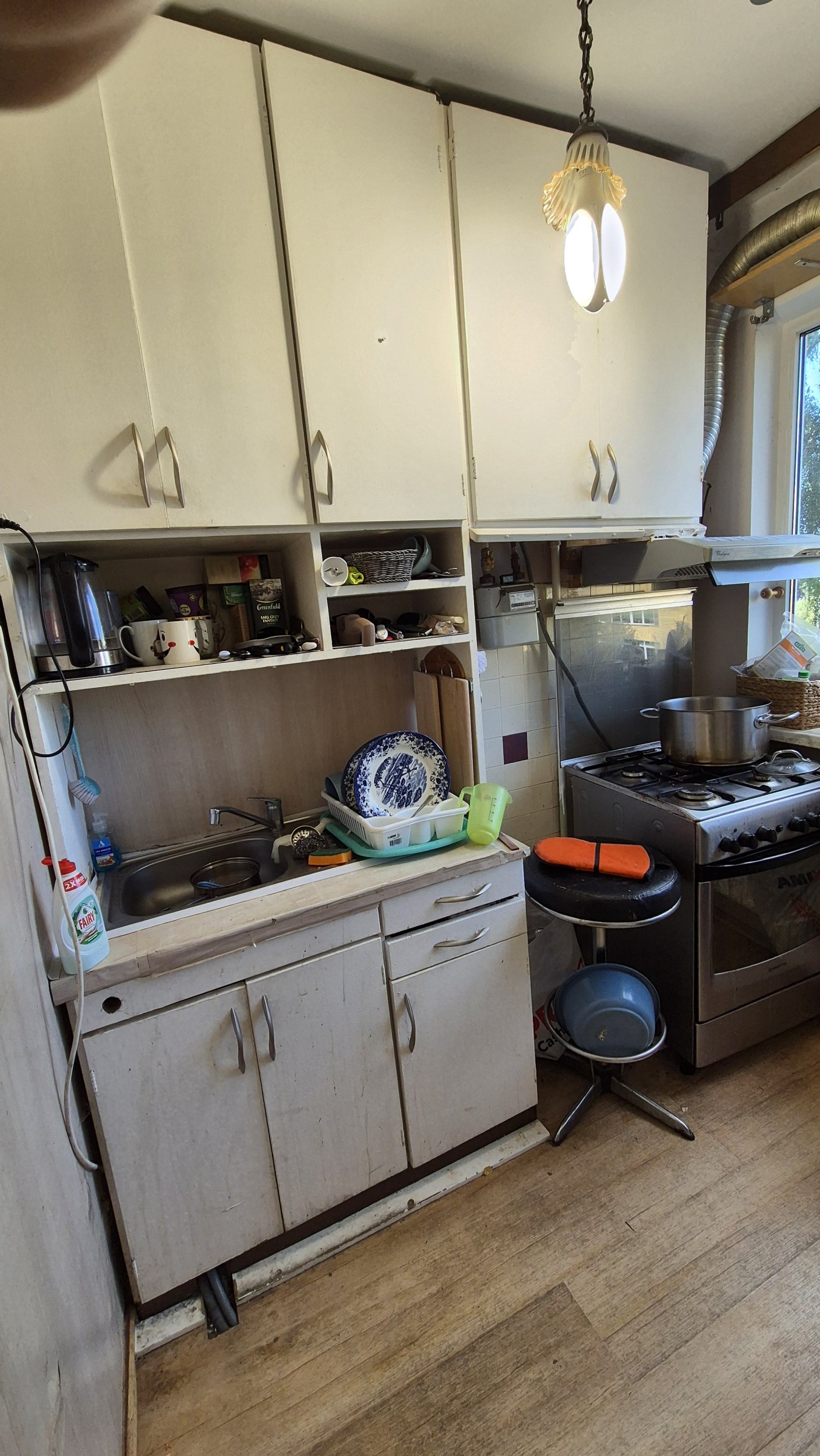 Just need to remove the existing kitchen, sink and the kebinets and replace with the new one.. Also the side wall needs a wallpaper i have the wallpaper you need to install that.. No need to do anything with the stove oven.. That will remain as it is.