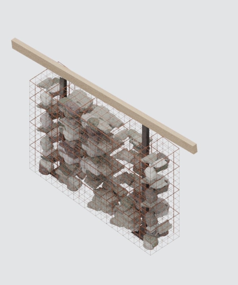 - Gabioonide sisse vertikaalsete metallpostide asetamine 4tk (fikseeritud lõplikult ehitusjäägi poolt, vajab ajutist tuge täitmise ajal)