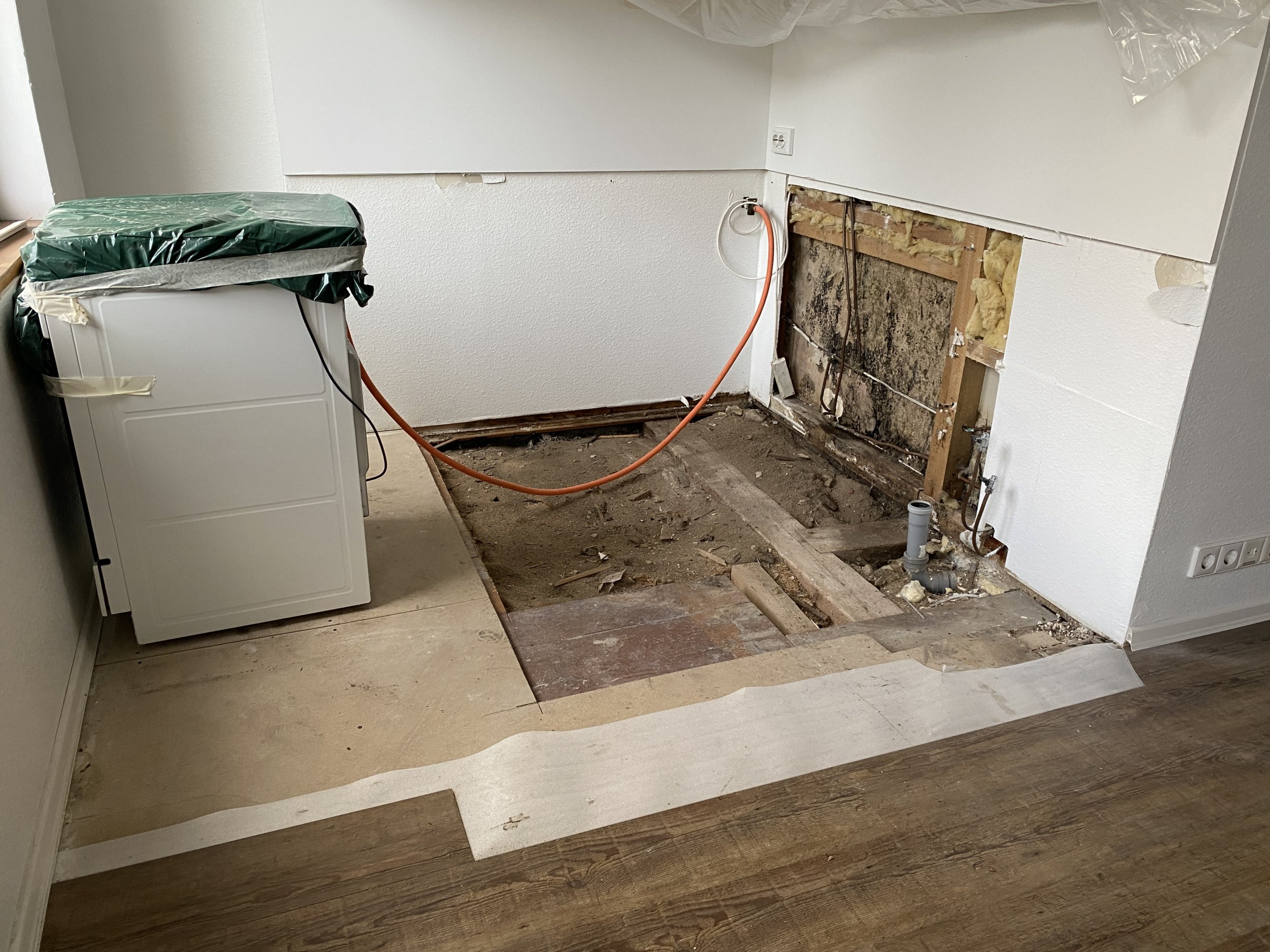 Korteris veekahjustus, mis on tulnud köögi ja vannitoa vahelise seina seest pikaajalisest vasktoru lekkest. Kindlustus võttis lahti köögi ja seina, et leke leida, kuid kuna see pole kindlustusjuhtum, siis oleks vaja nüüd teha vannitoa kapitaalremont, taastada sein, vahetada katkine torustik, taastada köögipõrand (uued OSB plaadid ja vinüülparkett peale) ja paigldada köögimööbel.