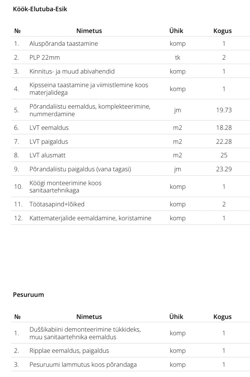 Pakkumine Teie hankele töö+materjal (v.a LVT, plaadid, mööbel, tehnika) Lugupidamisega |