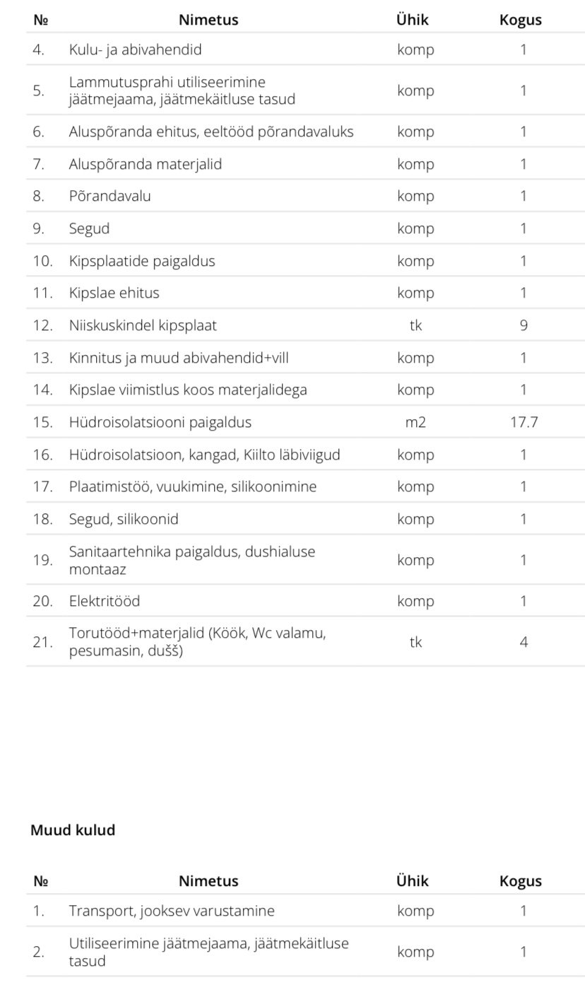 Viimistlusmaterjalid ei kuulu hinna sisse. |