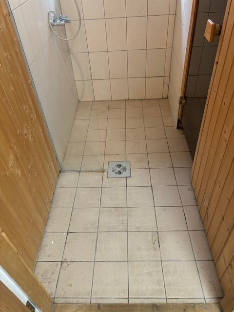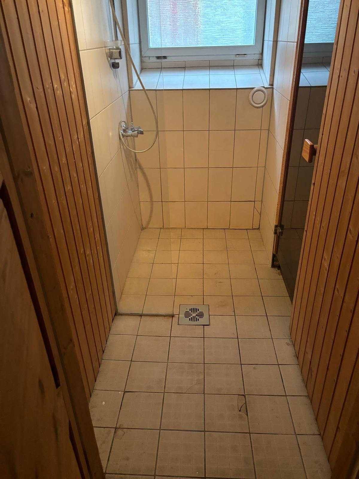 Vaja oleks eemaldada vanad plaadid koos vajaliku aluskihiga ja plaatida uuesti. Hüdro ja kalle vee äravooluks oluline.. Sein 2.12m x1.12m dushi pool, aknaga osa kõrgus ja laius 2.12m x1.1m ja dushi vastas paiknev sein 2.12m x 0,63m. Põrandapind dushiruumis on 2,2m x1,1m ja sauna osas (mis ei ole ega tule kasutusse saunana) 2.04m x0.9m. Korter asub sokli korrusel. Piirkond: Kalamaja, Tallinn.
