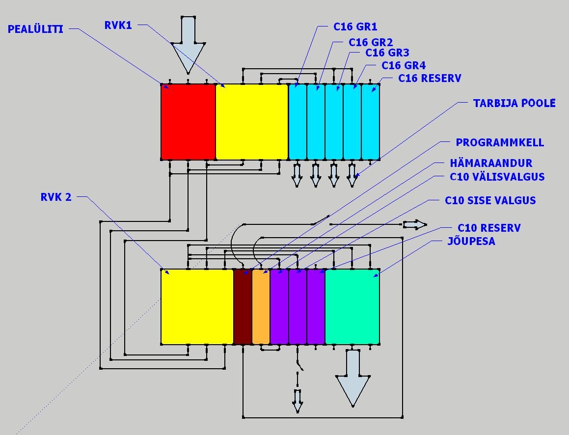 Valgusel kolme astmeline juhtimine (hämara lüliti, programmkell ja lüliti) vastavalt lisatud skeemile. Kõik moodulid tellija poolt, kilbi kokkupaneku kulumaterjalid (klemmid, juhtmed jms) töö tegija poolt. Töö teostajal peab olema vastav pädevustunnistus/kutsetunnistus mille olemasolu peab tõendama enne tööde alustamist.