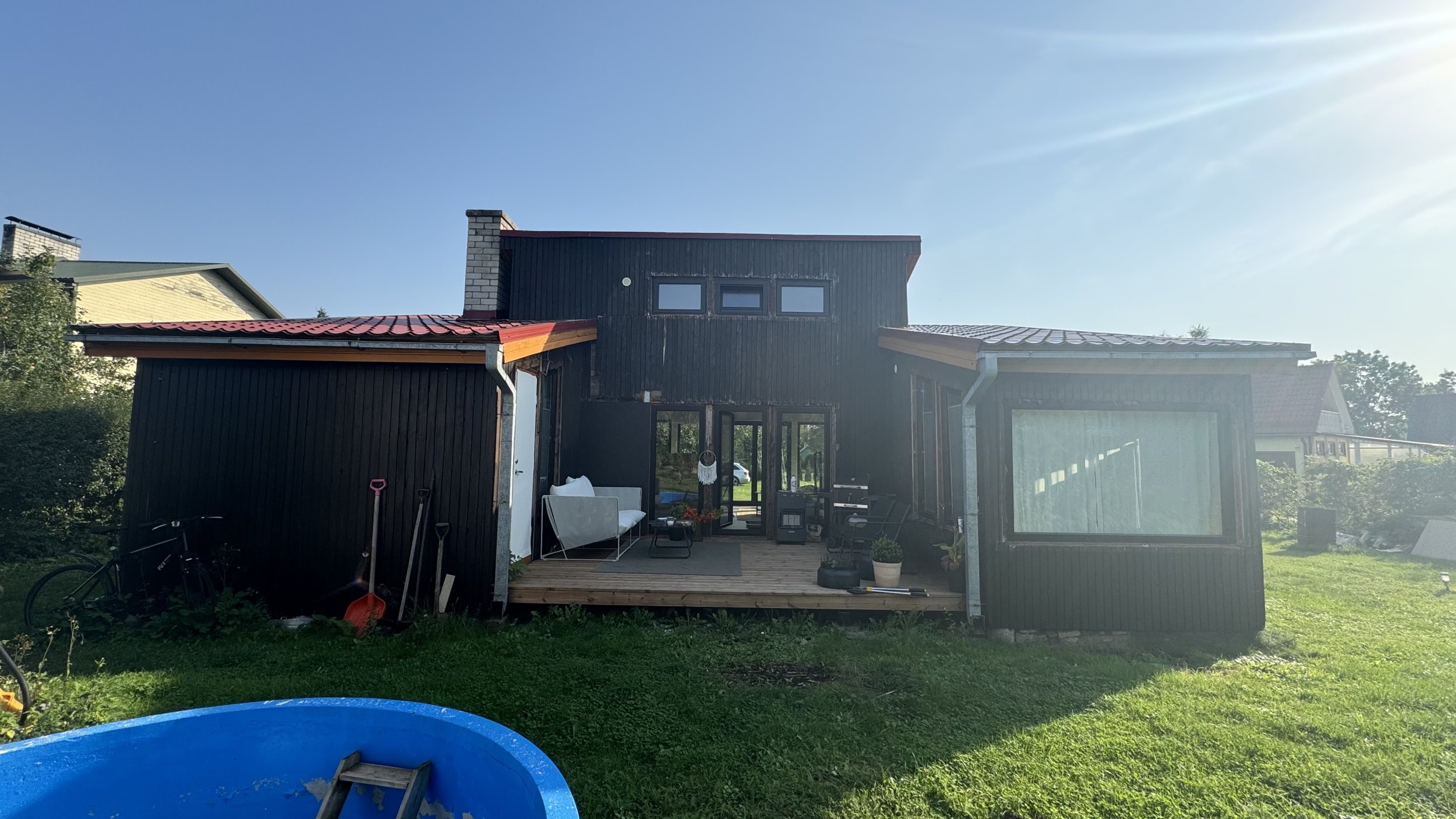 Hetkel seinas vana ja rabe poolpunn, mille all diagonaalne must laudis ja selle all omakorda karkassi vahel klaasvill, kohati ka paberleht hoidmiseks. Esmalt tuleks eemaldada pealmine laud ja veenduda, kas diagonaalne must laudis on konsktruktsiooni stabiilsusega kuidagi seotud, enda poolelt ei ole fassaadi torkinud, ega kuidagi alustanud tegemist. Enda soov ja eesmärk oleks sel sügisel väljast lahti tõmmata, avatud PUR üle lasta maja, et välistada tuule liikumine vaheseintes ning ideaalis uus puitlaudis peale panna. Soov on hoida sama seinapaksust, et mitte muuta maja väliskabariite. Samuti vajaks vahetust ka tuulekastilauad, mis on pehkinud ja oma aja ära elanud. Fassaadi laudise tüüp ja laius ei ole hetkel välja valitud, kuid eelduslikult tuleb sarnasel olemasolevale.
