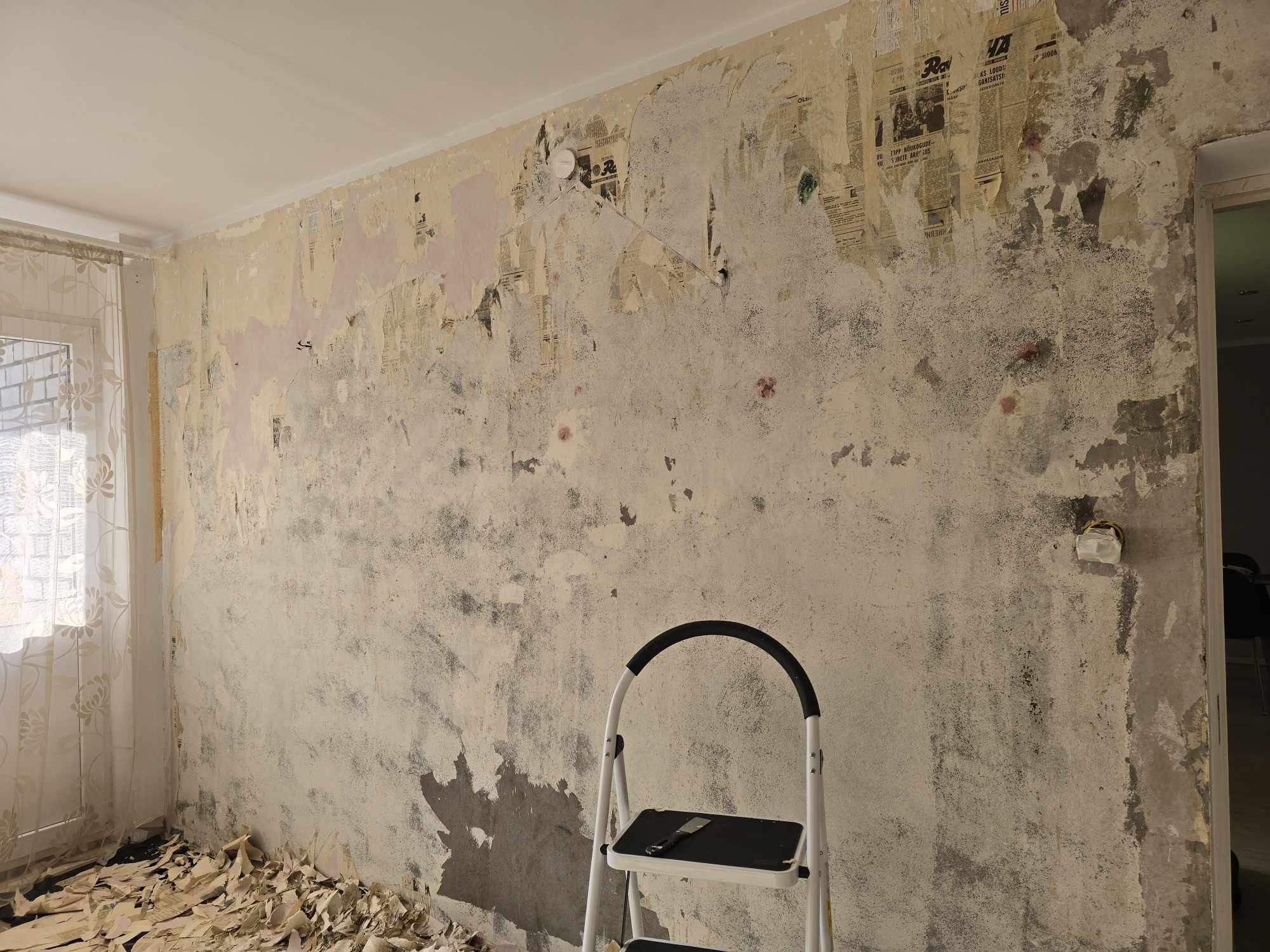 Ühes toas seina ettevalmistus tapeetimiseks + tapeetimine, teises magamistoas vajadusel tapeedi ära võtmine + uue tapeedi panek. Võib panna ka tapeedi vana tapeedi peale. Elutoa teleka taguse seina uue tapeedi panek