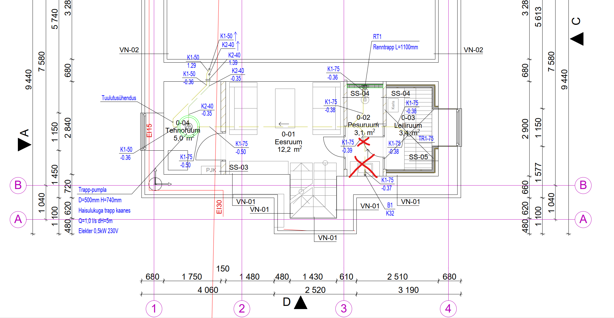 Keldri põrandasse (tehnoruumi) tuleb trapp-pumpla (nt Wilo DrainLift BOX-32/11D O). Pumpla peab olema trapiga ning haisulukuga, et seisev pesuvesi haisema ei hakkaks.