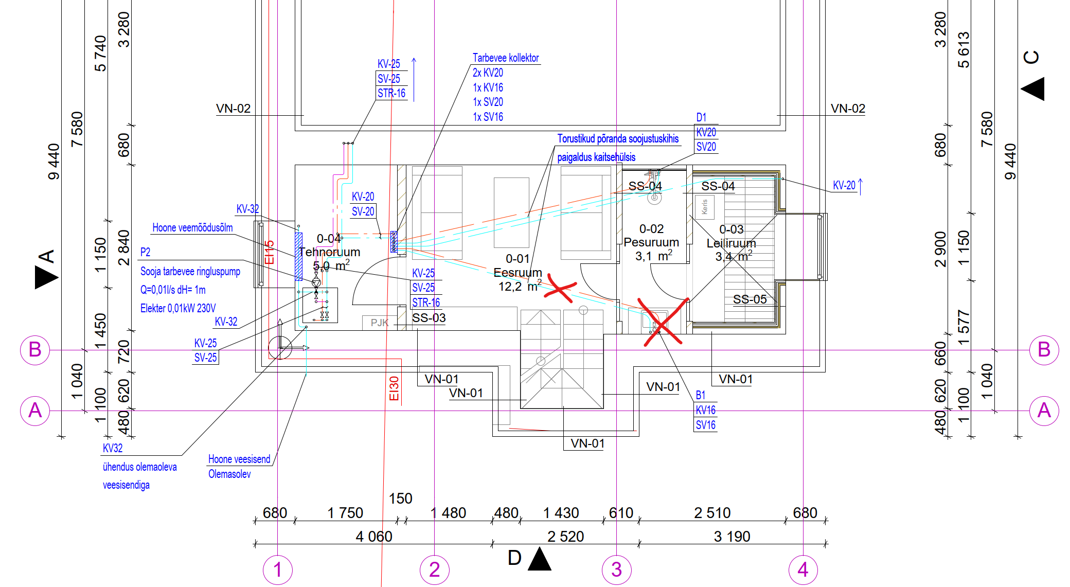 Plaanile märgitud valamut ja selle torustikku ei ole plaanis välja ehitada. Põranda alt läheb ka veetoru fassaadile (kastmiskraan). Märgitud ka plaanile. Veevarustuse sisevõrgud paigaldatakse plastmass komposiit-torudest Ø16-32mm (nt. Uponor Unipipe) ja varustatakse sulgemis- ja reguleerimisarmatuuriga. Põranda konstruktsioonis torustik paigaldada plastmassist kaitsehülssi. Veevõtuseadmete ühendused on reeglina ehituskonstruktsioonidesse süvistatud (paigaldus plastist hülsstorudes). Sisetorustikud peavad vastama PN10 tingimustele. Põrandasiseseid liitmikke olla ei tohi.