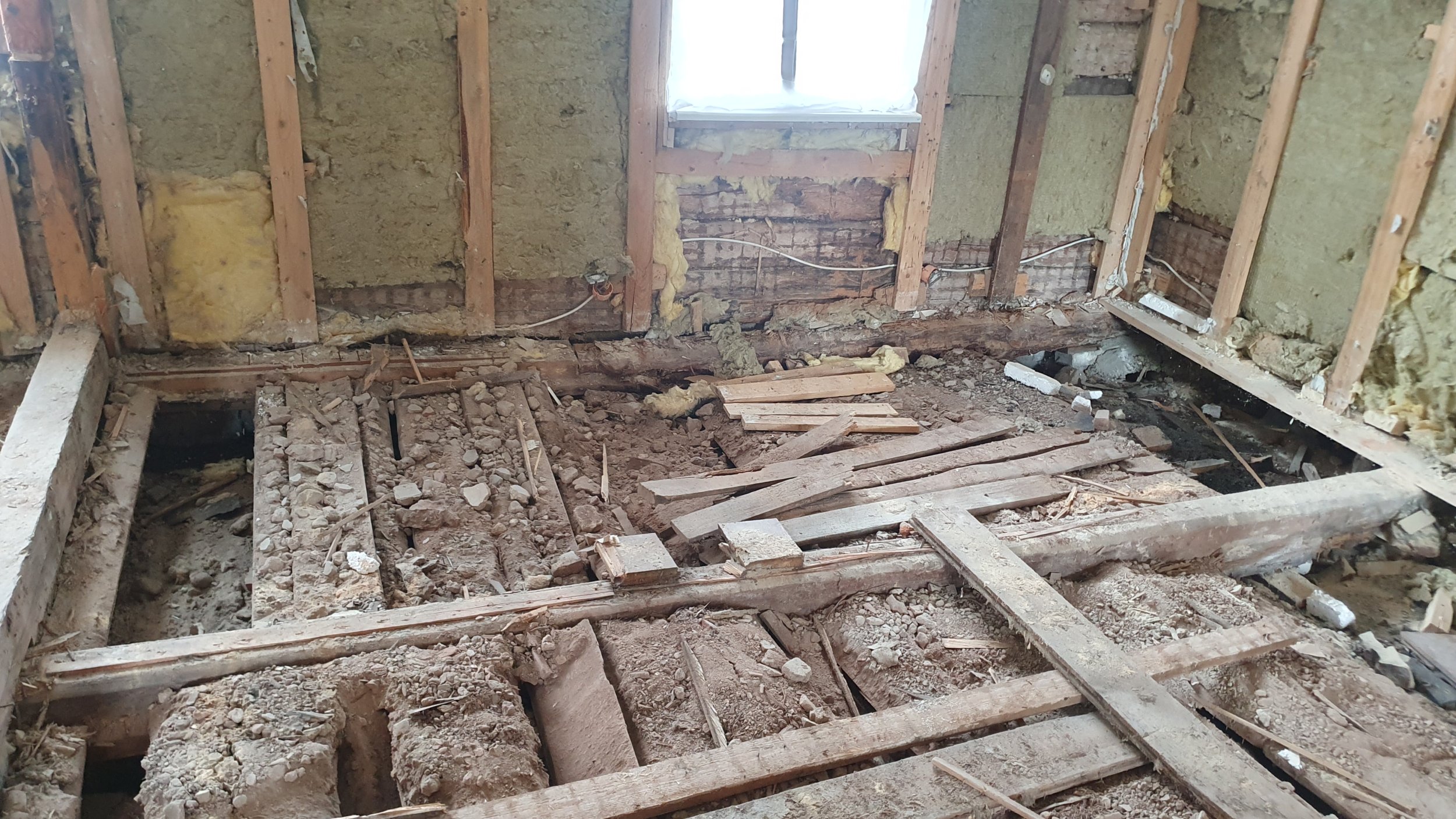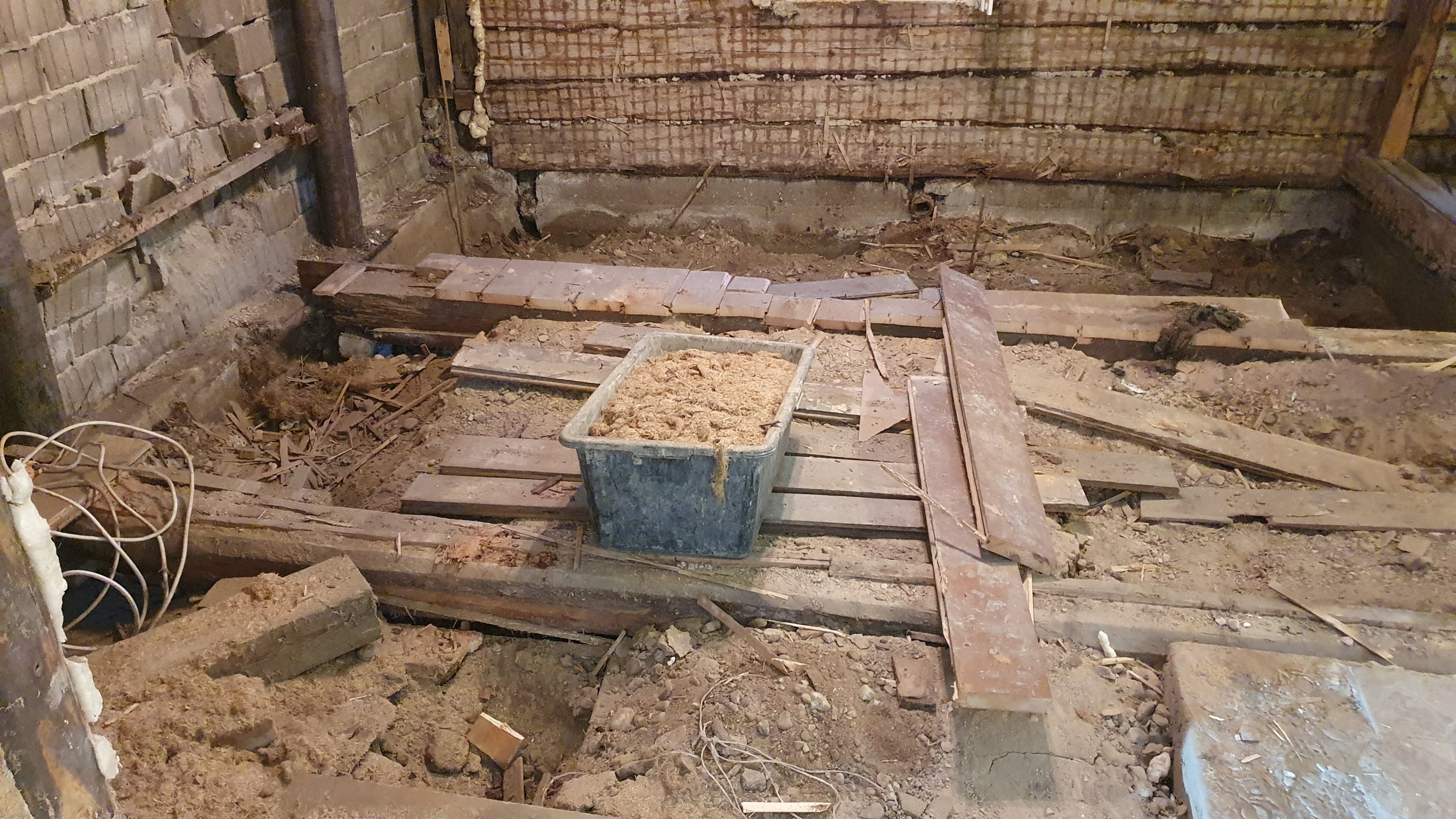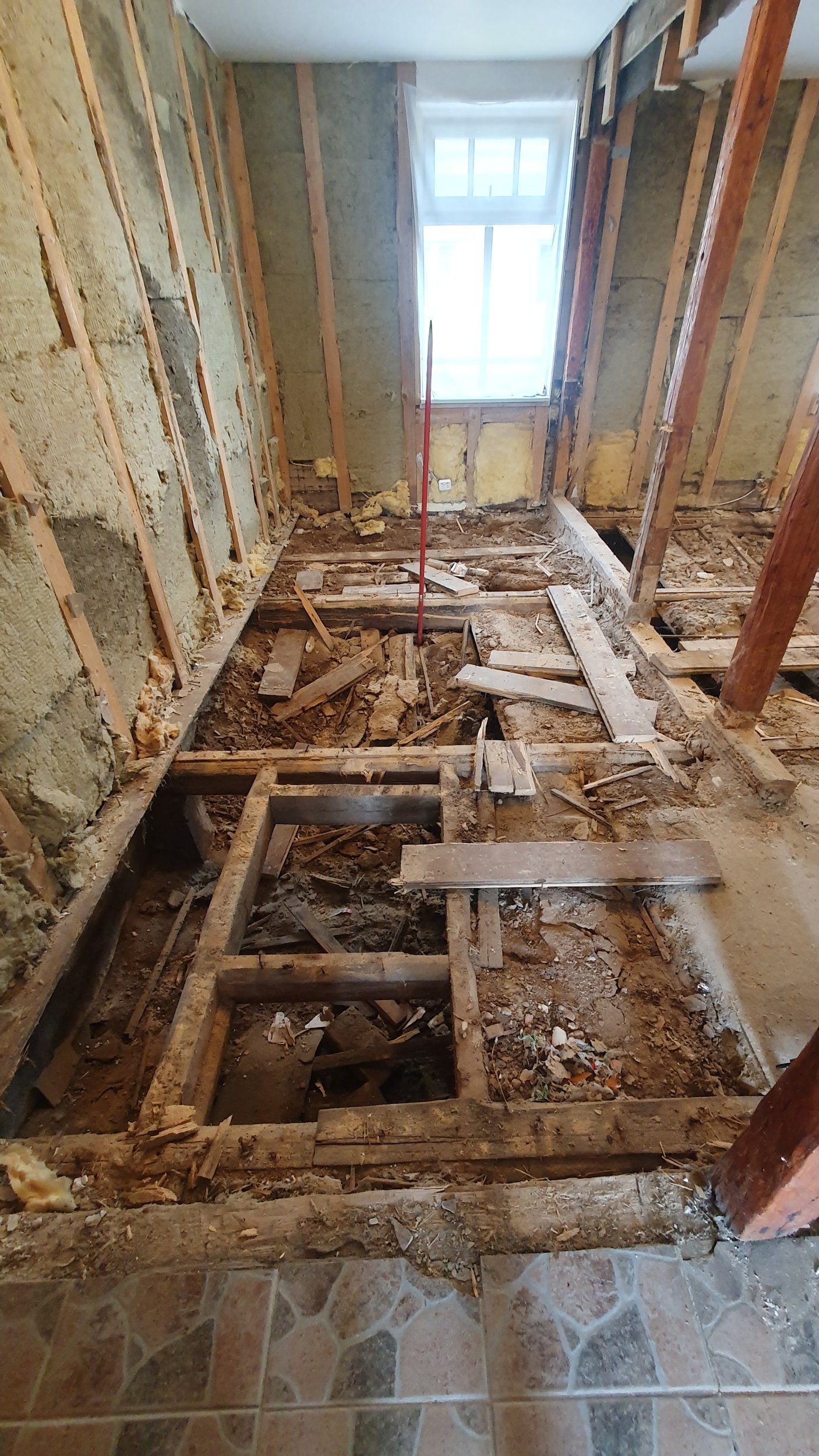 1. Vanade põrandalaudade eemaldamine (kaks kihti põrandat olen juba ise eemaldanud). Mittekandvate põrandatalade eemaldamine. Need ehk puitmaterjal utiliseerida hoone hoovipoolsesse aeda (saab välja visata akna kaudu otse akna taha), või võib töö teostaja need endale võtta küttepuudeks.