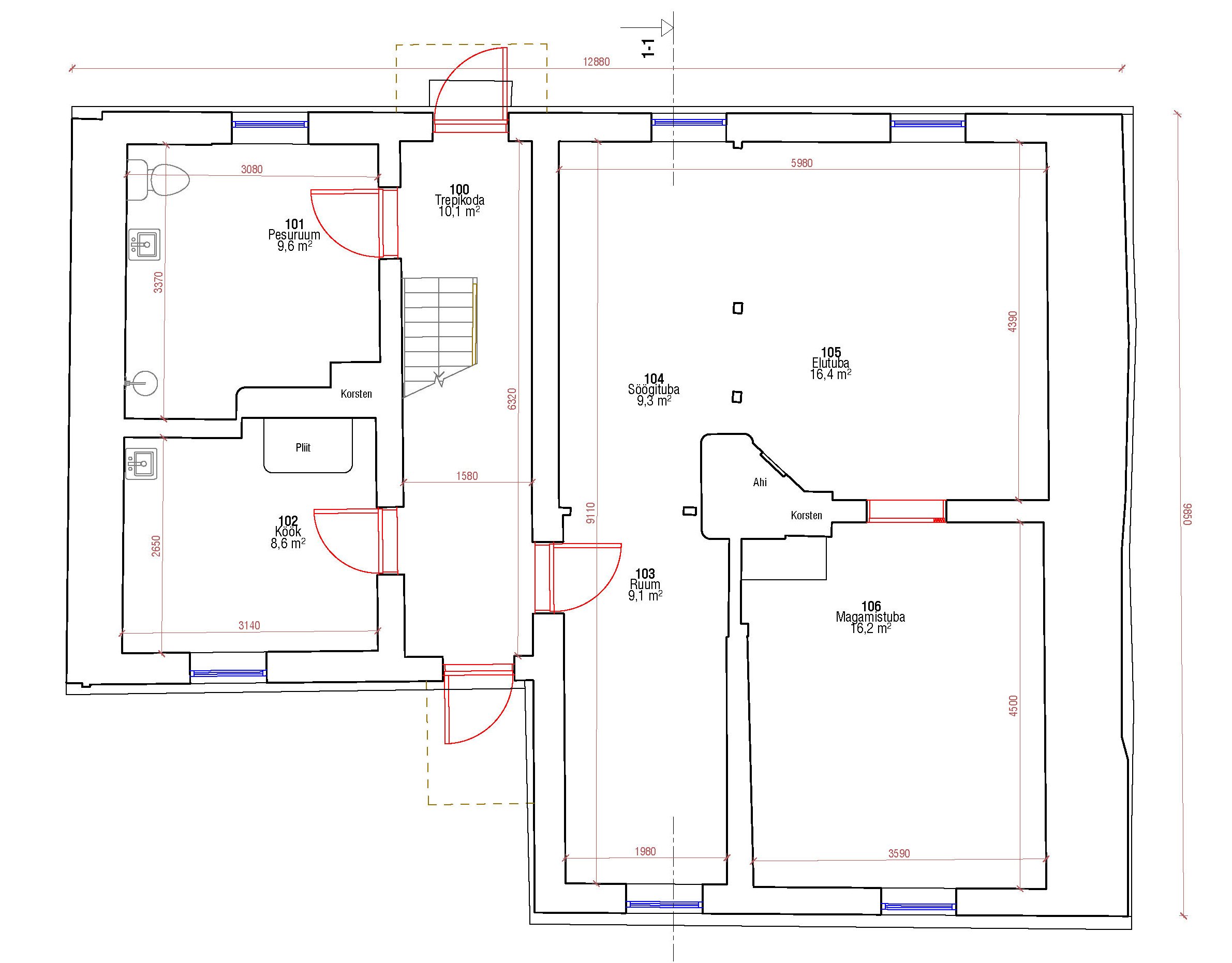 Lisatud ka joonis mõõtmetega. Tegemist maja parempoolse osaga (ruumid nr 103, 104, 105, 106). Väljakaeve vaja teostada ruumides nr 104, 105, 106, piikamine ruumis nr 103. Tegelikkuses seal ühtegi eraldiseisvat tuba ega ruumi pole, maha on võetud kõik vaheseinad, sealhulgas korsten ja ahi. Seega tegemist ühe suure tühja ruumiga.