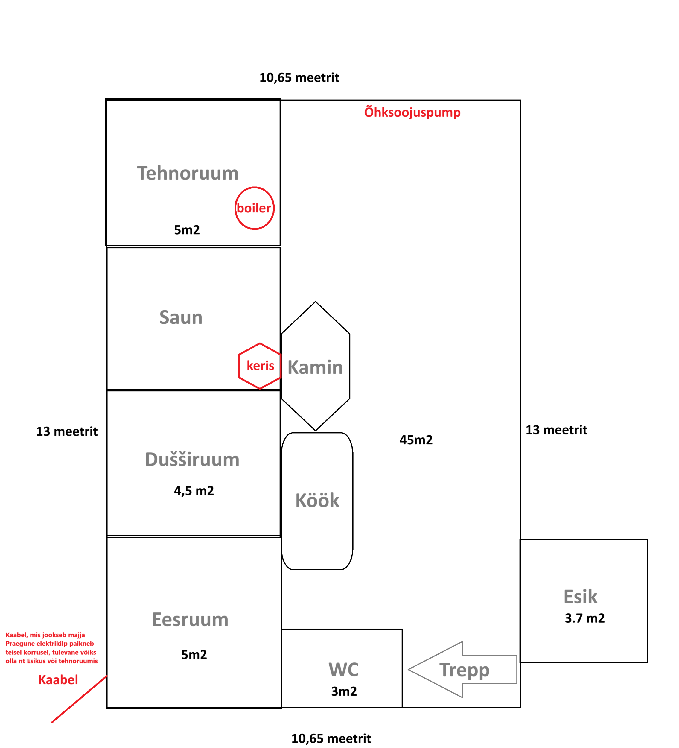 Tere! Elektritööde teostus sauna esimesel korrusel. Põrandaküttekaablite paigaldus 6 erinevat. Väiksed ruumid üksikud kütted ja kaminasaal kaks erinevat. Kaablite paigaldus vastavalt jutule. Paigaldus seina ja lae peale.Päiksepaneelide ja energiasalvestusele kõride paigaldus nagu kommenteerisite. Katuseläbiviigud tihendate ise,paigaldus läbi maja või fasaadi peal selgub kohapeal. Kõride pikkus 20m, d=50mm,Töödele annan teostusjoonise ja vastavusdeklaratsioon. Uus pinnapeale kilp tehnoruumi , juba olemasoleva toitekaabli otsa. Kilbis on kaitsmed, rikkevoolukaitsmed, pealüliti ,kilbinimekiri vastavalt töö sisule. Maandusvarras elektrisüsteemile, tehnoruumist läbi seina õue.