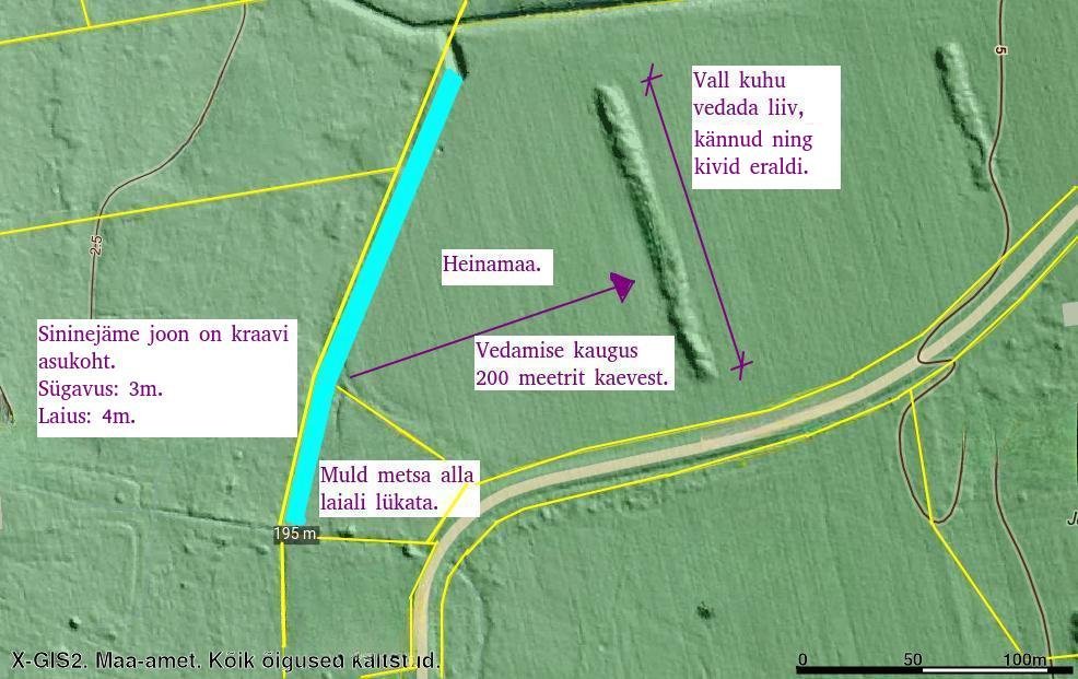 Oluline info: Kraavi piirkonnas, umbes 1 meetri sügavusel, kulgeb teadmata asukohas heinamaa kuivendustoru, mille läbimõõt on umbes 10-20 cm ja kogupikkus ligikaudu 100 meetrit. Lisaks liituvad sellega risti veel 5-10 kuivendustoru iga 10-20 meetri tagant. Kaevetööde käigus on vaja need torud paljastada ja otsad puhtaks jätta, et hiljem oleks ise võimalik nende ümber rajada kaldakindlustus kivide ja tsemendi abil. Kraavi lähedane heinamaa peab säilitama oma kuivenduse.