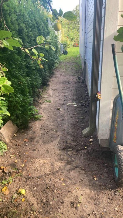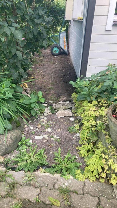 Maja 2-le küljele teerada. Töömaht on ca 20m2. Eemaldatav pinnas jääb krundile. Meie poolt on ainult kivid, mis on juba kohapeal. Täide pakkuja poolt.