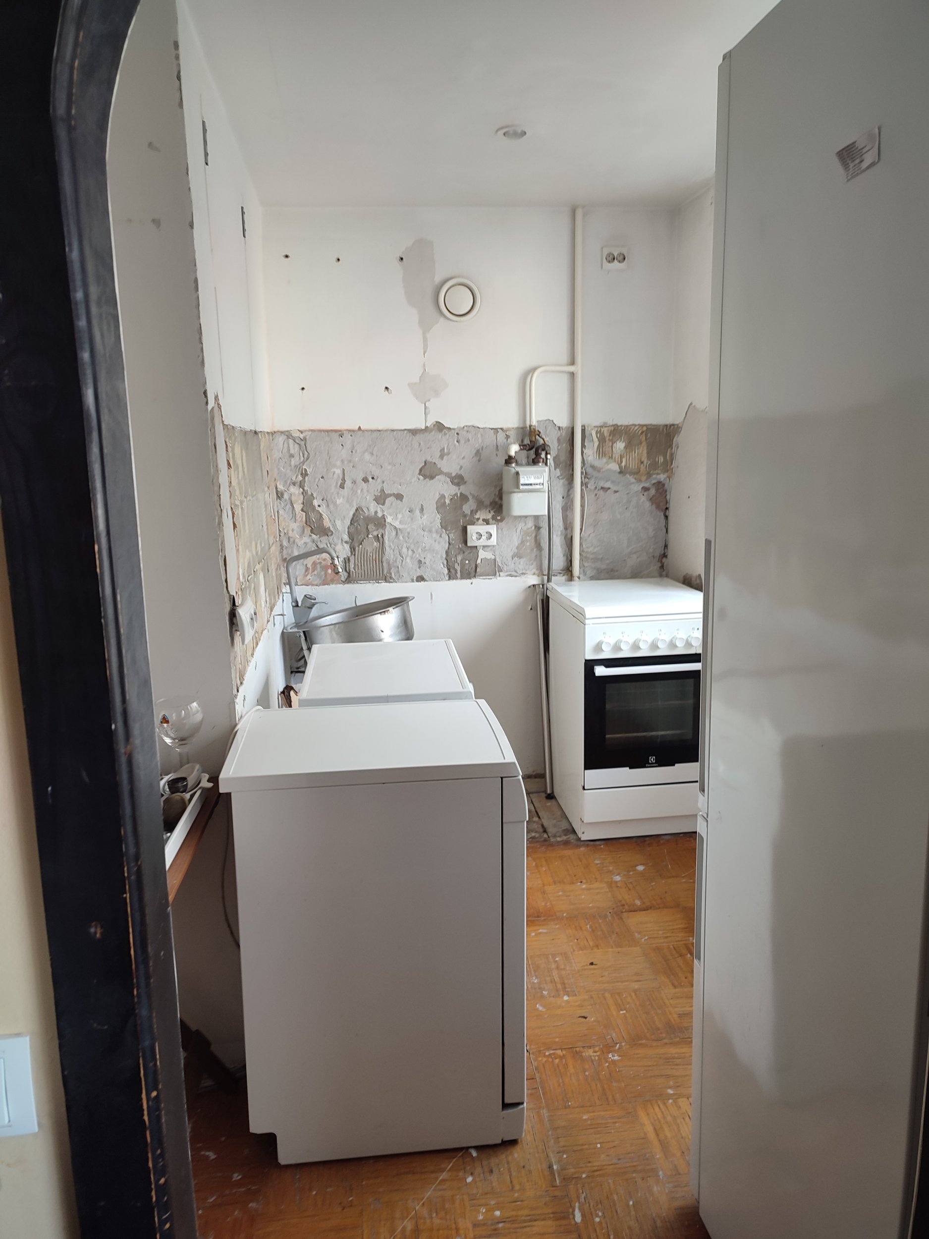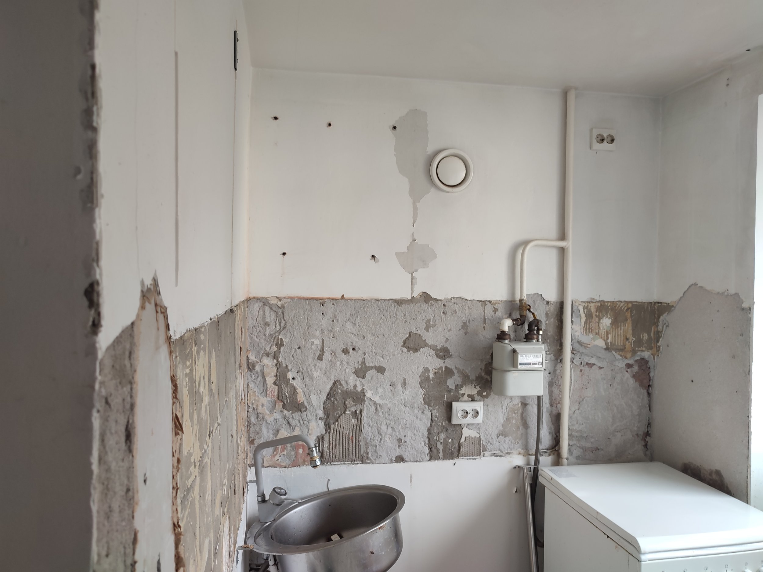 Osaliselt on lammutustööd tehtud - vana mööbel, parkett ja keraamilised plaadid seinast eemaldatud.