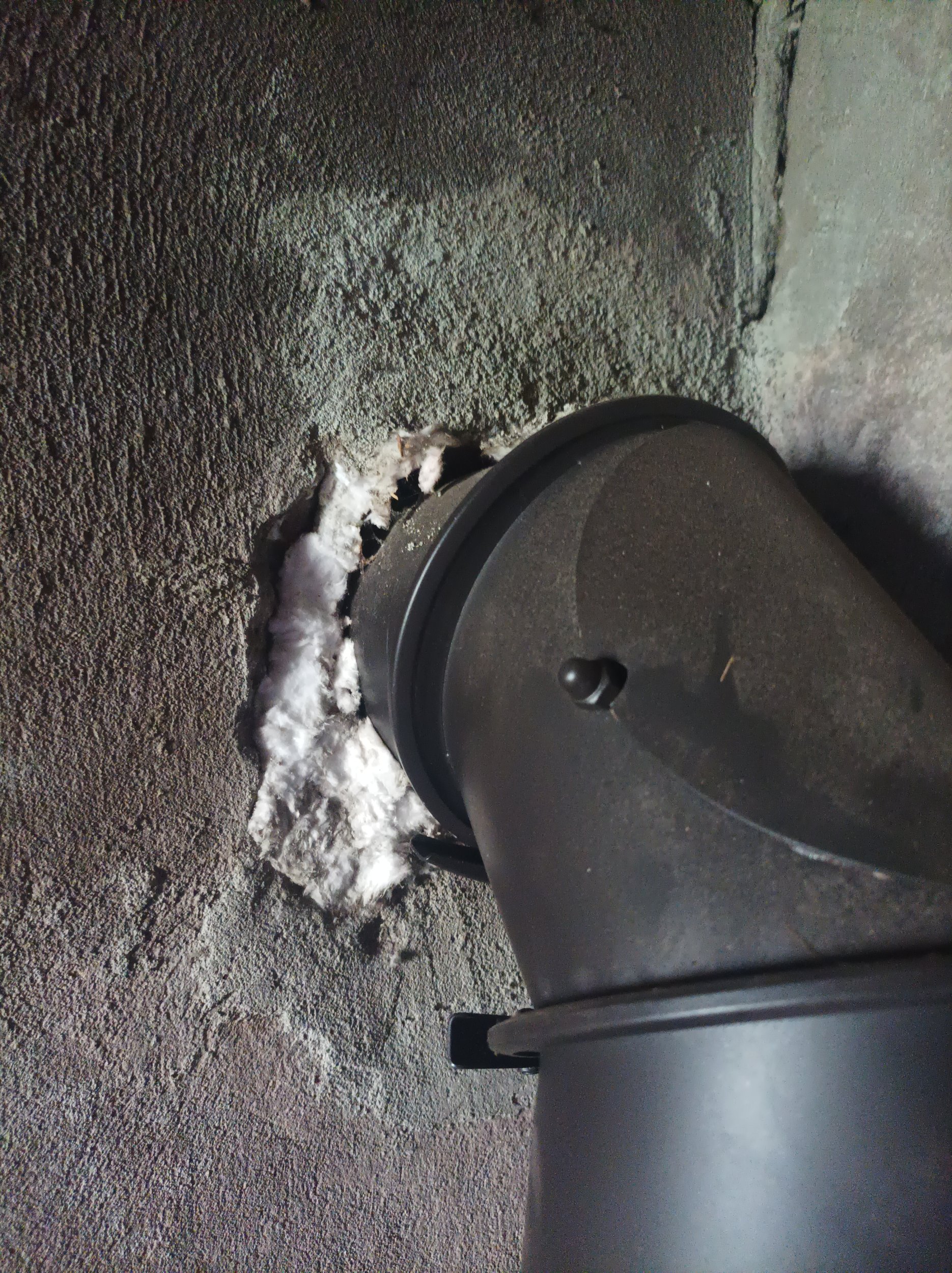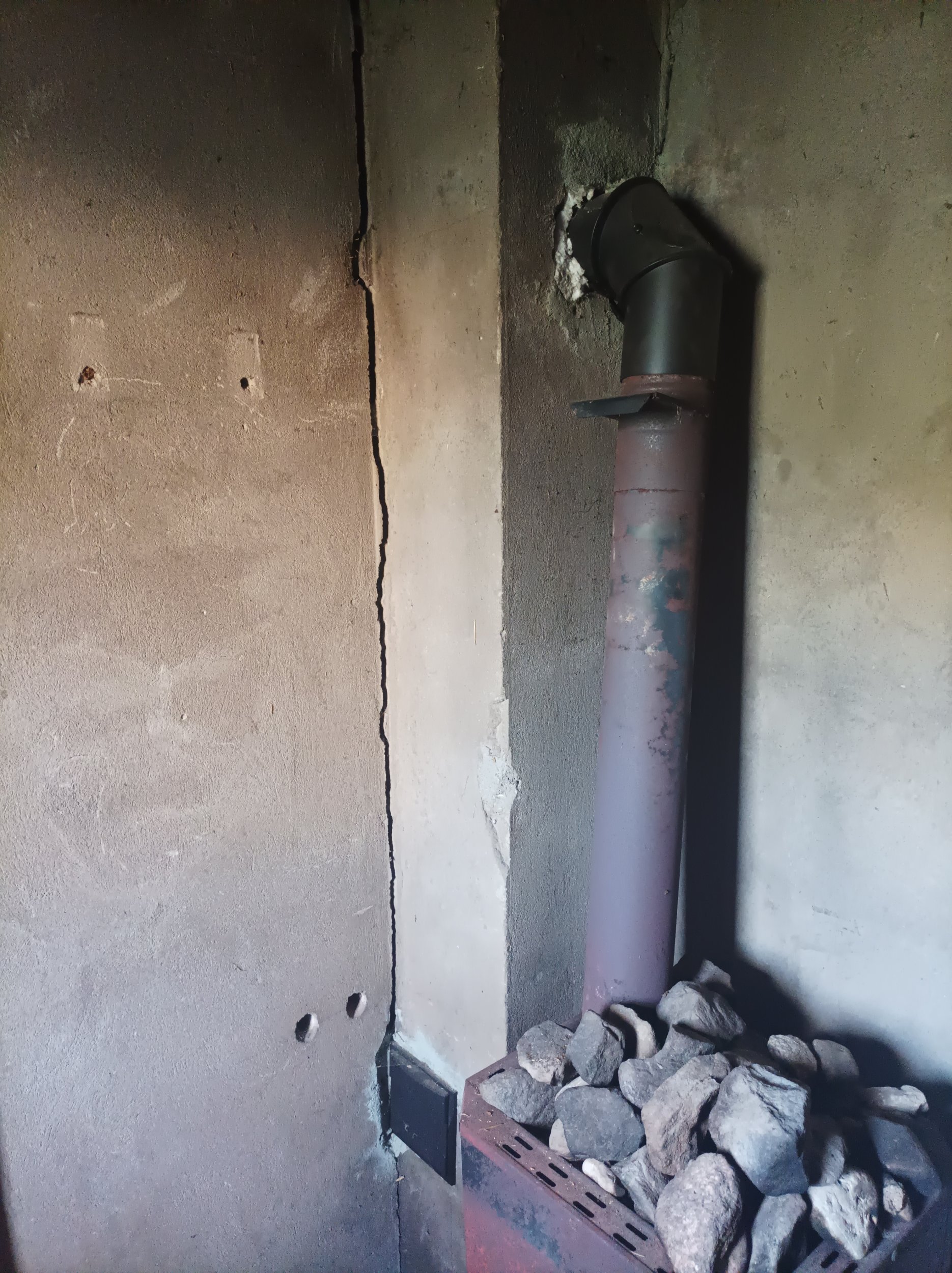 Eramaja kõrvalhoones asuvas saunaruumis on vaja teha seguga natuke parandustöid. Kerisest tuleva toru juurest, mis läheb korstnasse, on segu ära tulnud - see vahe oleks vaja ära parandada. (Näha ka pildil). On paar aastat tagasi juba parandatud, kuid see vahend, mida sinna on pandud, on juba osaliselt ära pudisenud.