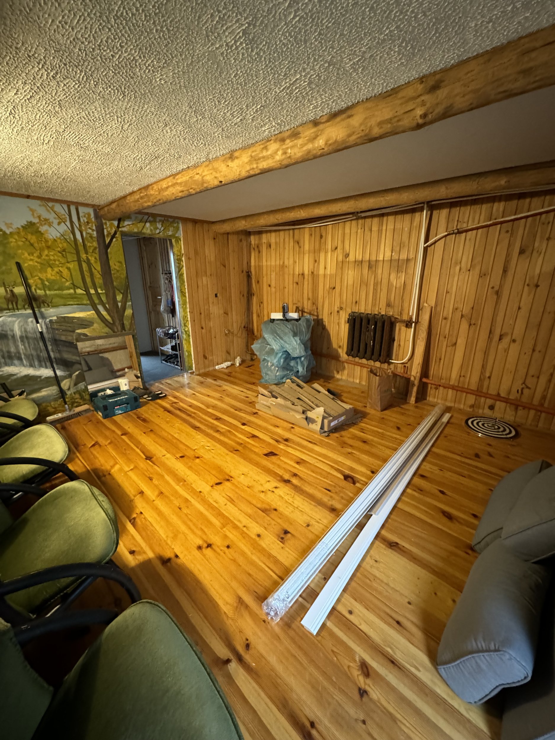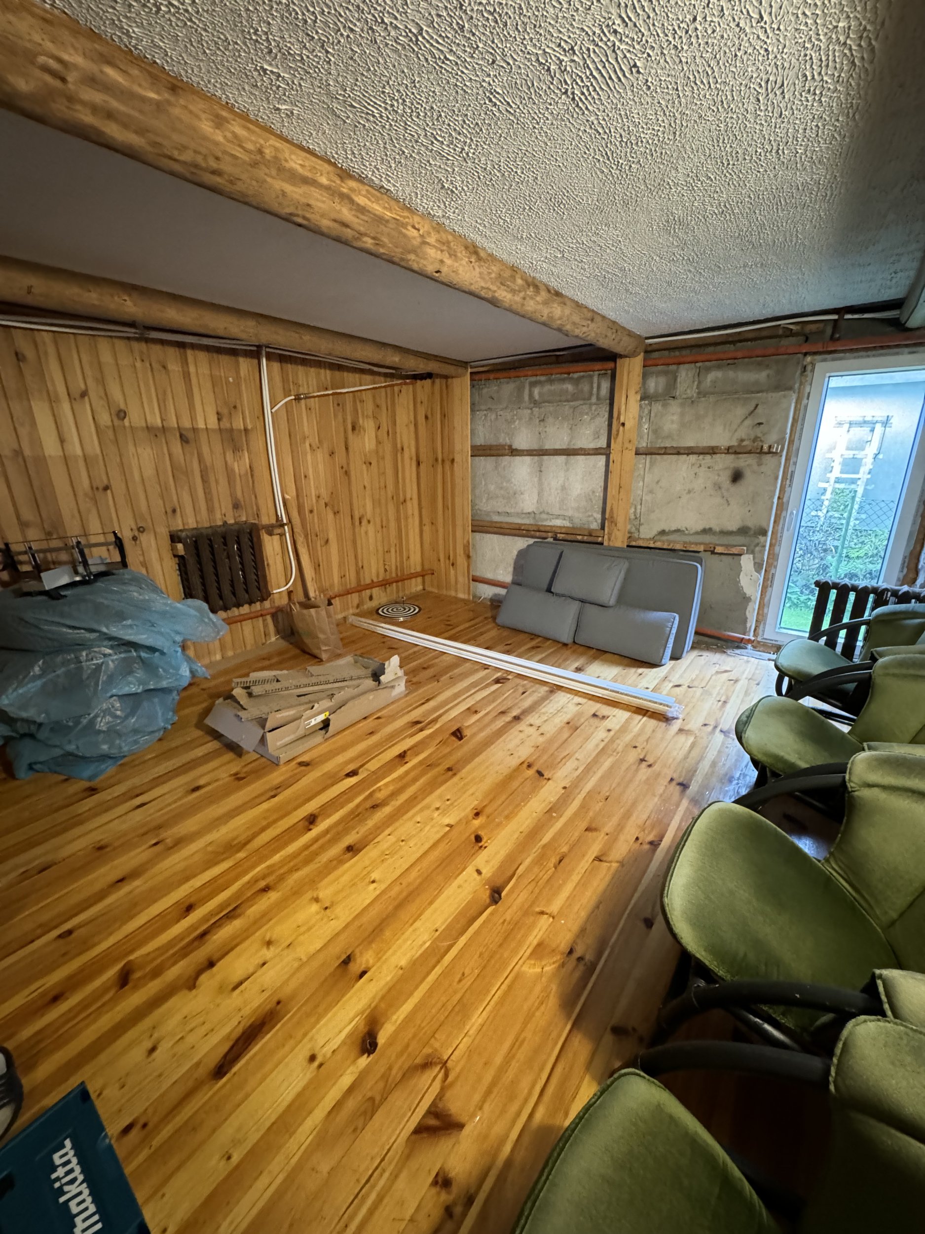 Tuba on vaja siseviimistlusest tühjaks teha, et jääks alles nö karp. Seinast kogu puit minema ja põrandalauad samuti. Kõik, mis põranda alt välja tuleb, on vaja samuti ära võtta. Ära on vaja võtta ka pistikud ja lampide ühendused, seega peab töömees ka elektriga tegelema. Hetkel on pistikutes vool sees. Radikad on tõenäoliselt töö alguse ajaks eemaldatud ja pimedad torudele ette pandud, seega radikaid vähemalt praeguse info valguses eemaldada ei ole vaja. Laest ka puidud ära. Seega, tuba täiesti tühjaks.