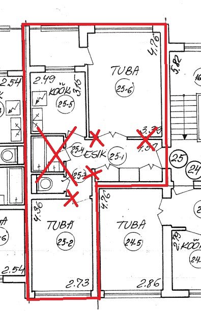 * Korteri põrand jääb alles. Osaliselt on vaja tasandada. Esiku põrand on plaaditud, plaadid on vaja üles lõhkuda.