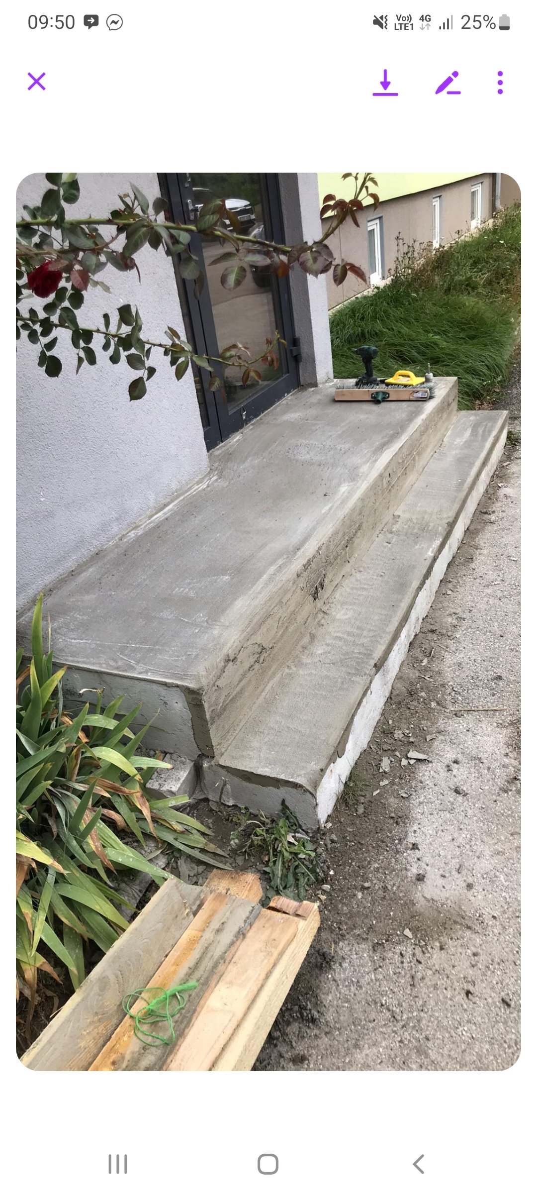 Antud treppidele peale valesti valatud, oleks vaja natuke õhemaks teha ja üle valada nii et mõrasid ei tuleks ja haripind oleks uksega samas suunas mitte küljepeale. Seejärel küljed ja ninaotsad teha CM 17 seguga üle. Kohal saalungimaterjal ja CM 17 olemas külgedele ja ninaotsala